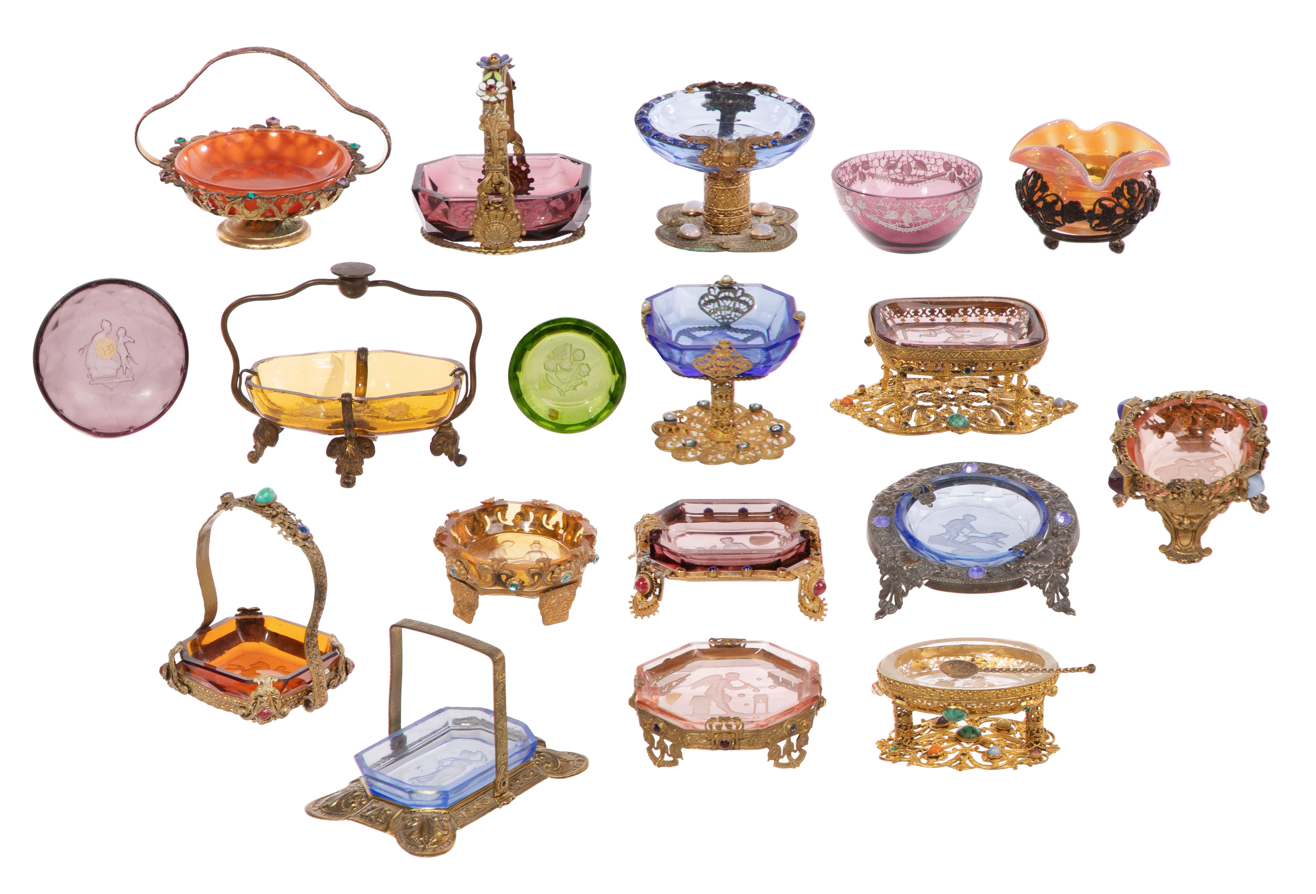 (18) items including some glass, jeweled, gilt and brass holders, intaglio glass open cellars, some having ‘Made in Czechoslovakia’ mark, one having spoon