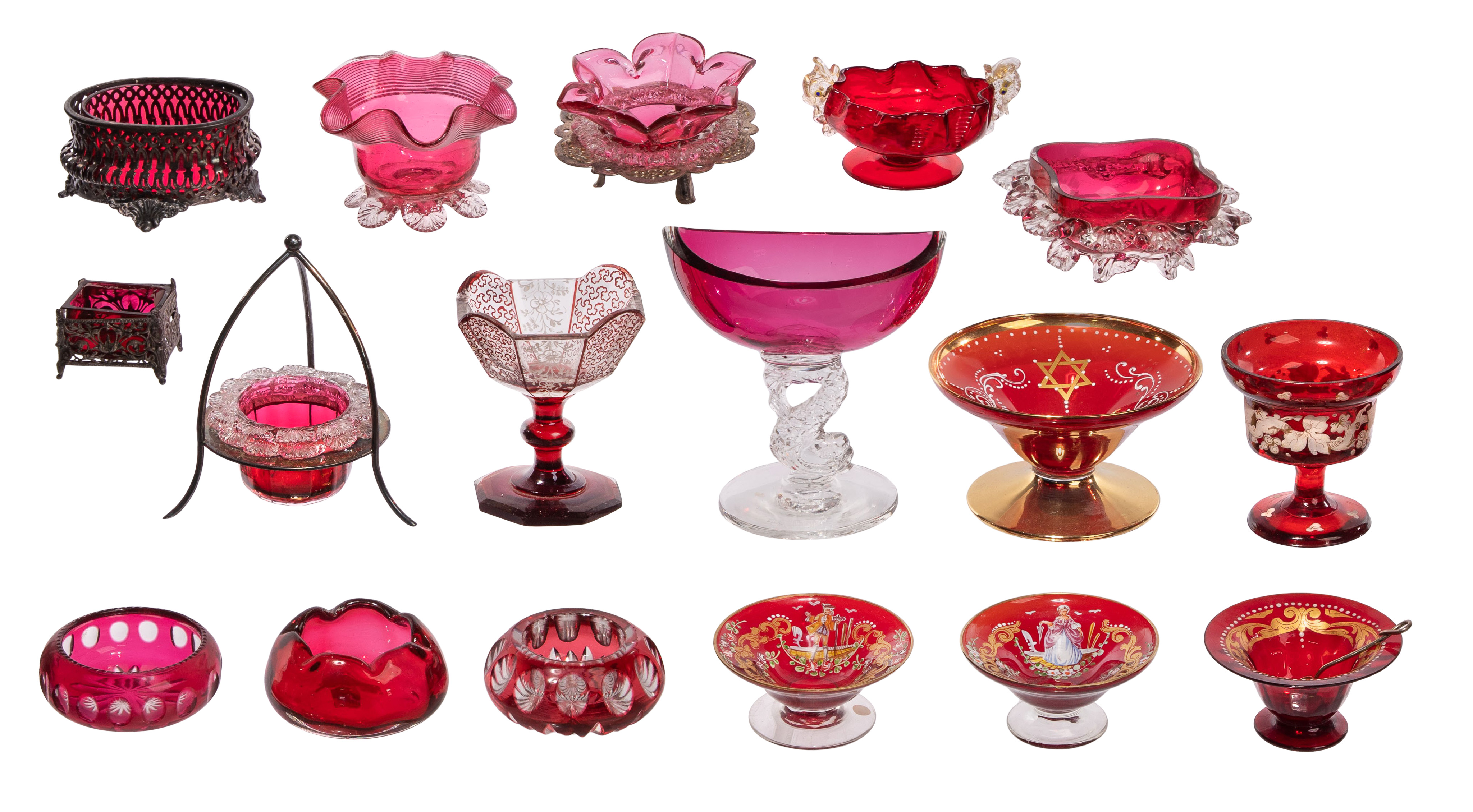 (17) items of various shapes, sizes, hues and materials including Moser style, English ruffles, cut-to-clear and Murano, one having spoon