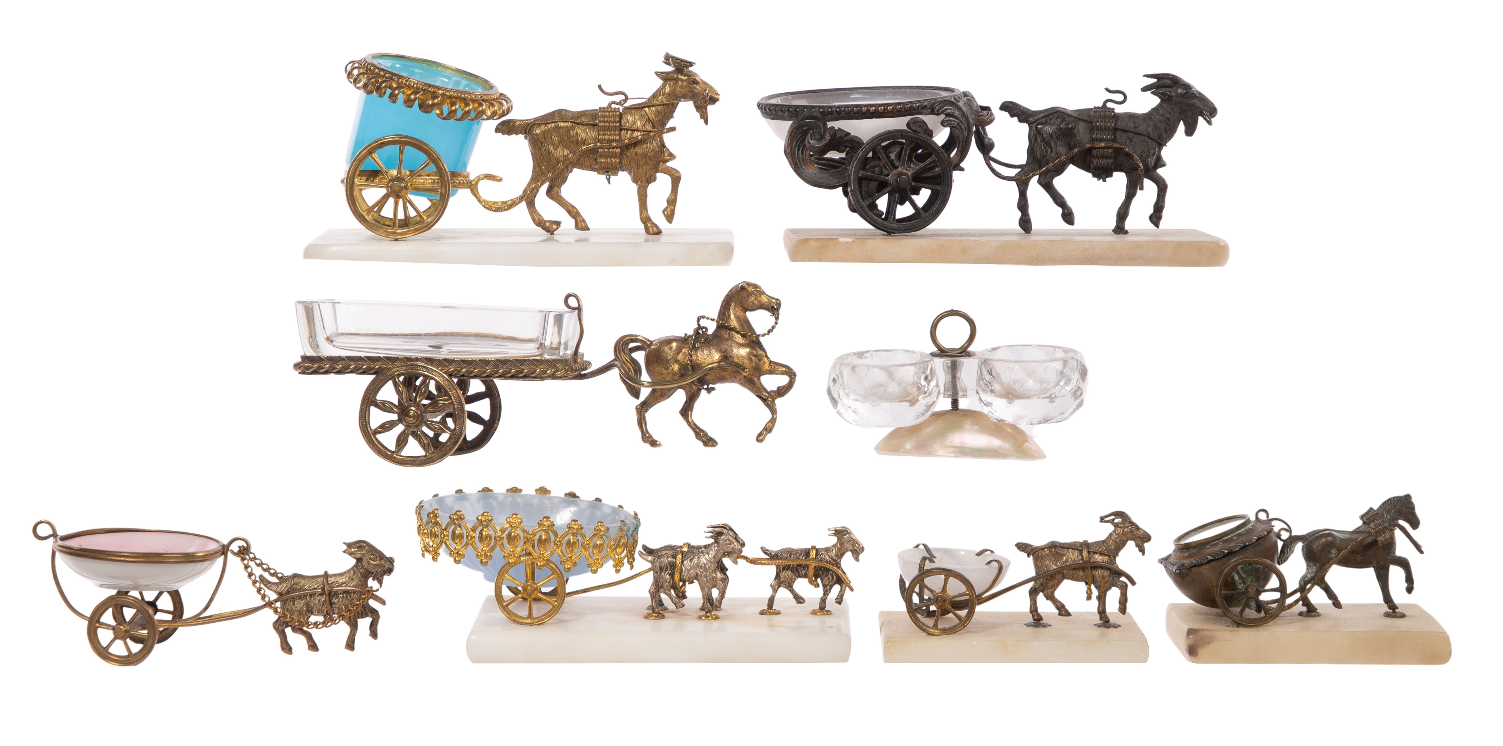 (8) items including (7) in the form of a goat pulling a wagon, some mounted to hard stone plinths and a double open cellar mounted on mother-of-pearl shell