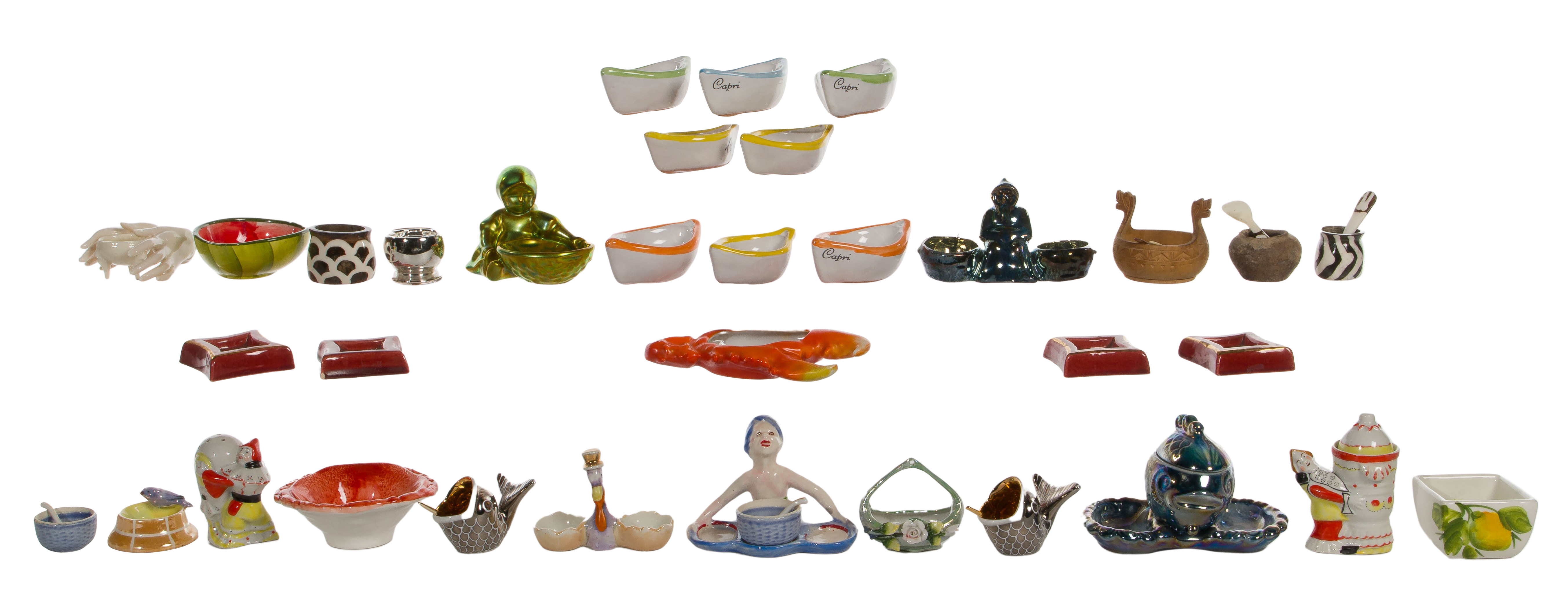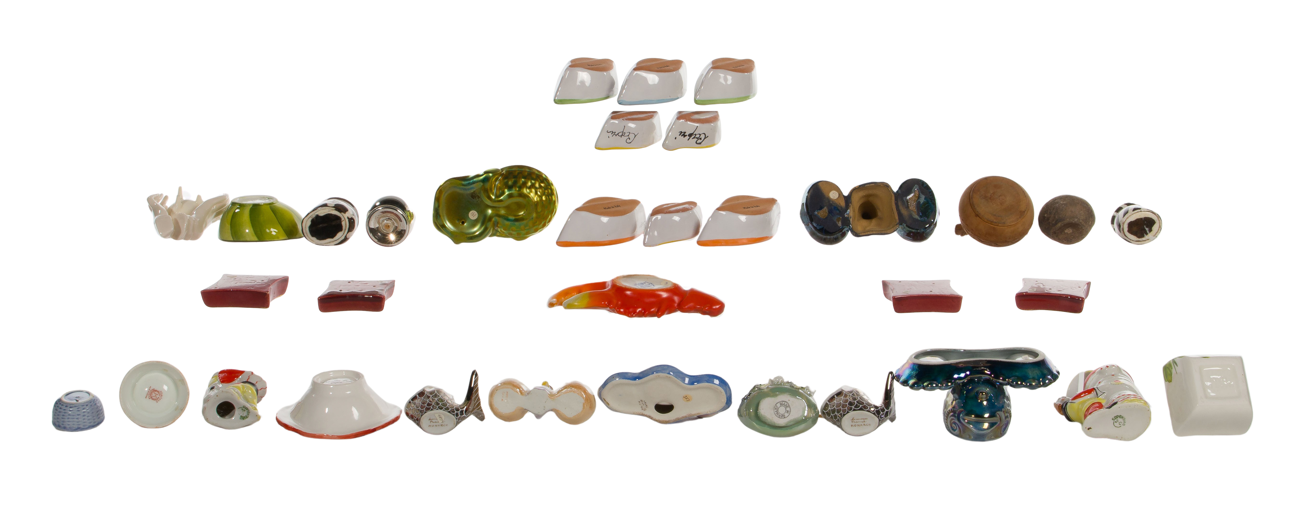 Approximately (30) items in various shapes, sizes, materials, colors and styles, including whimsical figures, fish and boats, some having marks