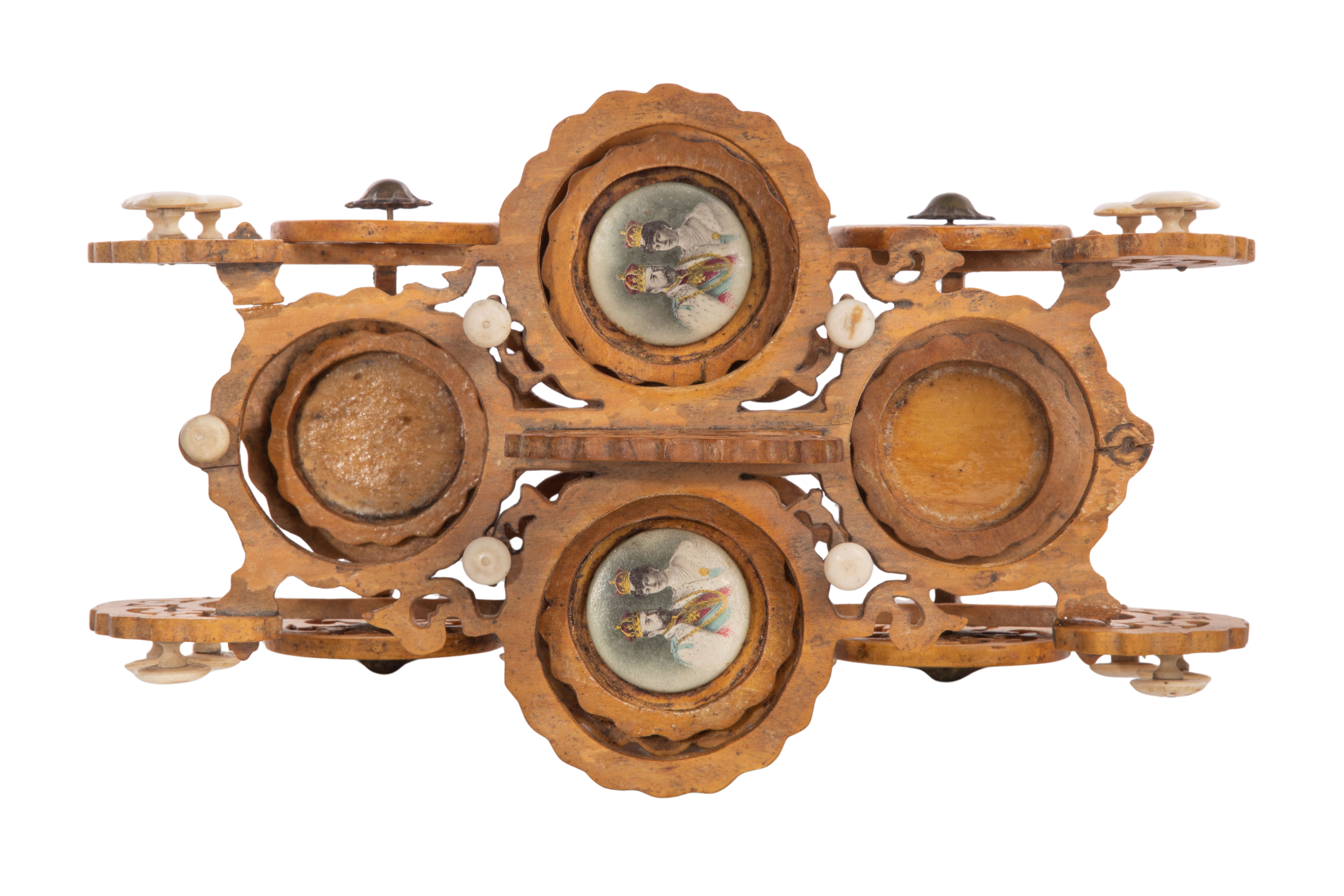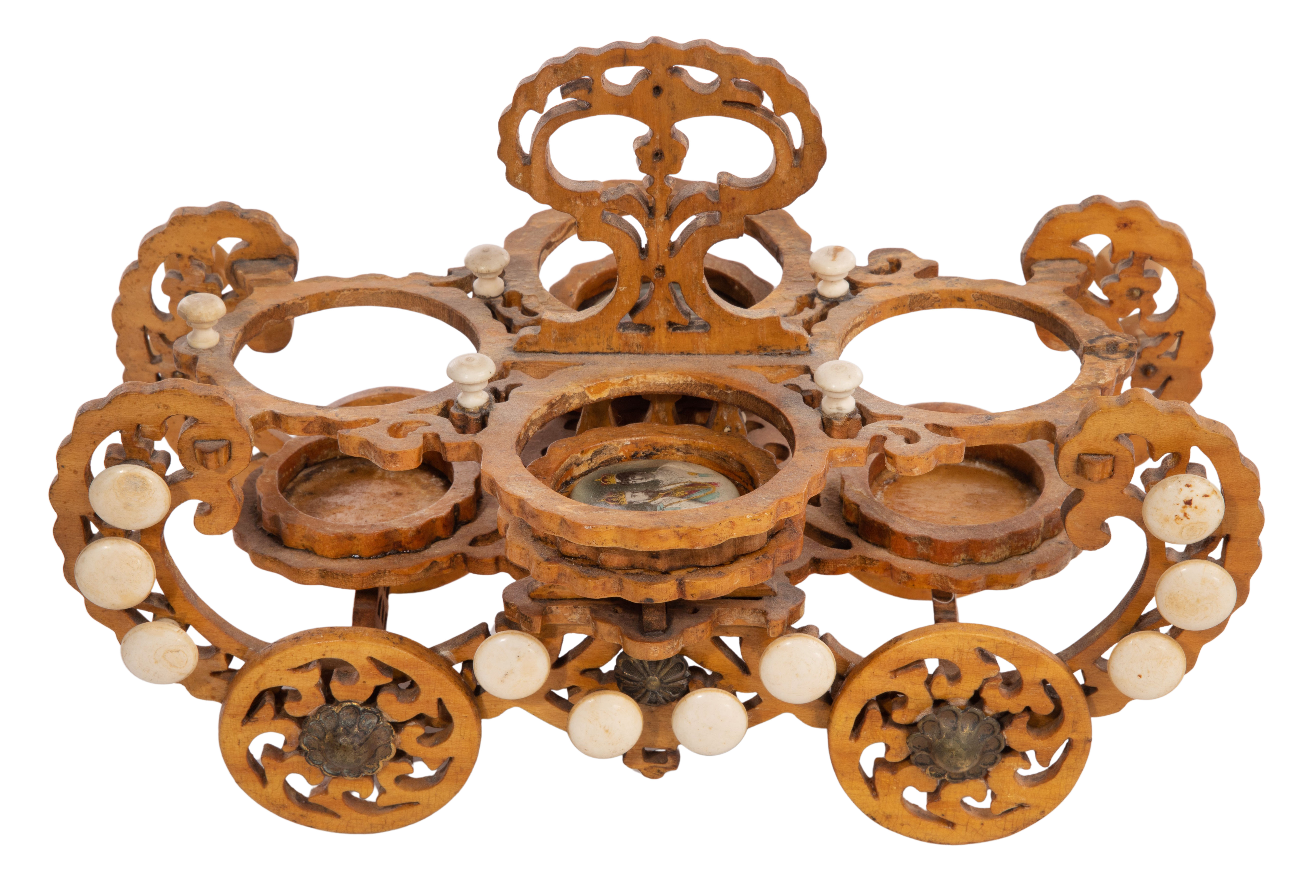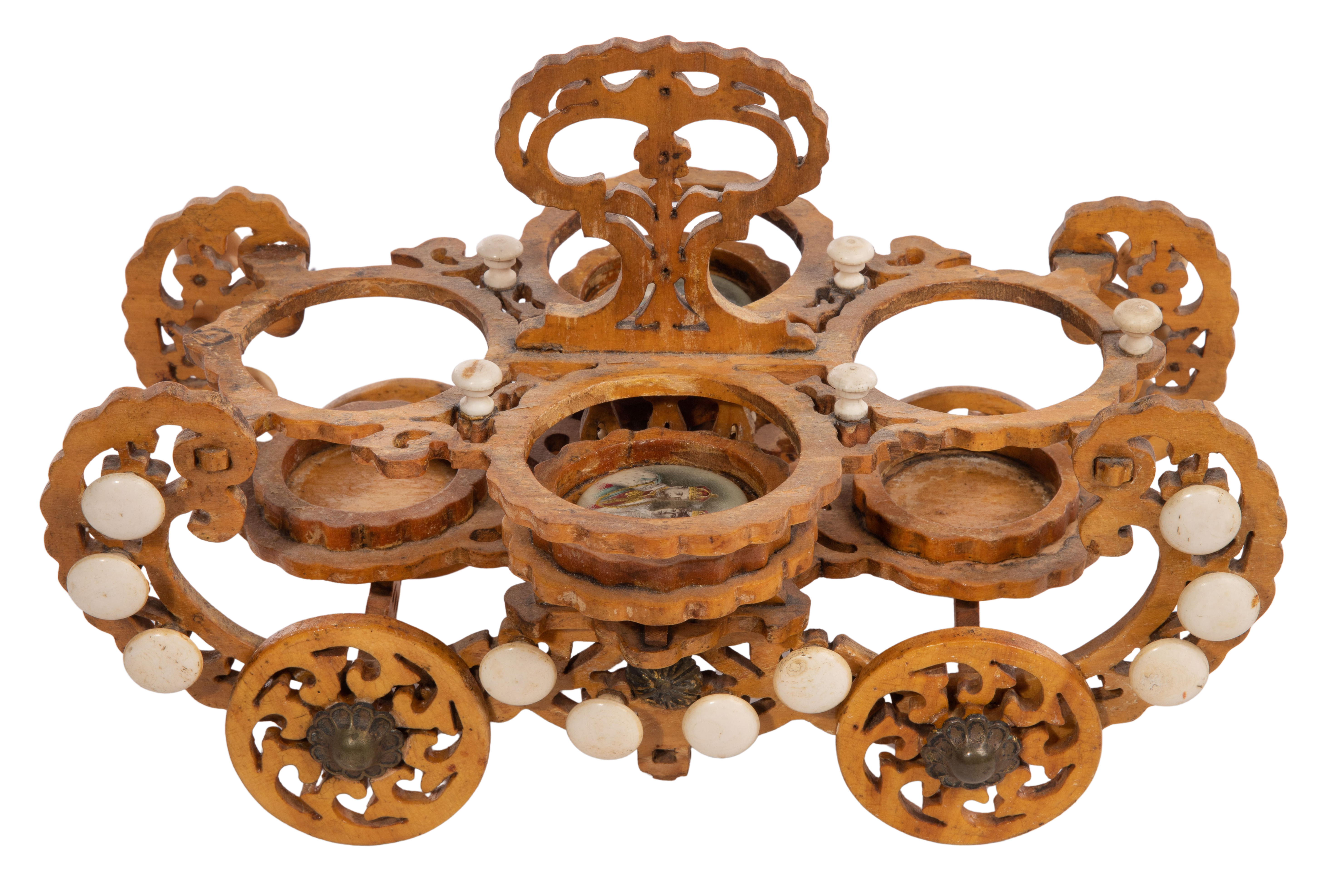 Unmarked, scroll sawn wood construction having turned bone attachments and two celluloid over offset printed buttons depicting the 1902 coronation of British King Edward VII and Queen Alexandra inserted into two of four receptacles