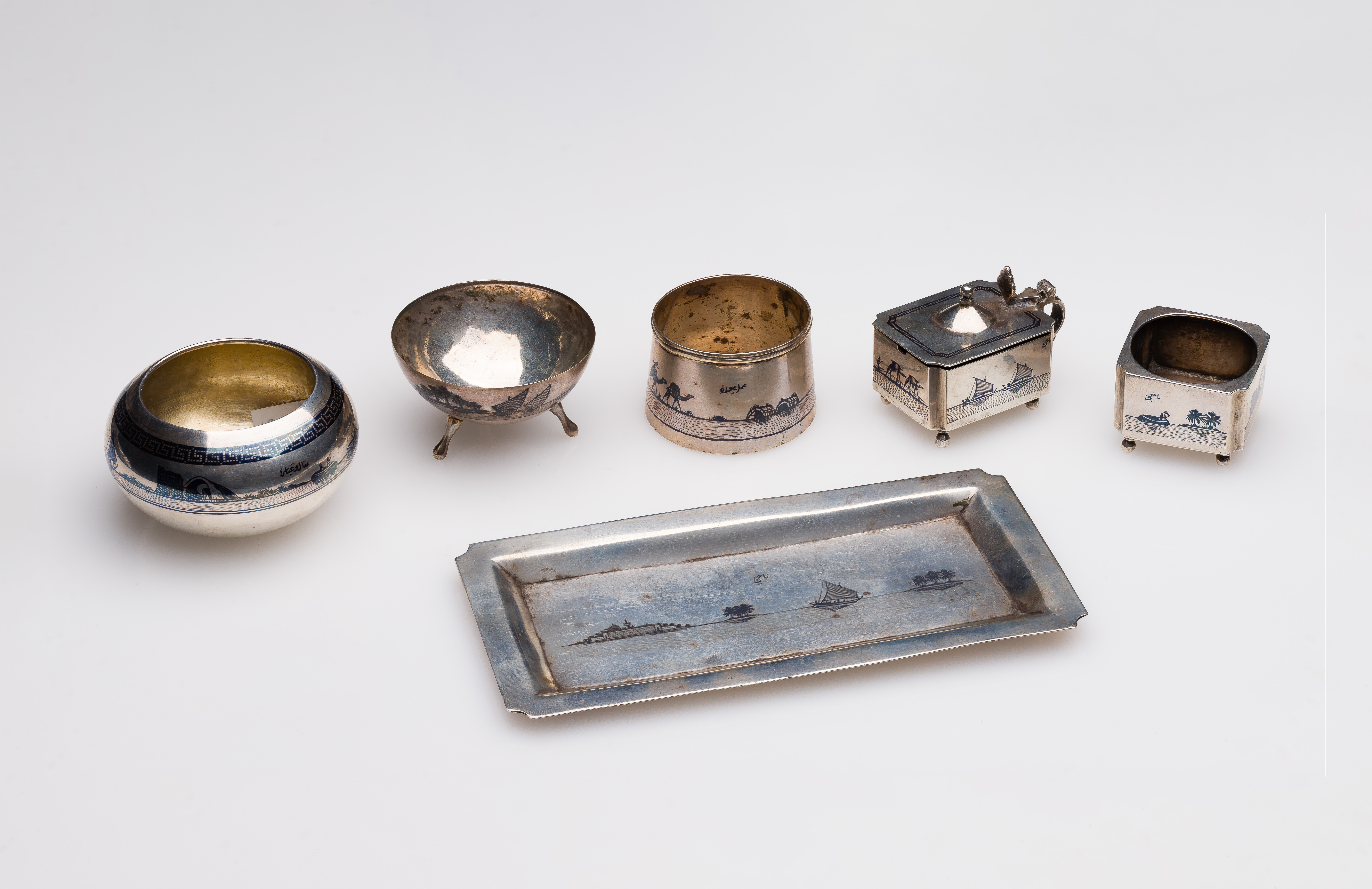 (6) items of various shapes, sizes and purposes, having niello inlays of various forms including trees, camels, boats and buildings (unmarked)