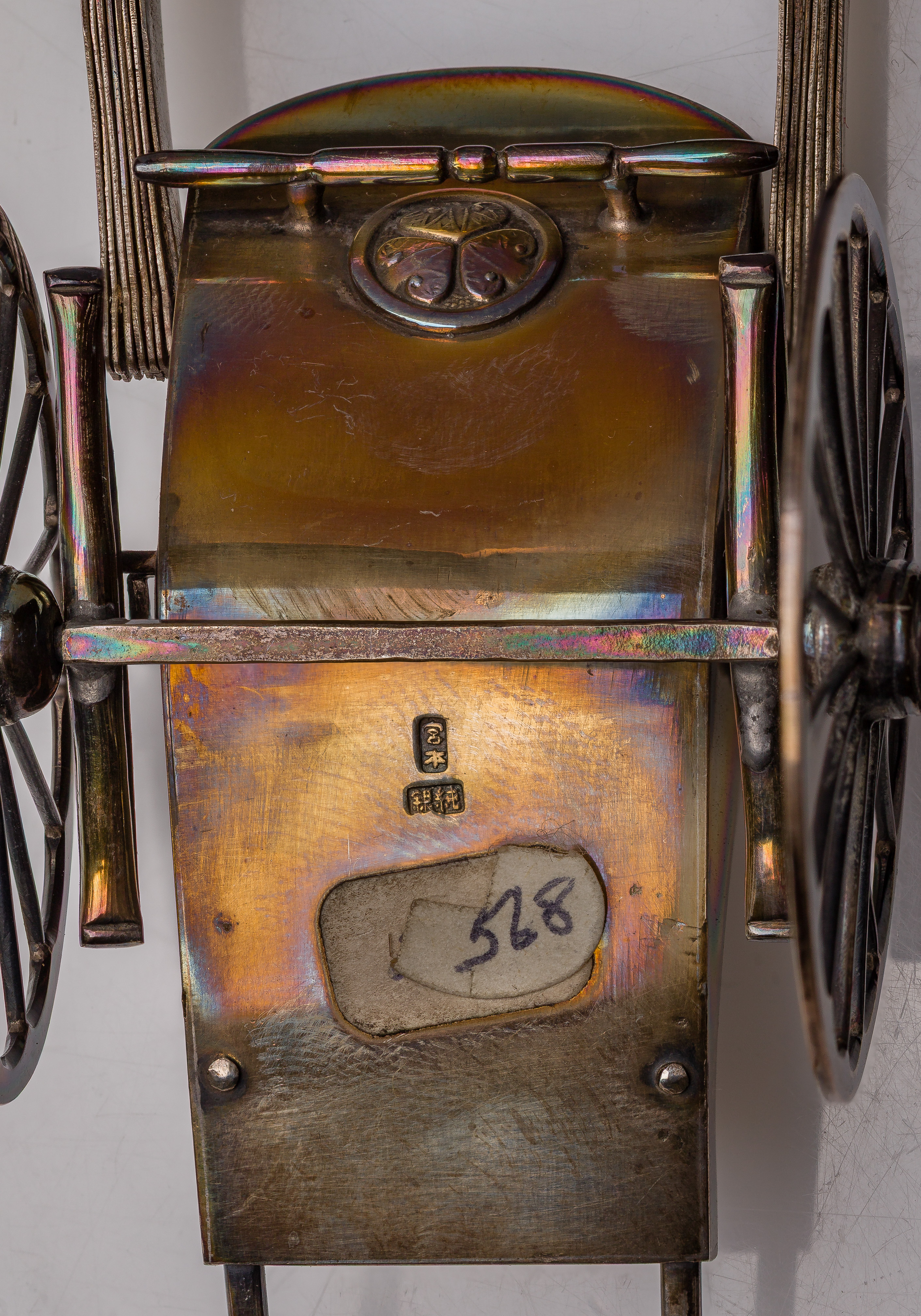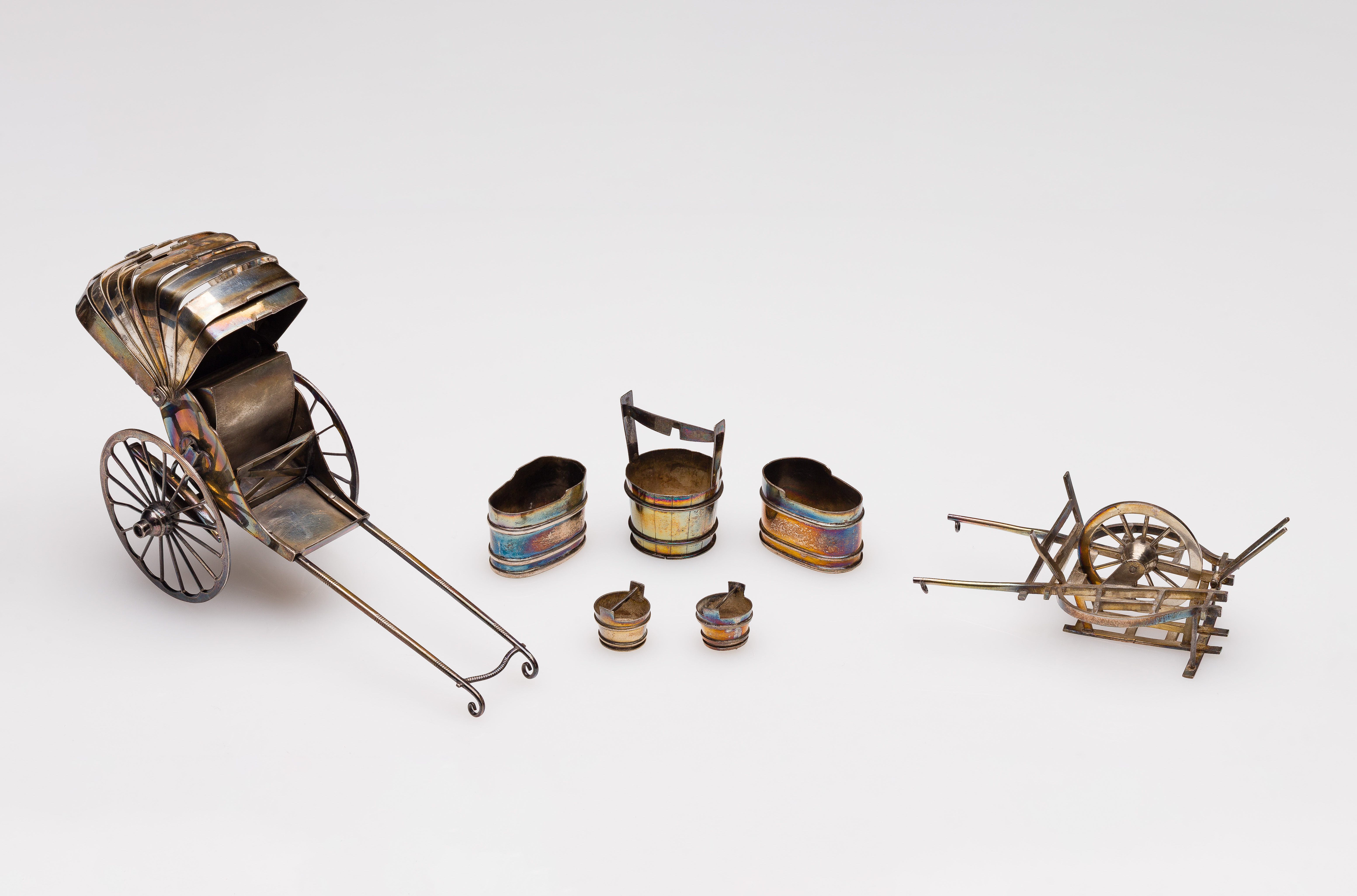 (7) items including a rickshaw having retractable canopy and movable wheels and a handcart as well as (5) condiment caddies, most having Chinese character hallmarks (unmarked 925)