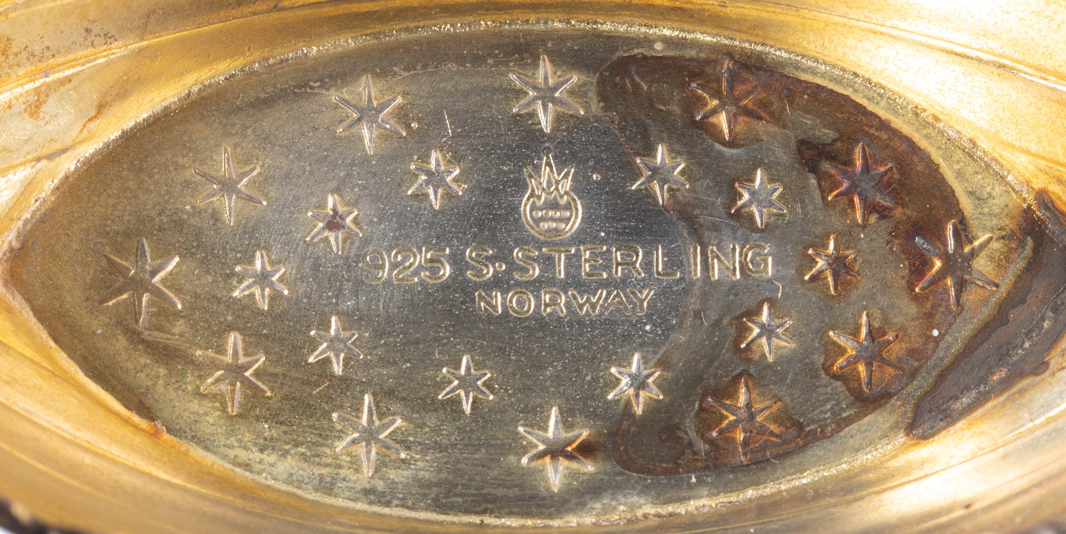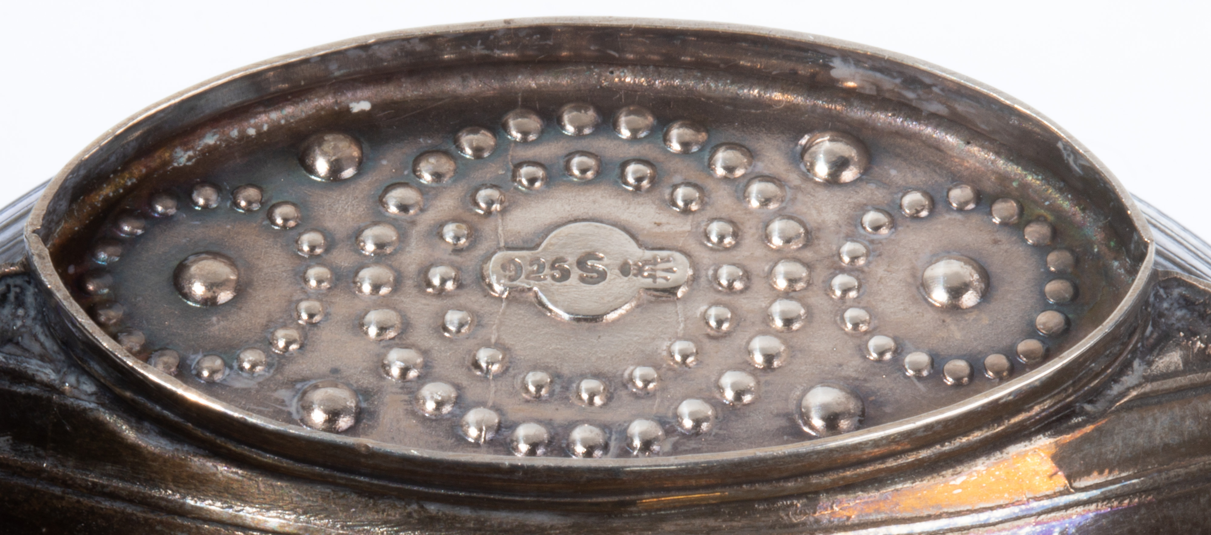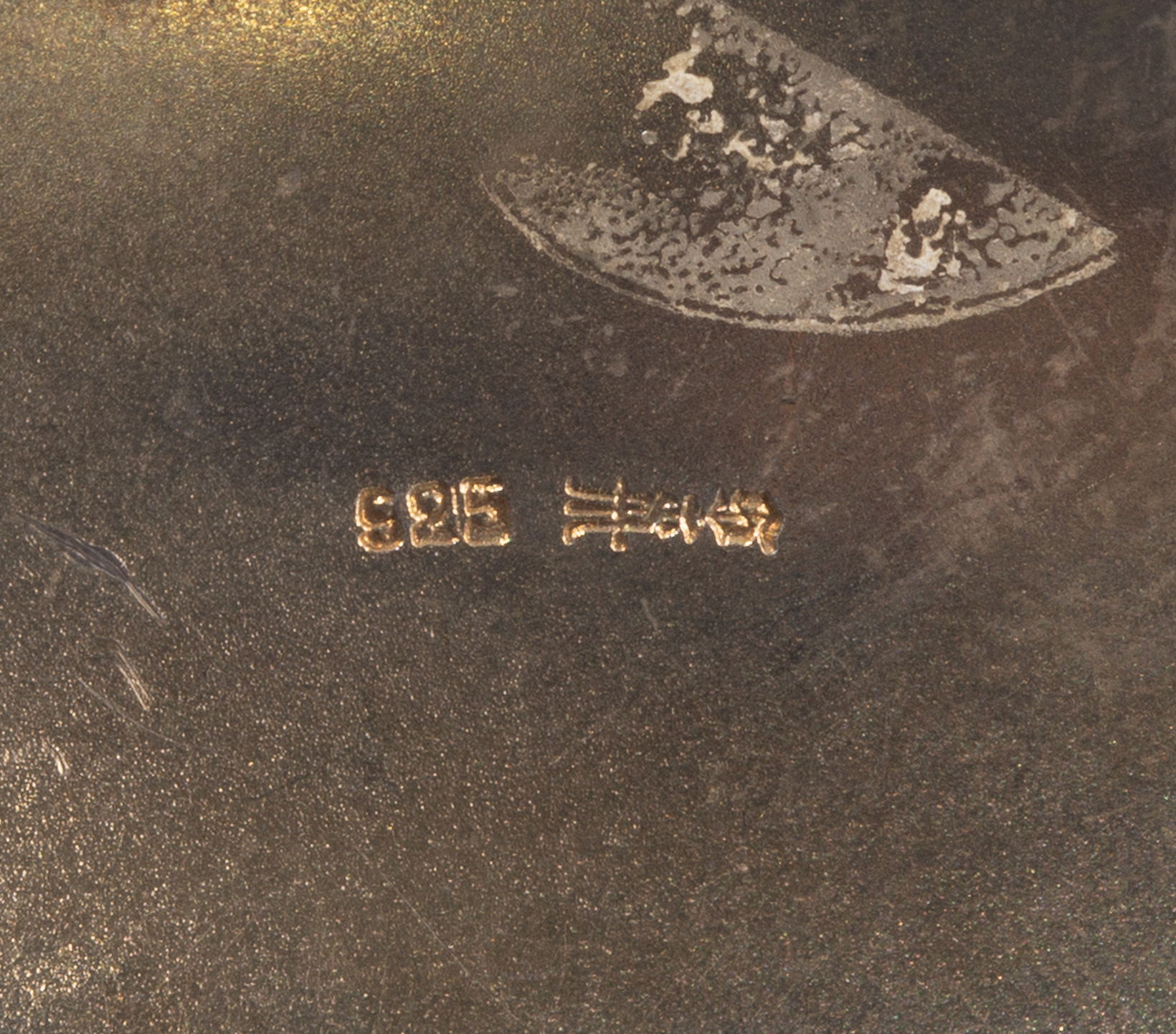 Weight: .925 silver: 5.40 ozt., .900 silver: 0.58 ozt., .830 silver: 0.32 ozt. (total without inserts, 0.875 shown as 0.830 silver)