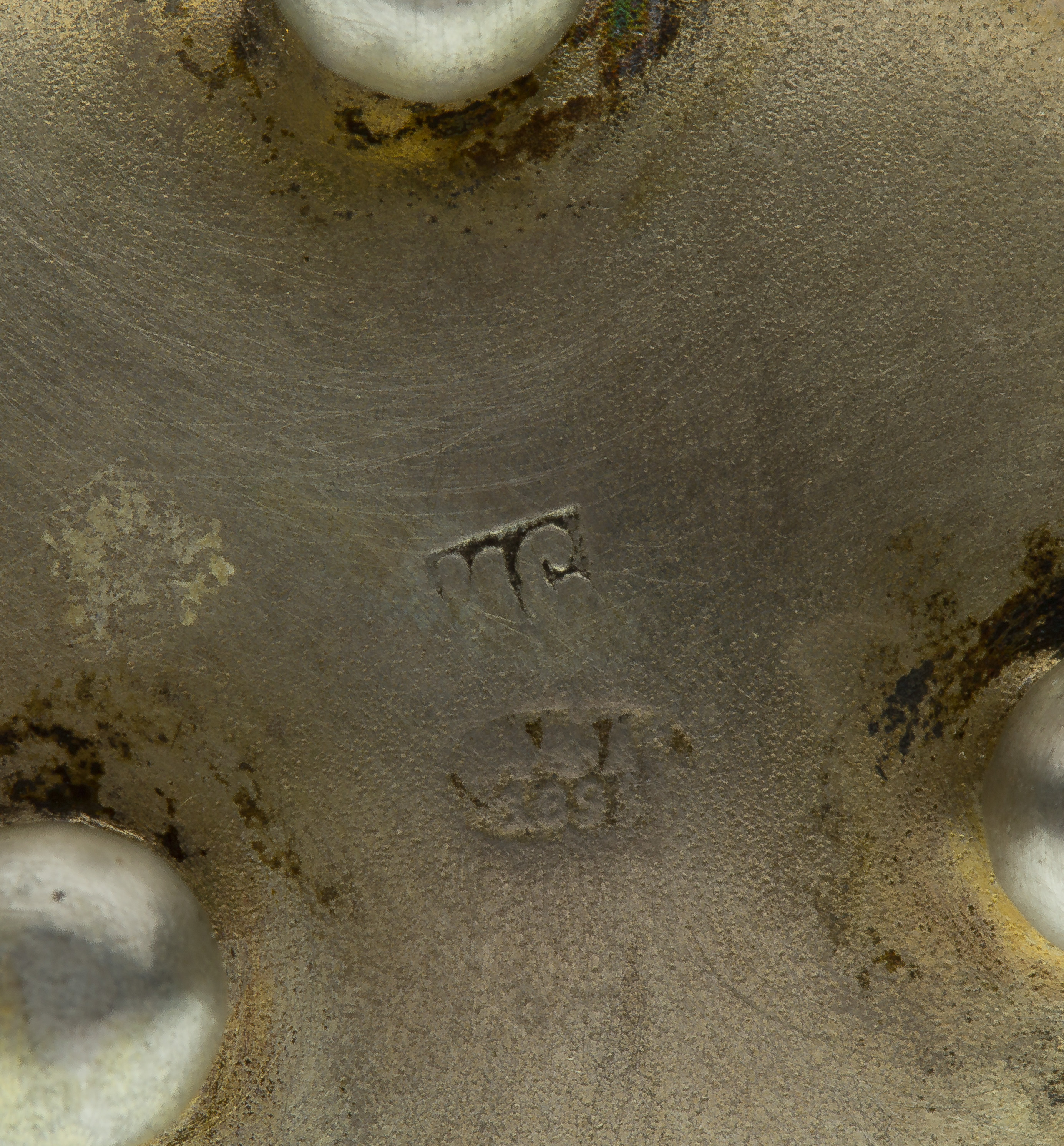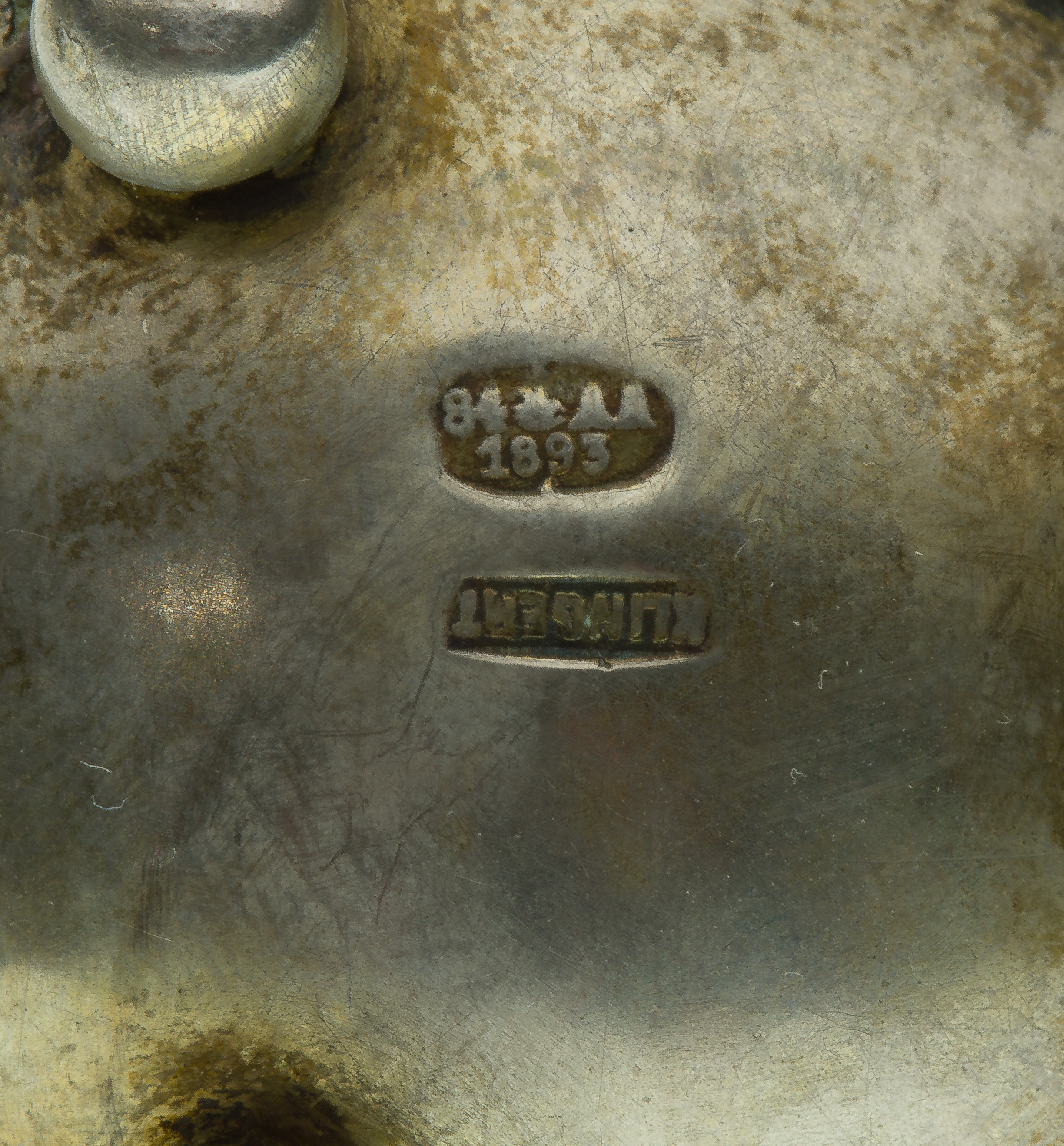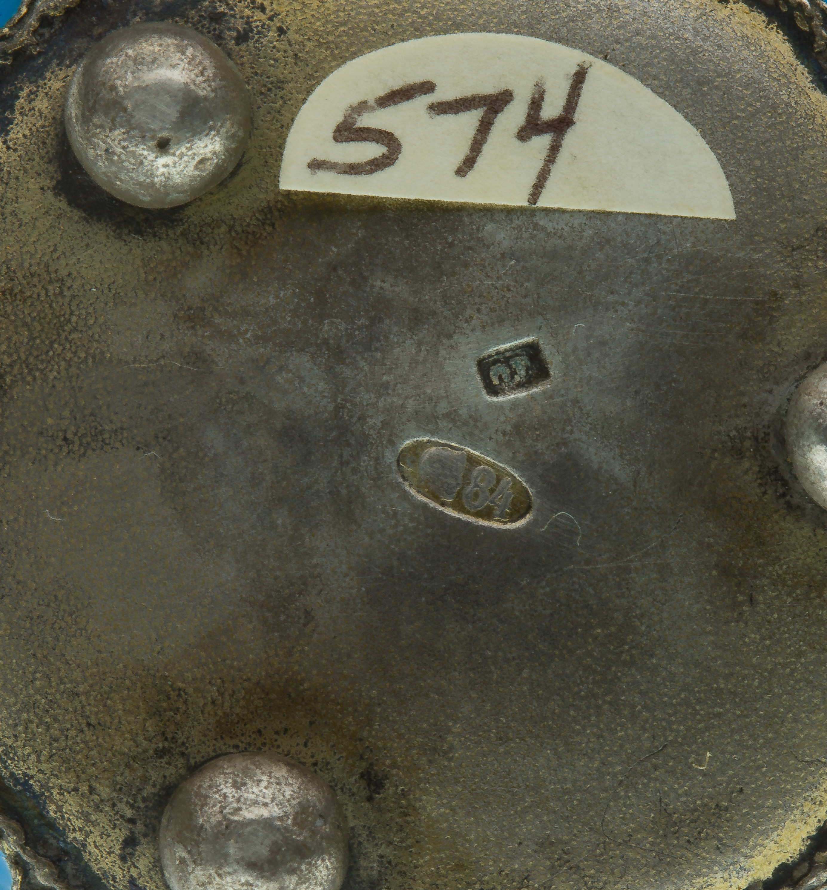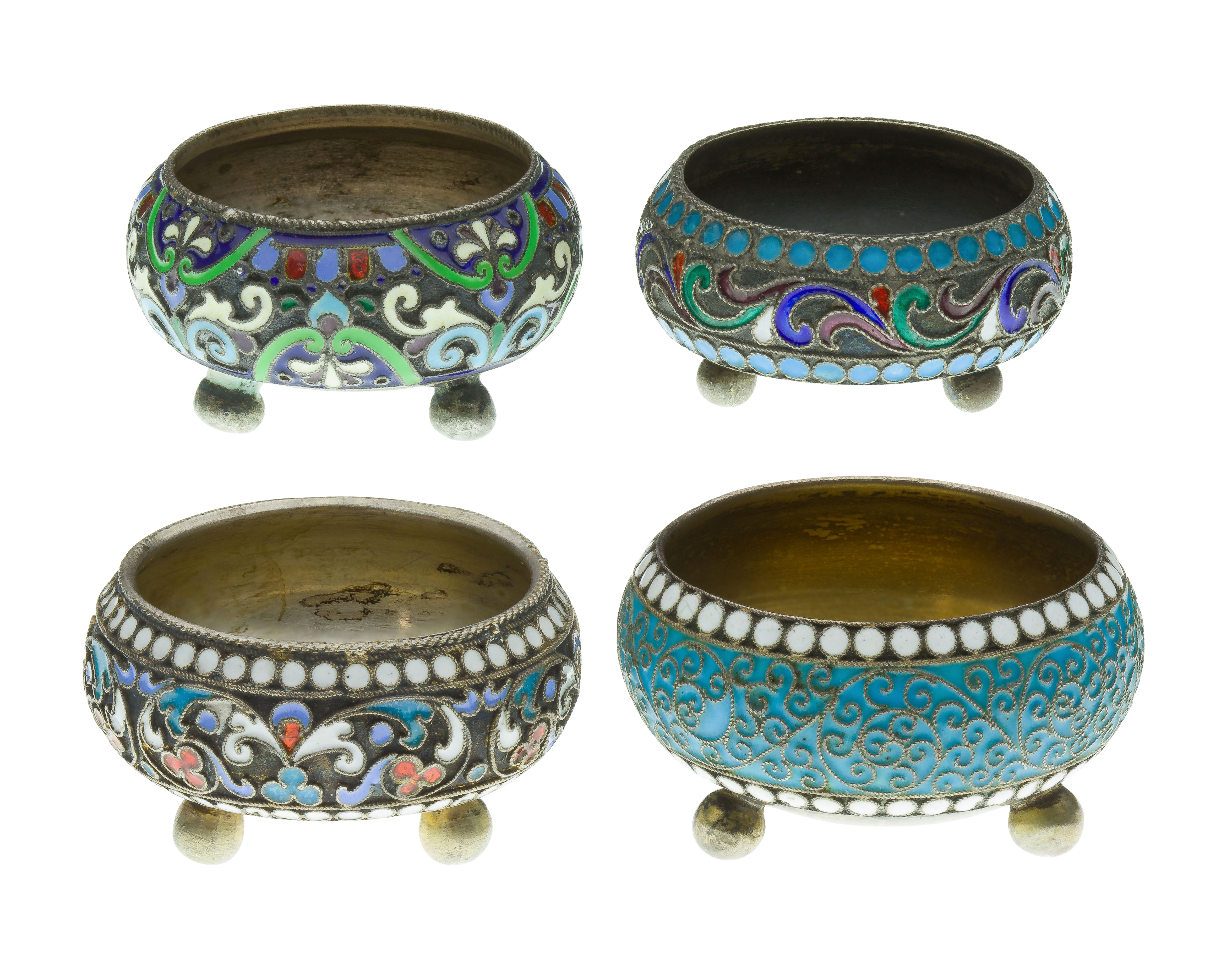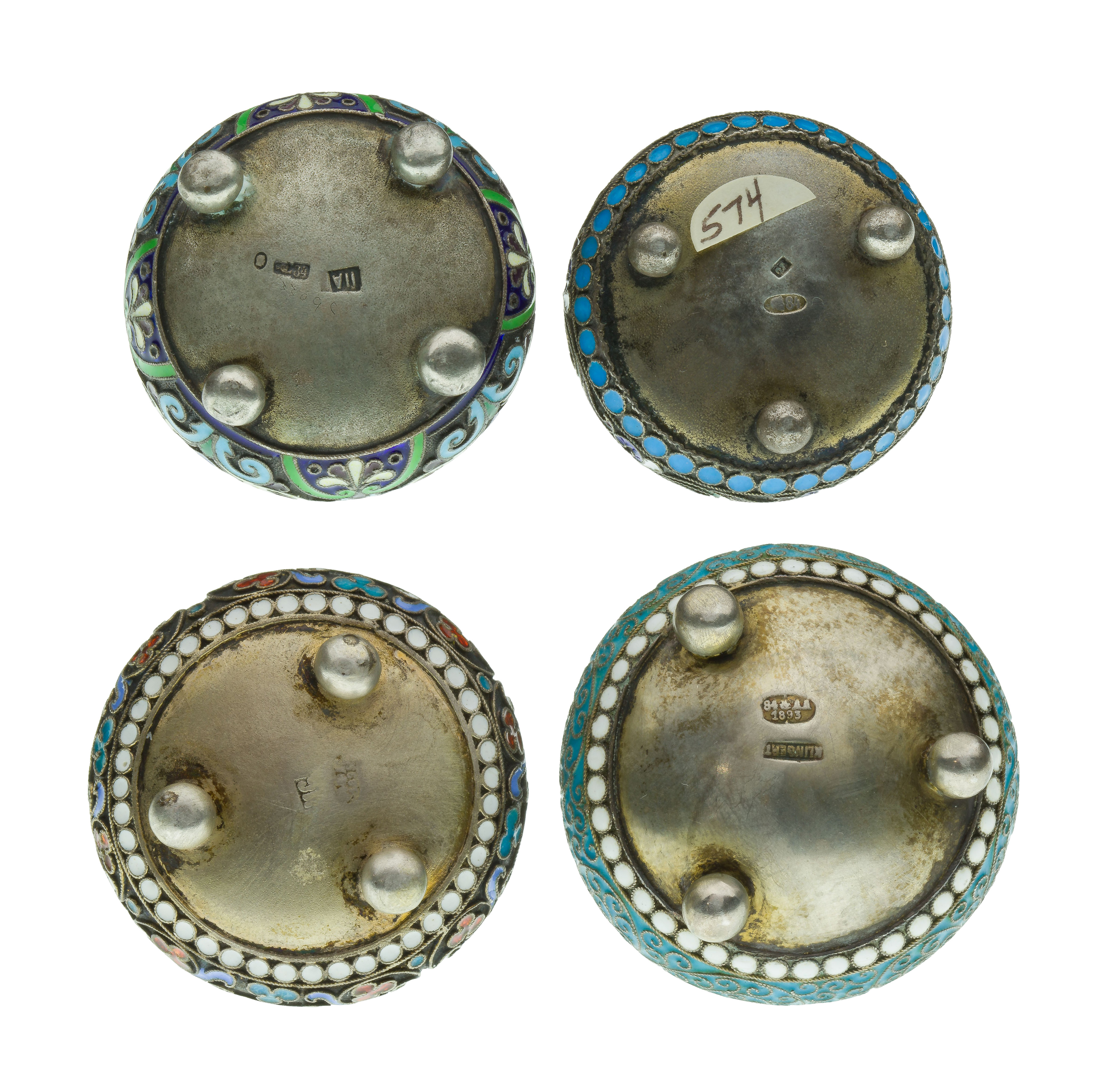 (4) items in Russian silver and cloisonne enamel of various sizes and colors, all having ball feet, one marked ‘Klinger 1893′ having a goldwash interior, other markings faint (all marked ’84’)