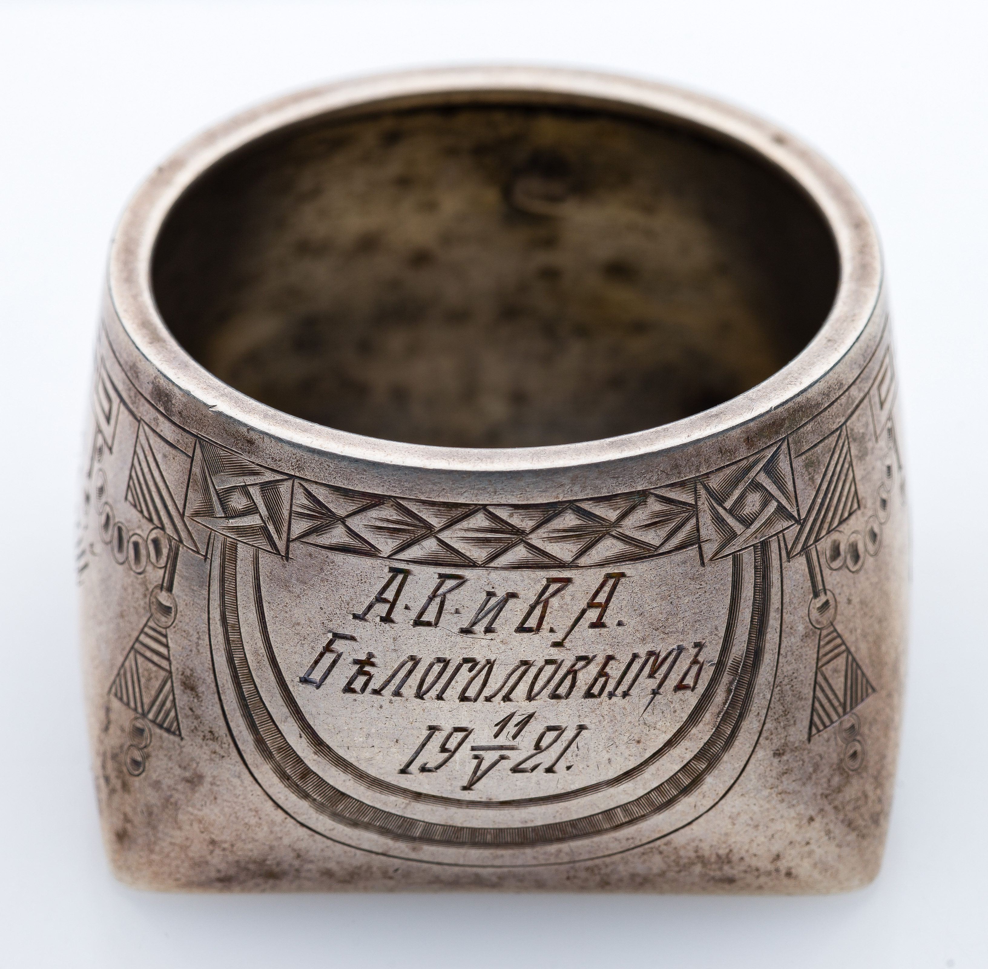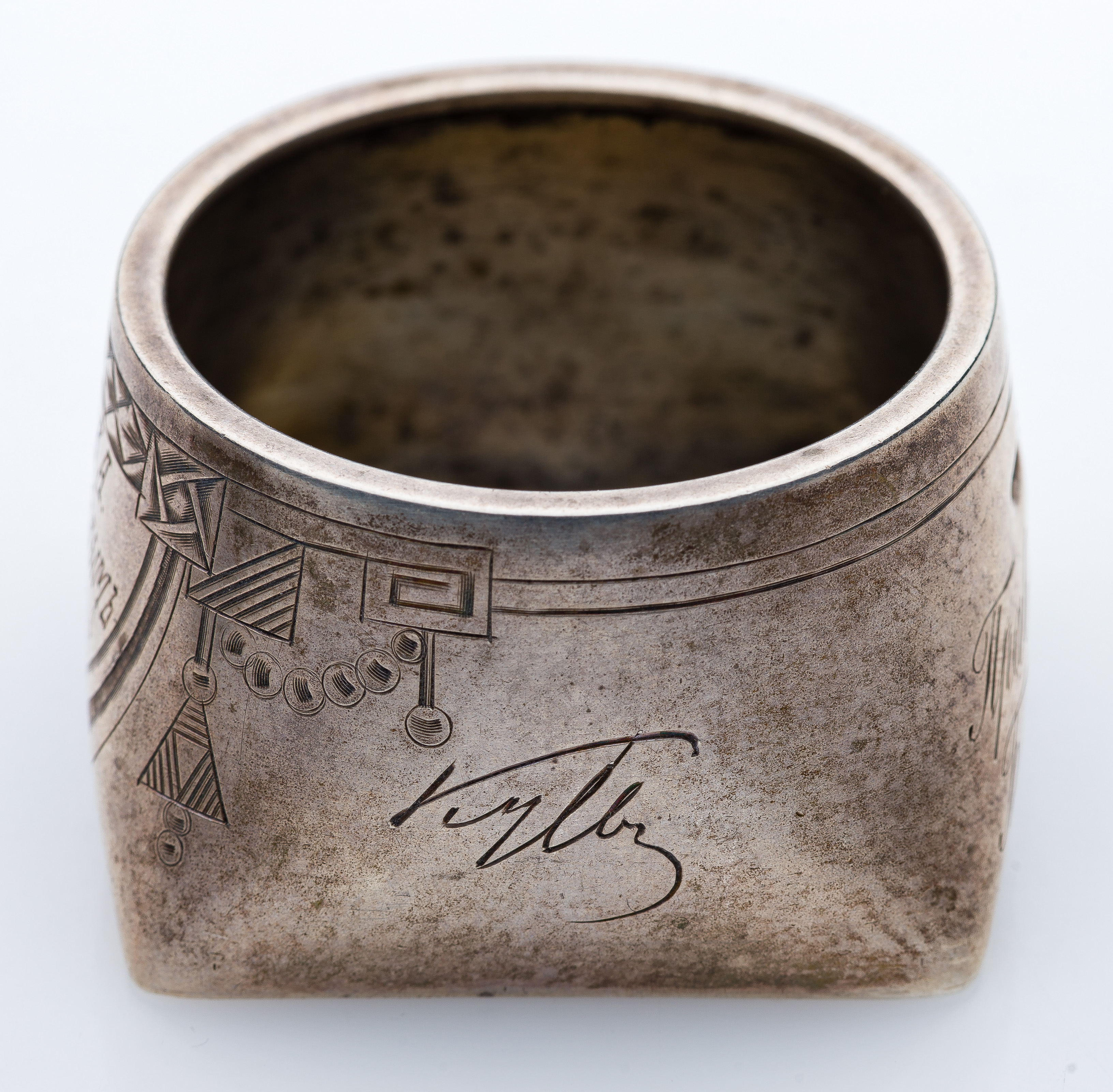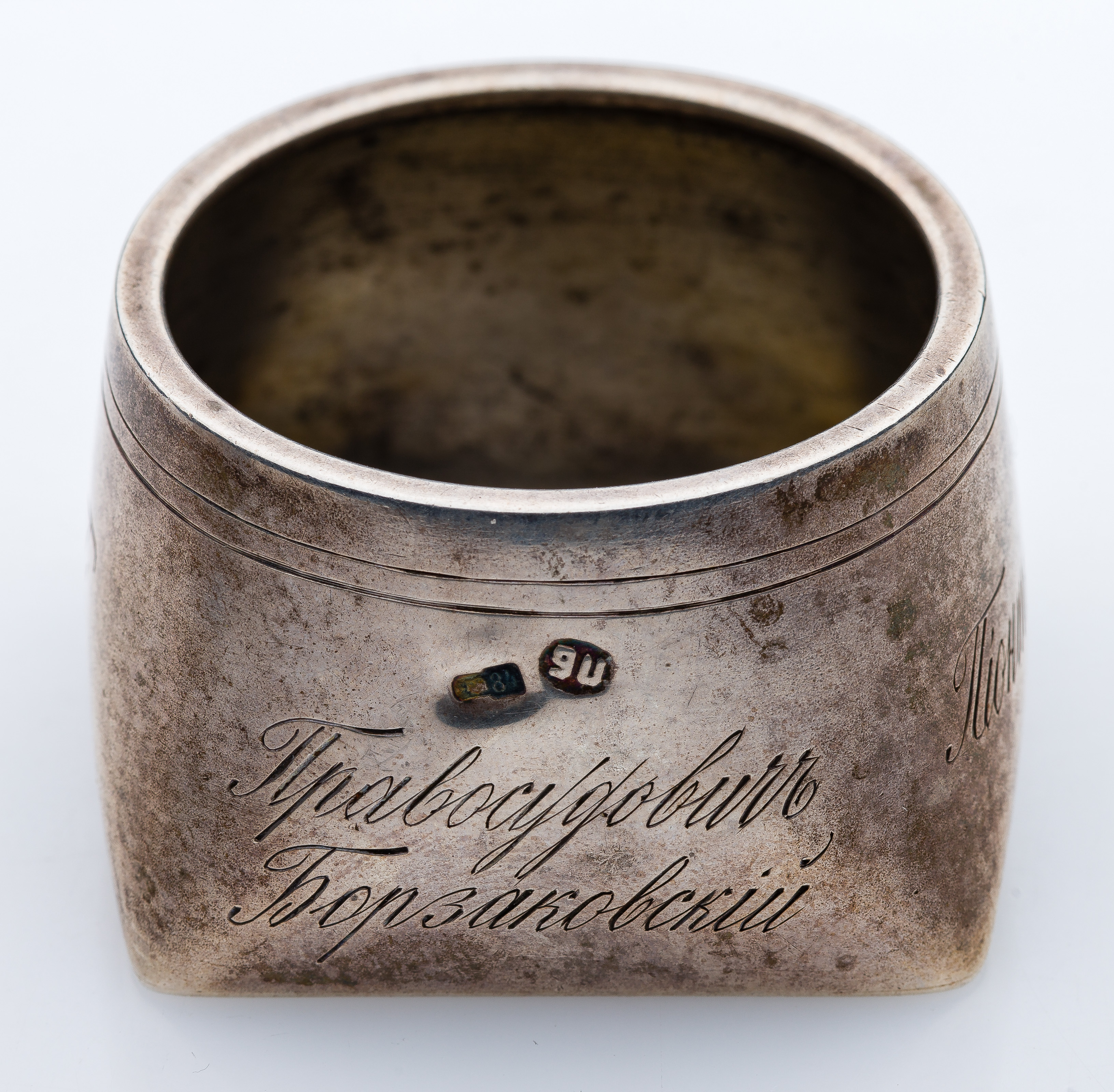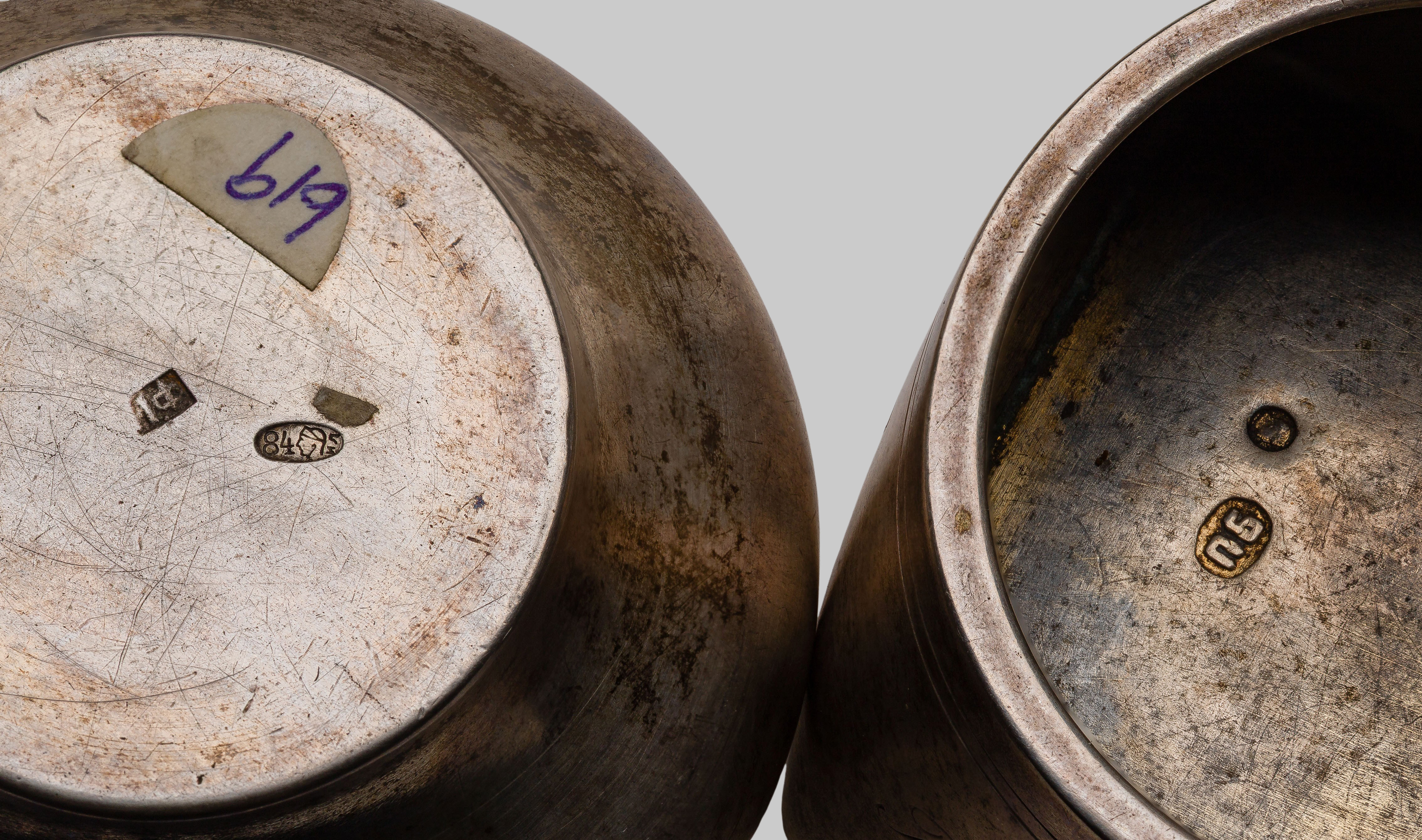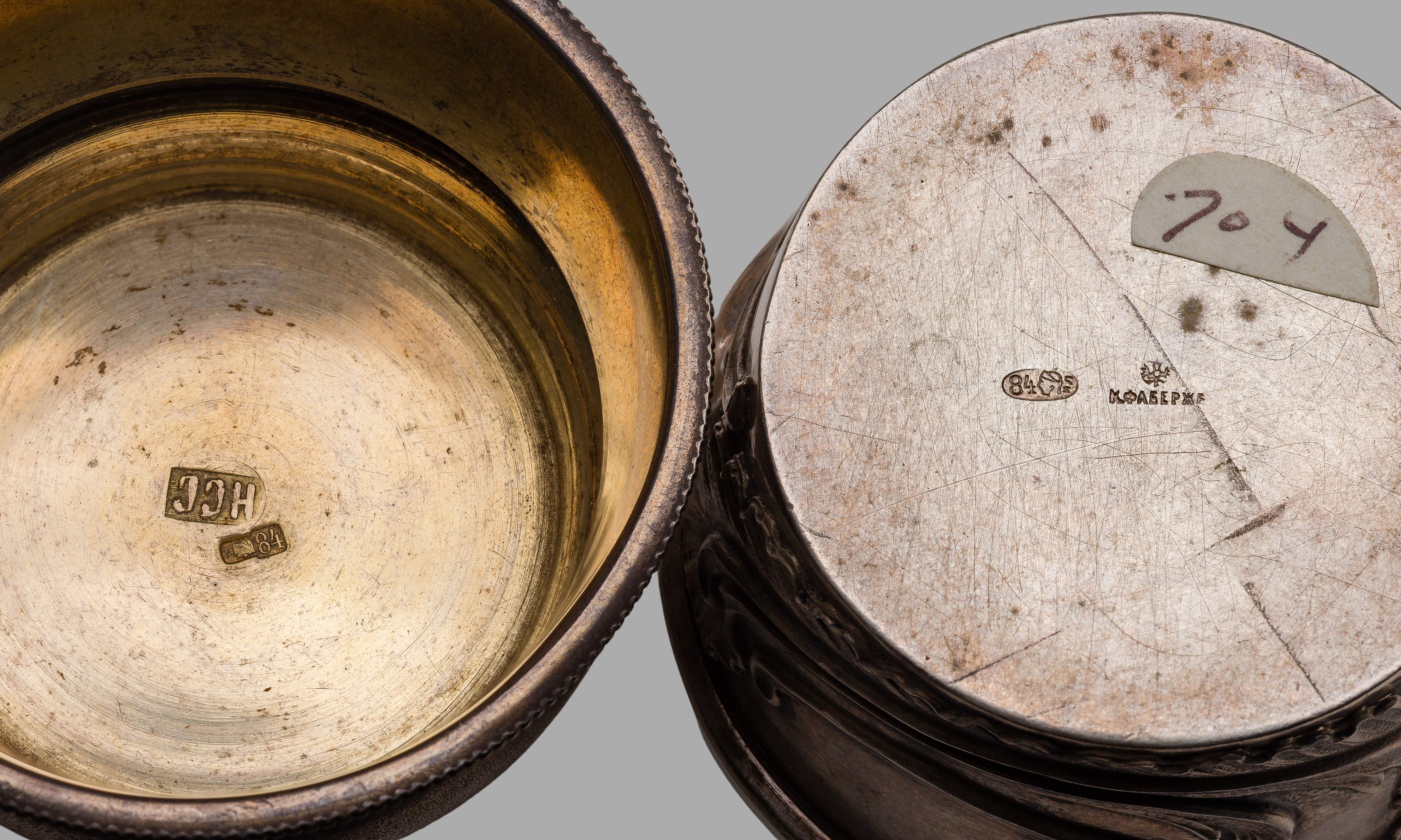 (8) items including a K. Faberge having a scroll motif (marked ‘K. Faberze’ / ’84’), a ball footed filigree having a letter W monogram (marked ‘E.W’ / ’84’), a filigree flat bottom (marked ‘H.C.C’ / ’84’), a ball foot gold-tone (marked ’84’), a flat bottom having Cyrillic writing throughout (marked ‘P.B’ / ’84’), a squat pot shape (marked ’84’), a gold-tone chain pattern rim (marked ‘I.K’ / ’84’) and a gold-tone footed (marked ’84’)