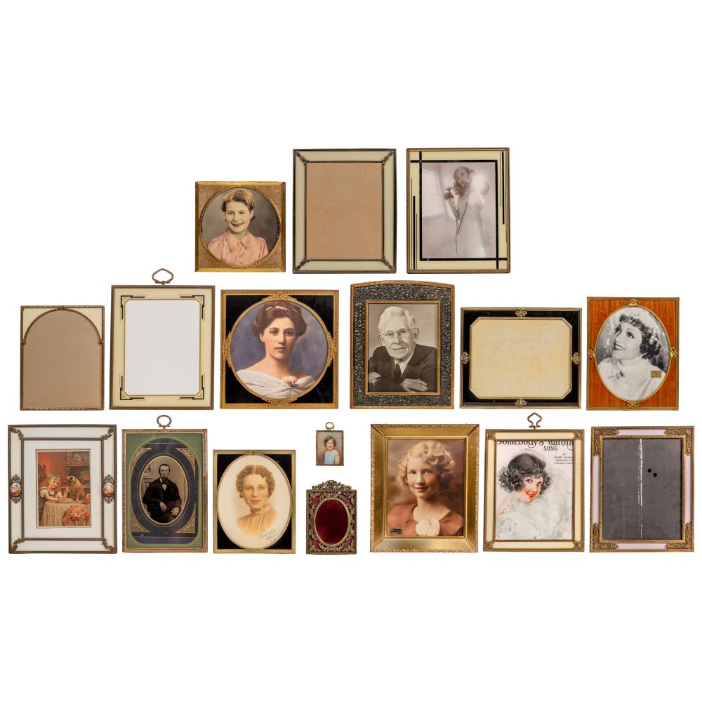(17) frames of various shapes, sizes, material and borders, some solid brass, most easel style and having glass