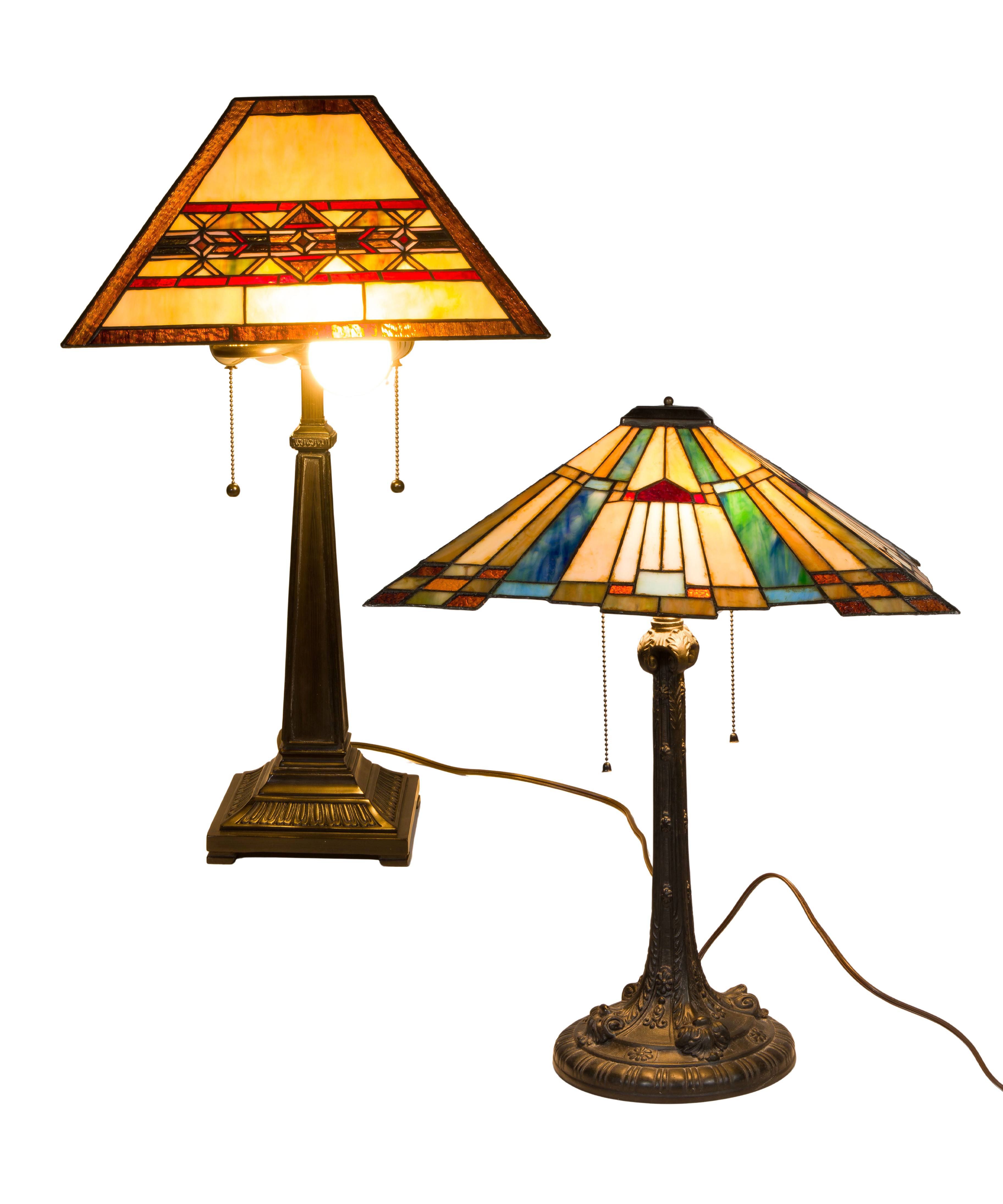 (2) items, both having pyramidal multi-color acrylic shades on 2-socket bronze-tone metal bases, labels reading ‘Made in China’ on underside
