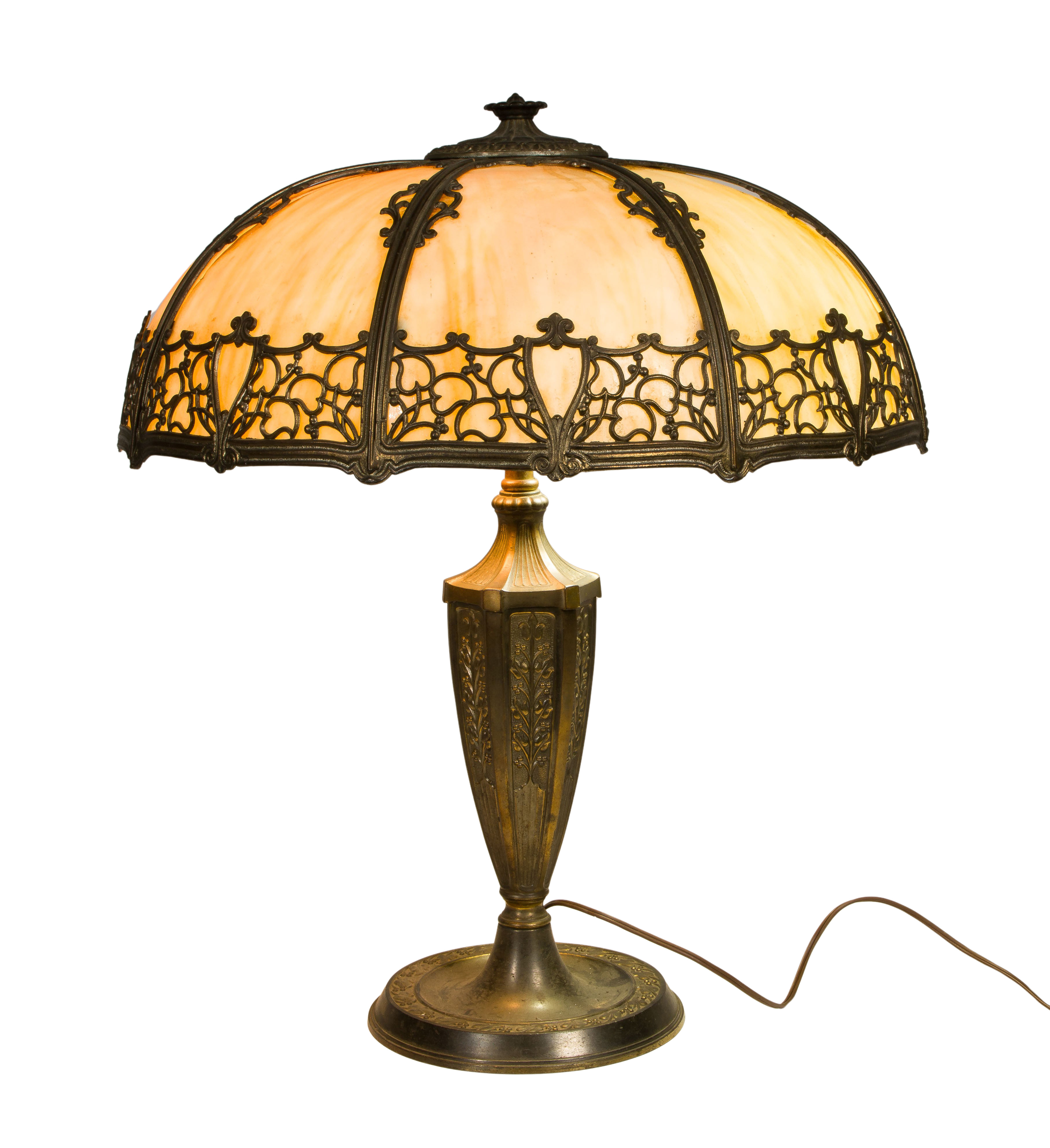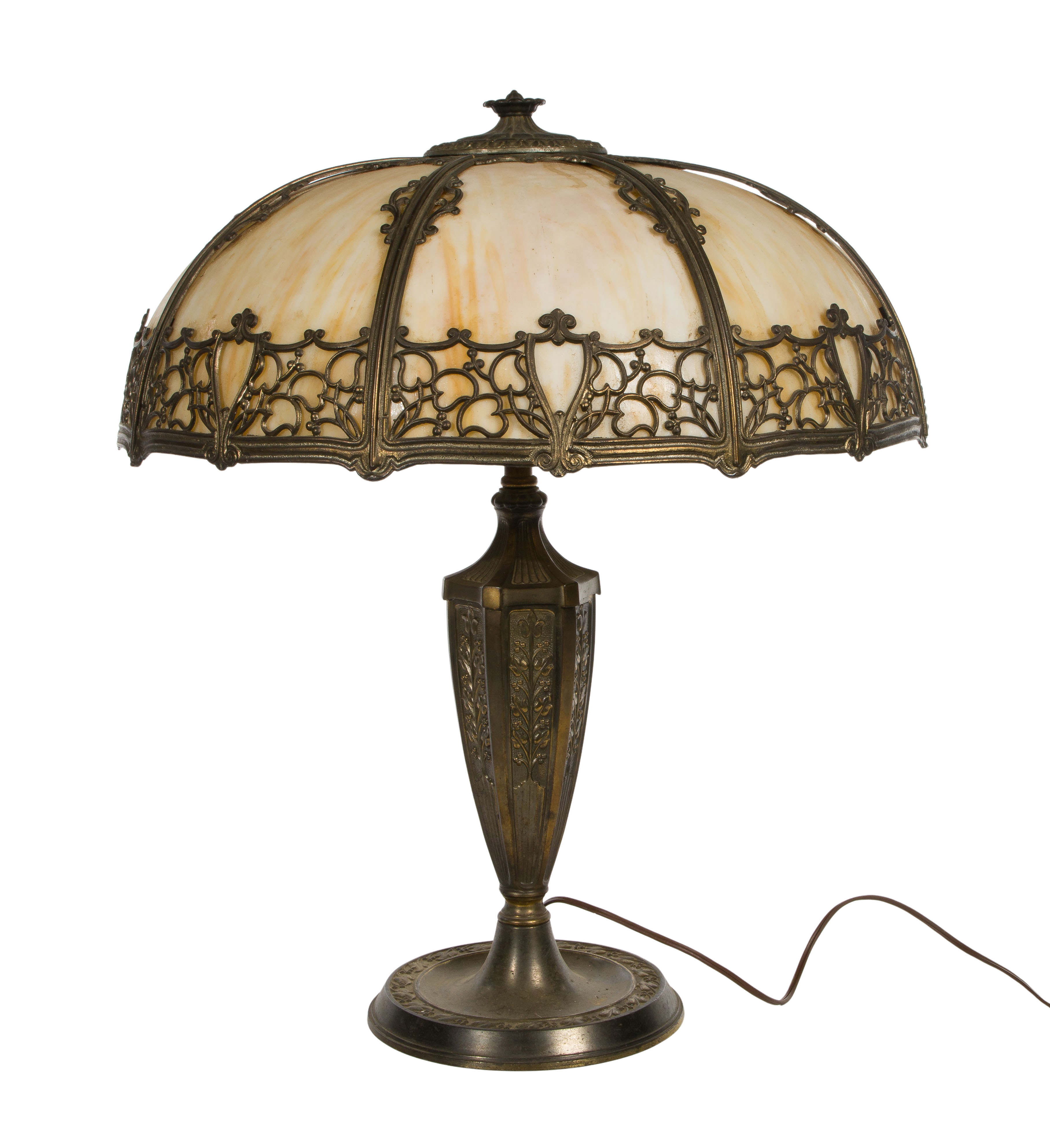 Having an unmarked copper alloy 2-socket base and unmarked 8-panel shade
