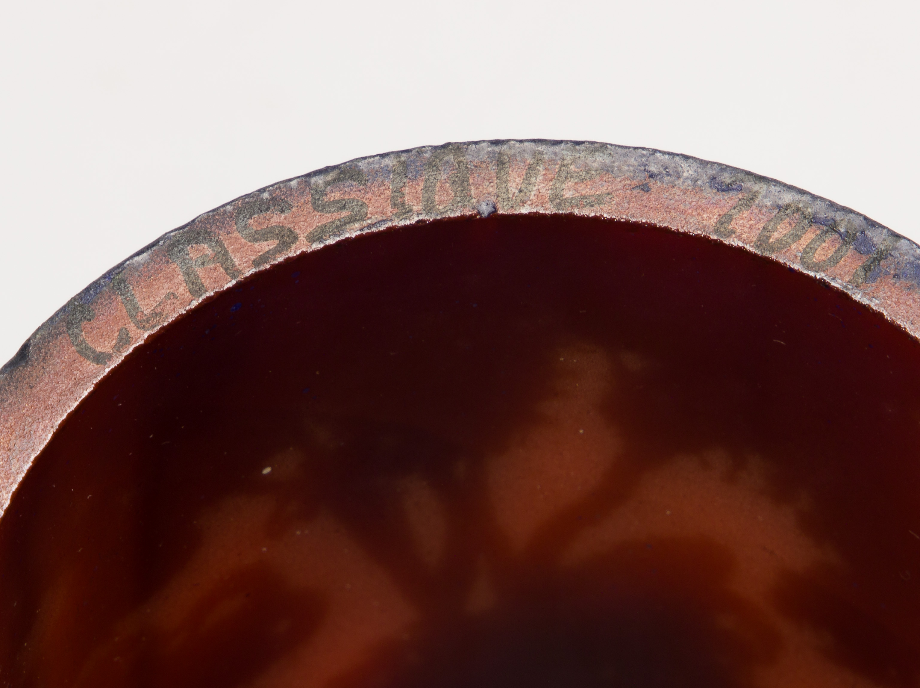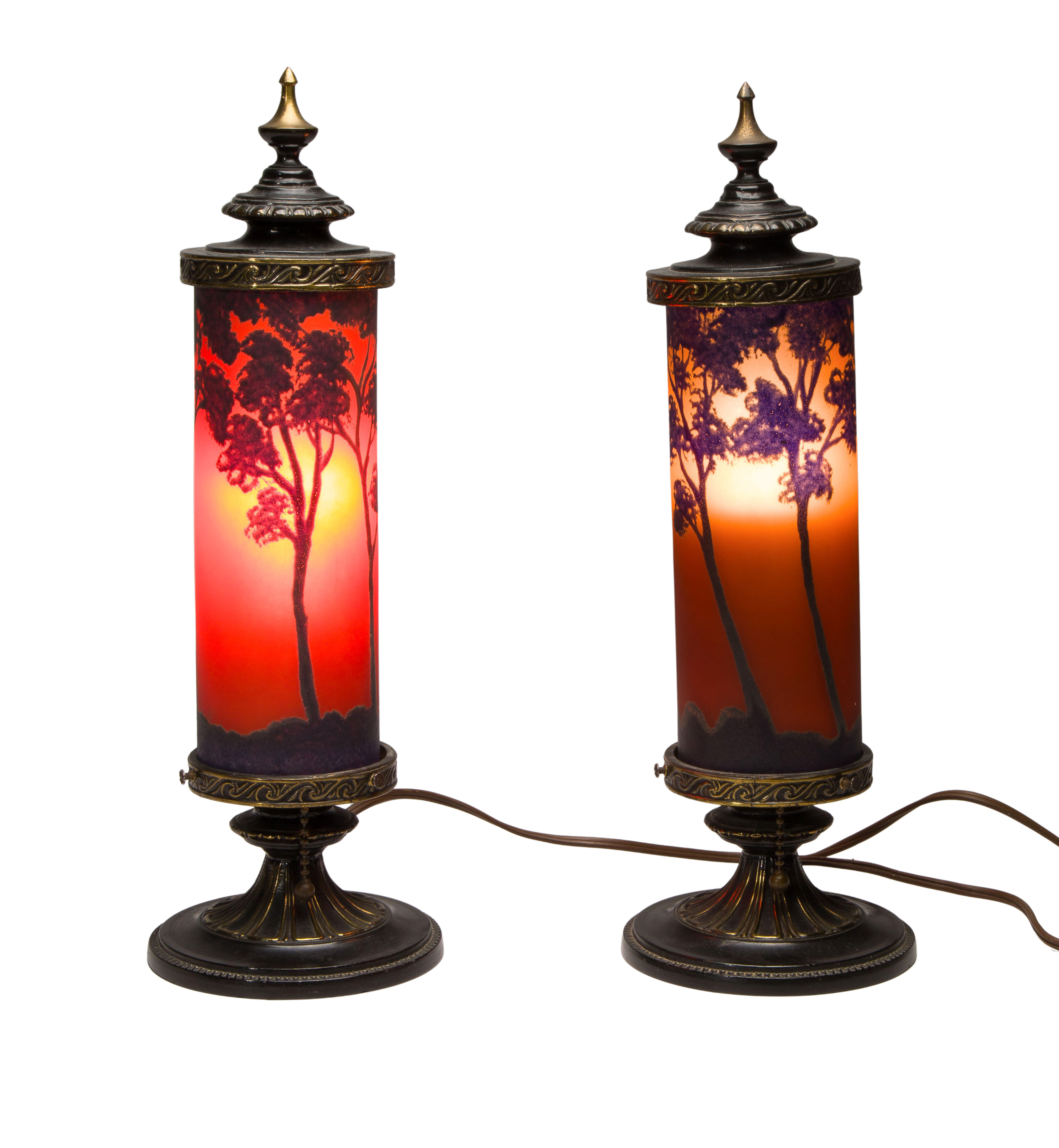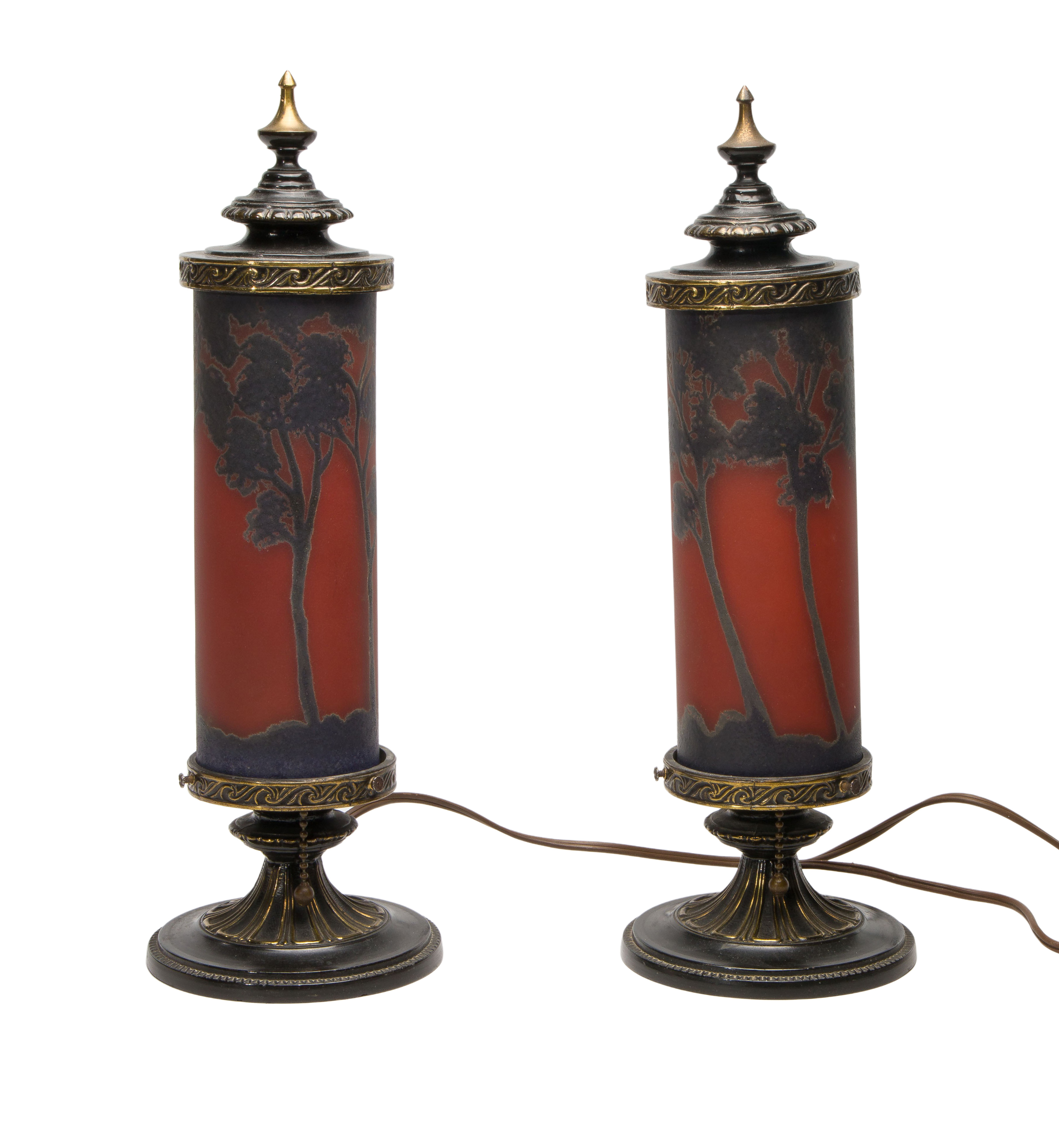 Glass cylinders of painted trees having brass base, brass lid and pull chain switch, marked on top edge of glass