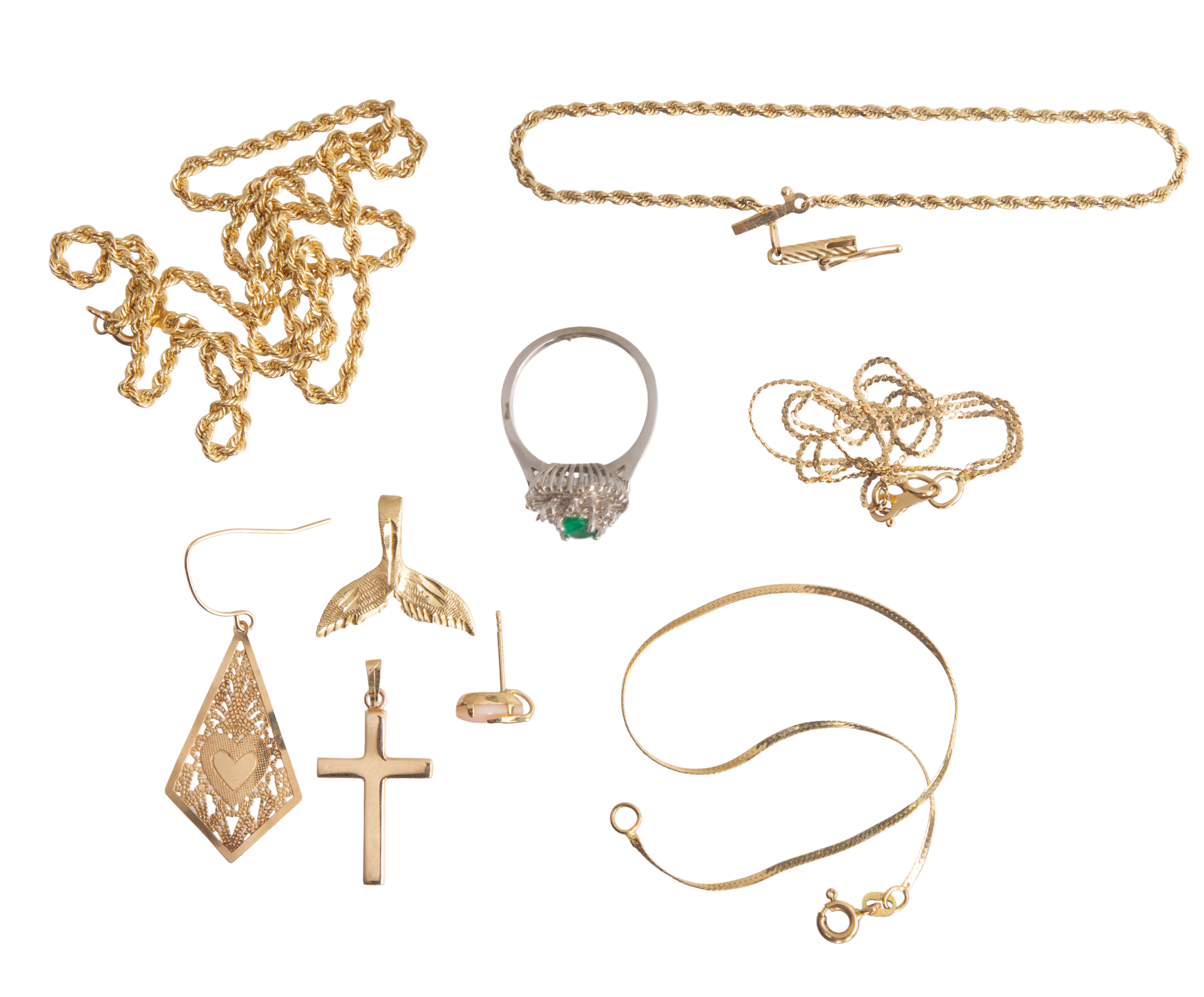 (9) items including a white gold ring having an oval cut emerald surrounded by round and baguette cut diamonds in a halo pattern as well as, in yellow gold, a twisted rope necklace, a twisted rope bracelet, a flat braided double bracelet, a flat braided single bracelet, a cross pendant, a whale tail pendant, a single stud earring having a pear cut pink moon stone and a single heart design wire earring (all marked ’14k’ / ‘585’)