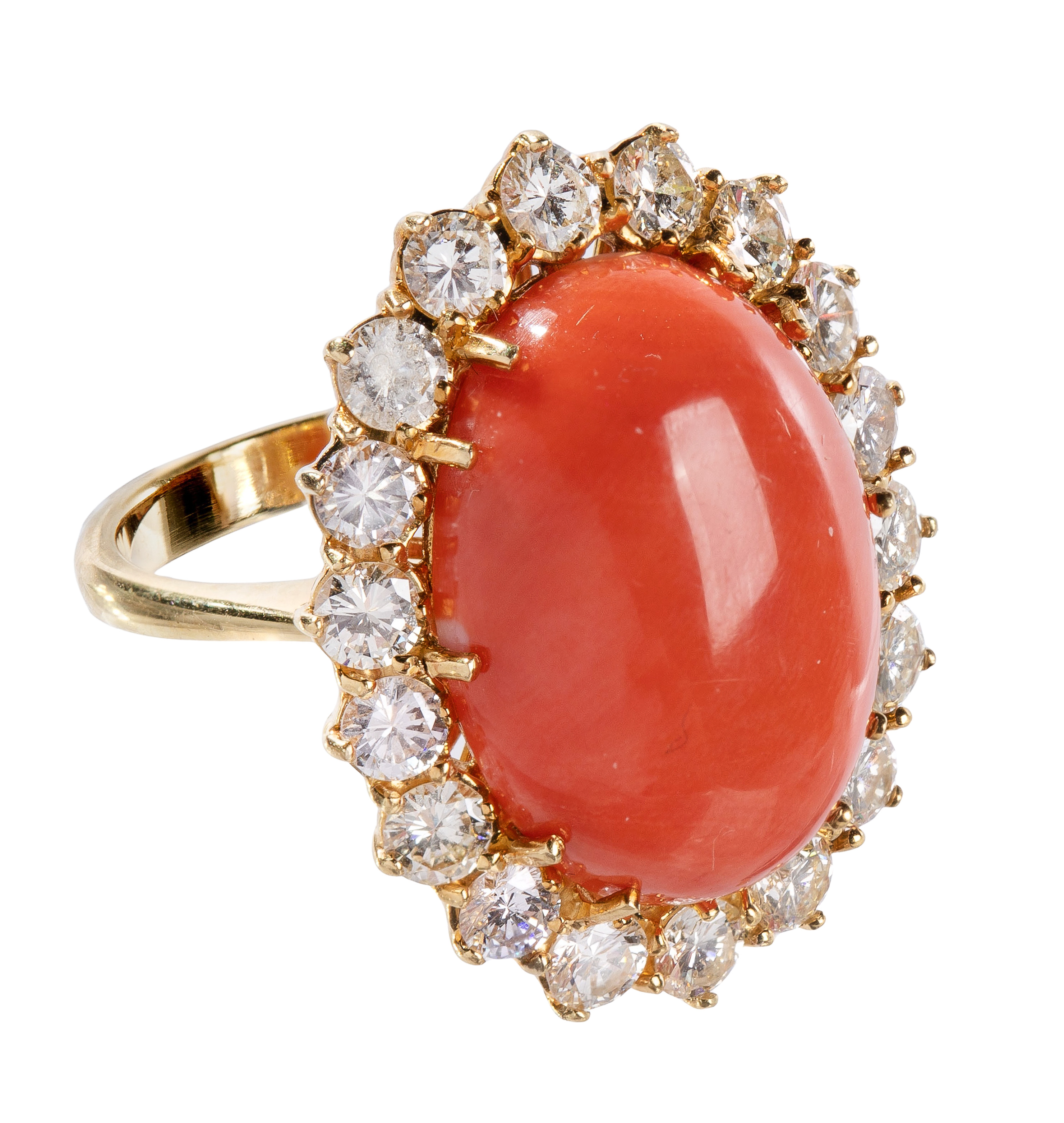 Having an oval cut coral cabochon (21.5 x 16 x 5.5mm) surrounded by eighteen round cut diamonds weighing approximately 2.70 carats total (marked ‘750’), including presentation box