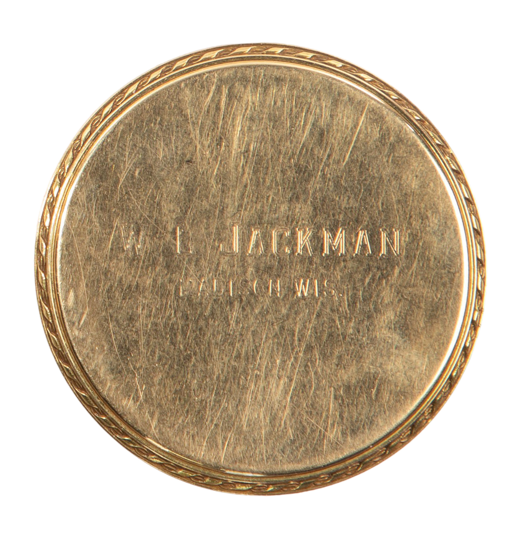 Serial #742139, 21-jewel Swiss movement, open face having braiding around the edges, black Roman numerals on tan dial, secondary dial at 6-o’clock (marked ’18k’ on inside back of case) as well as a watch chain having an intaglio profile carved in a round cut garnet fob (marked ’14’ inside clasp)