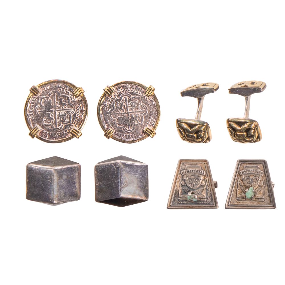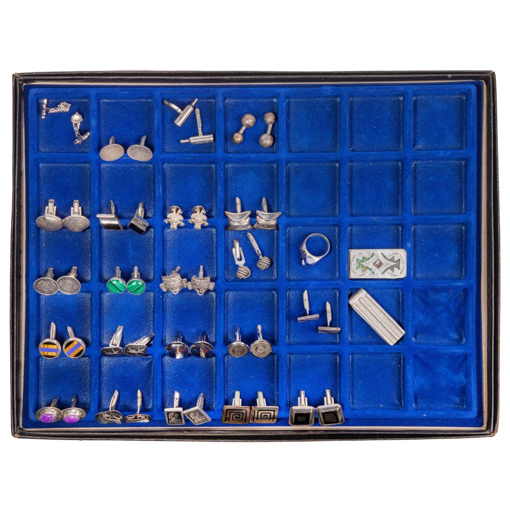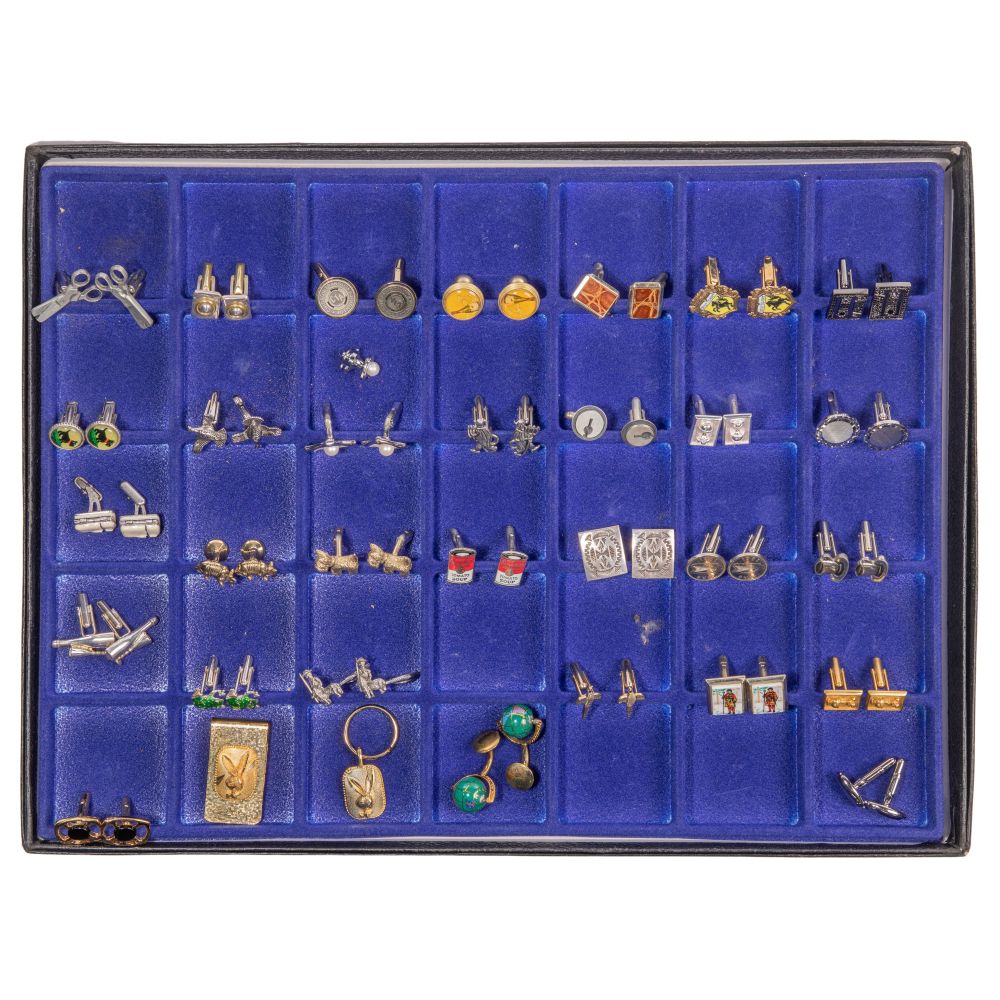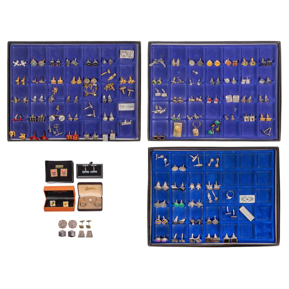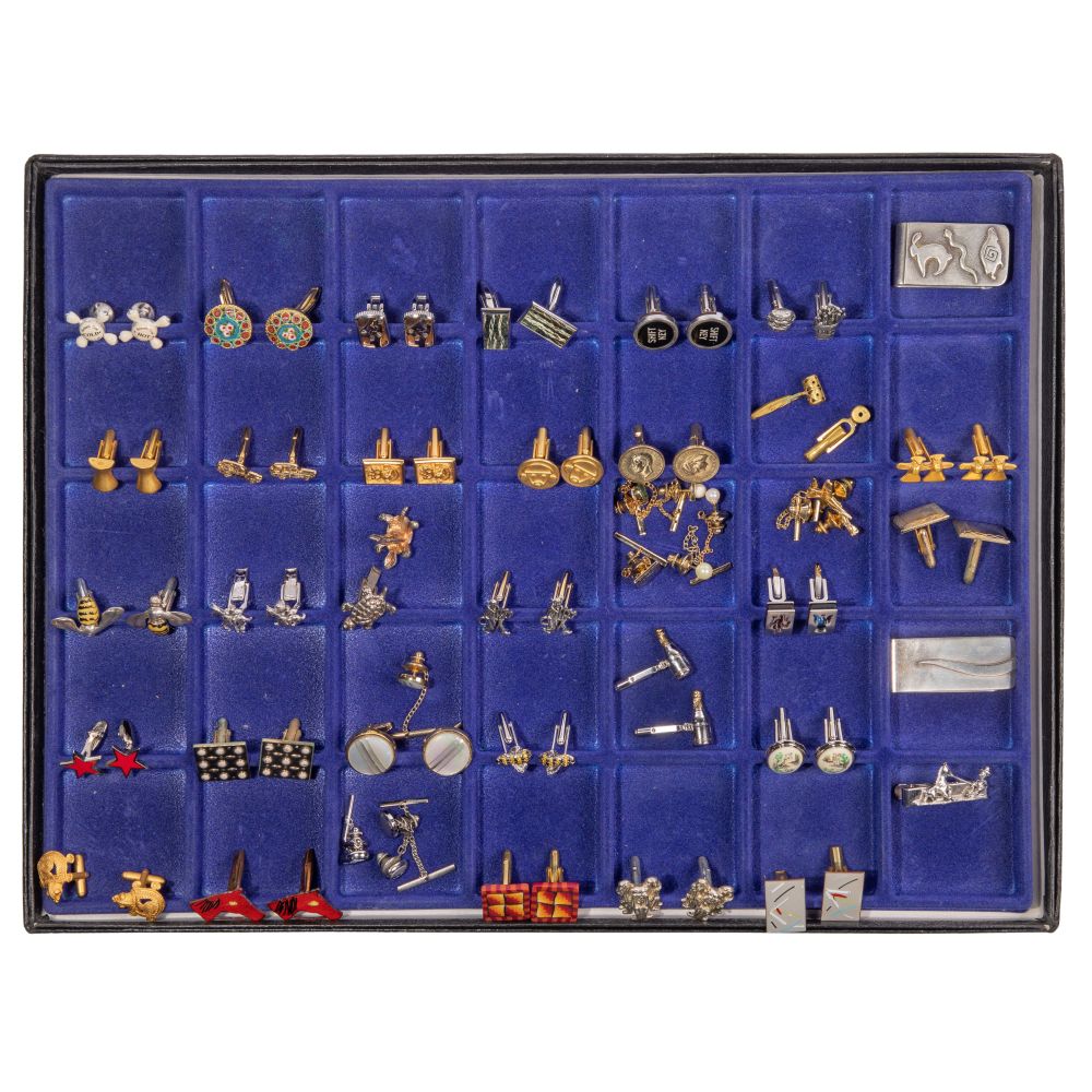 Approximately (100) items including a pair of onyx cufflinks (marked ‘970’), a pair of cufflinks having yellow gold trim (marked ‘925’ and ’18k’), (22) cufflinks with a few having matching tie clips / tacks, (2) money clips and a ring having a blue stone (marked ‘925’ / ‘sterling’), a pair of cufflinks (marked ‘900’), a pair of cufflinks having coins from the Atocha as well as costume jewelry including (67) pair of cufflinks and (3) money clips