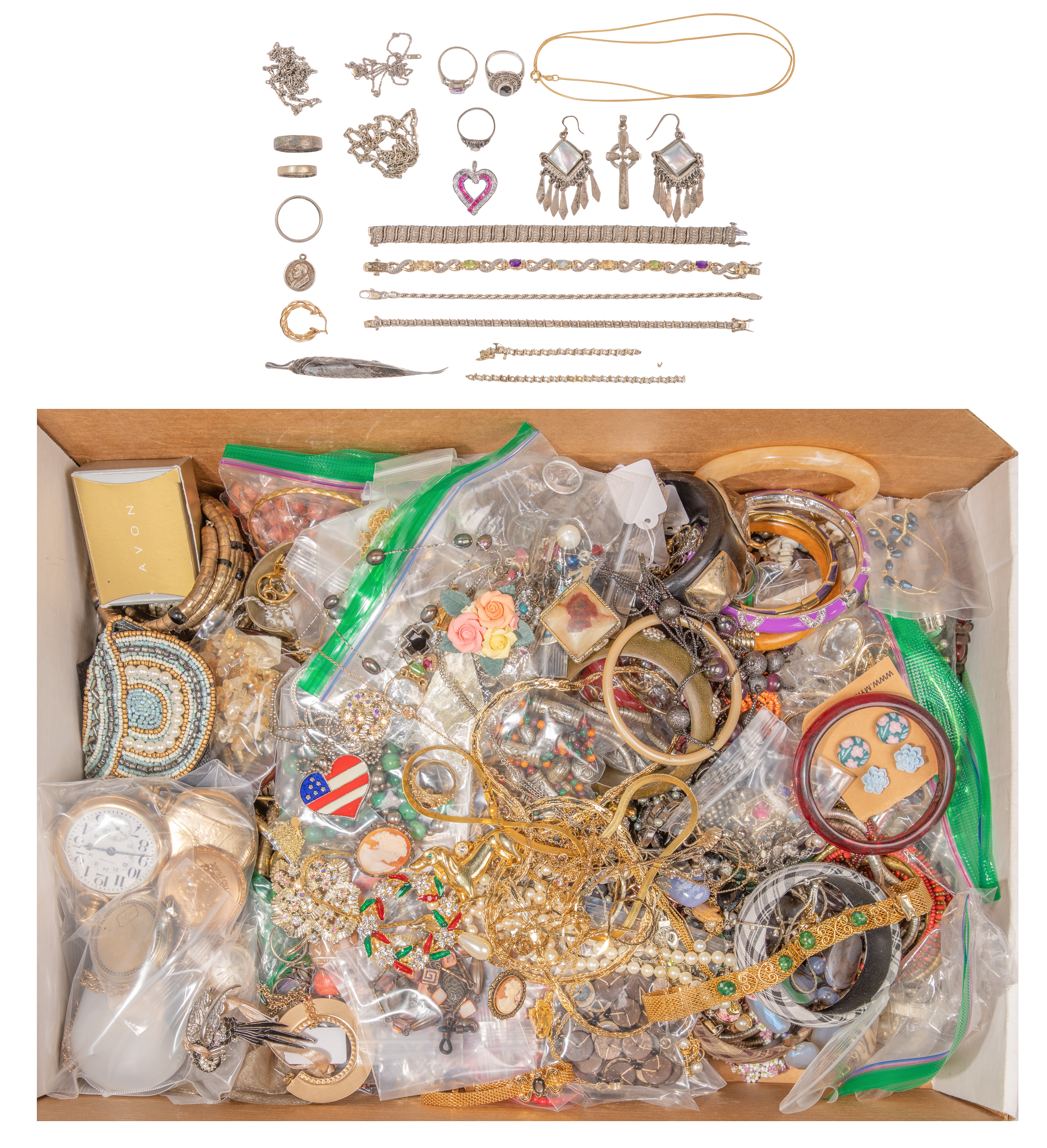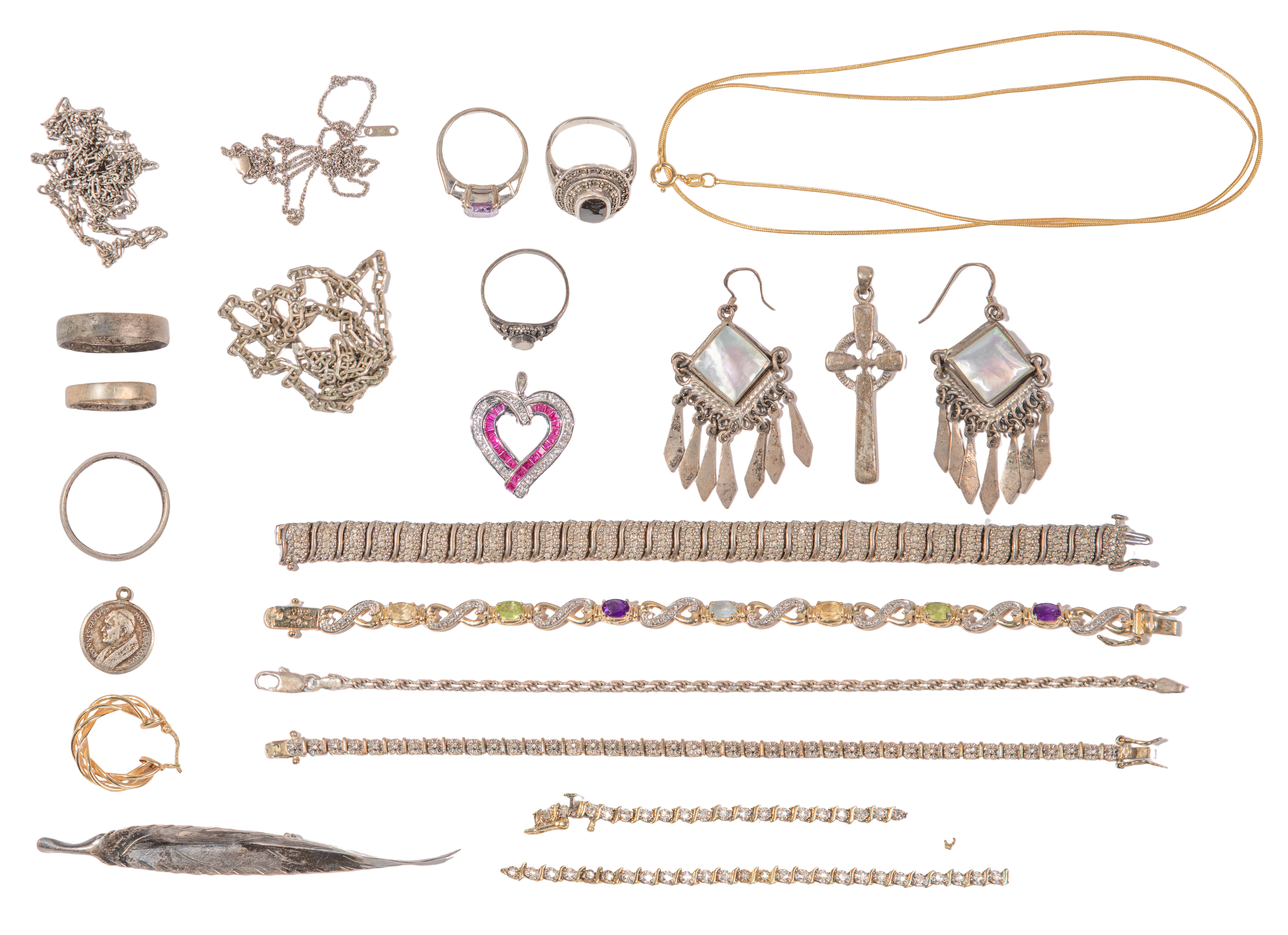 Including a single pierced earring (marked ’14k’), a tennis bracelet (marked ’10k’), necklaces, pins, rings, bracelets and pendants (most marked ‘925’), (3) rings and a coin charm (unmarked 900) and approximately (17) pounds of fashion jewelry including rings, necklaces, earrings and bracelets