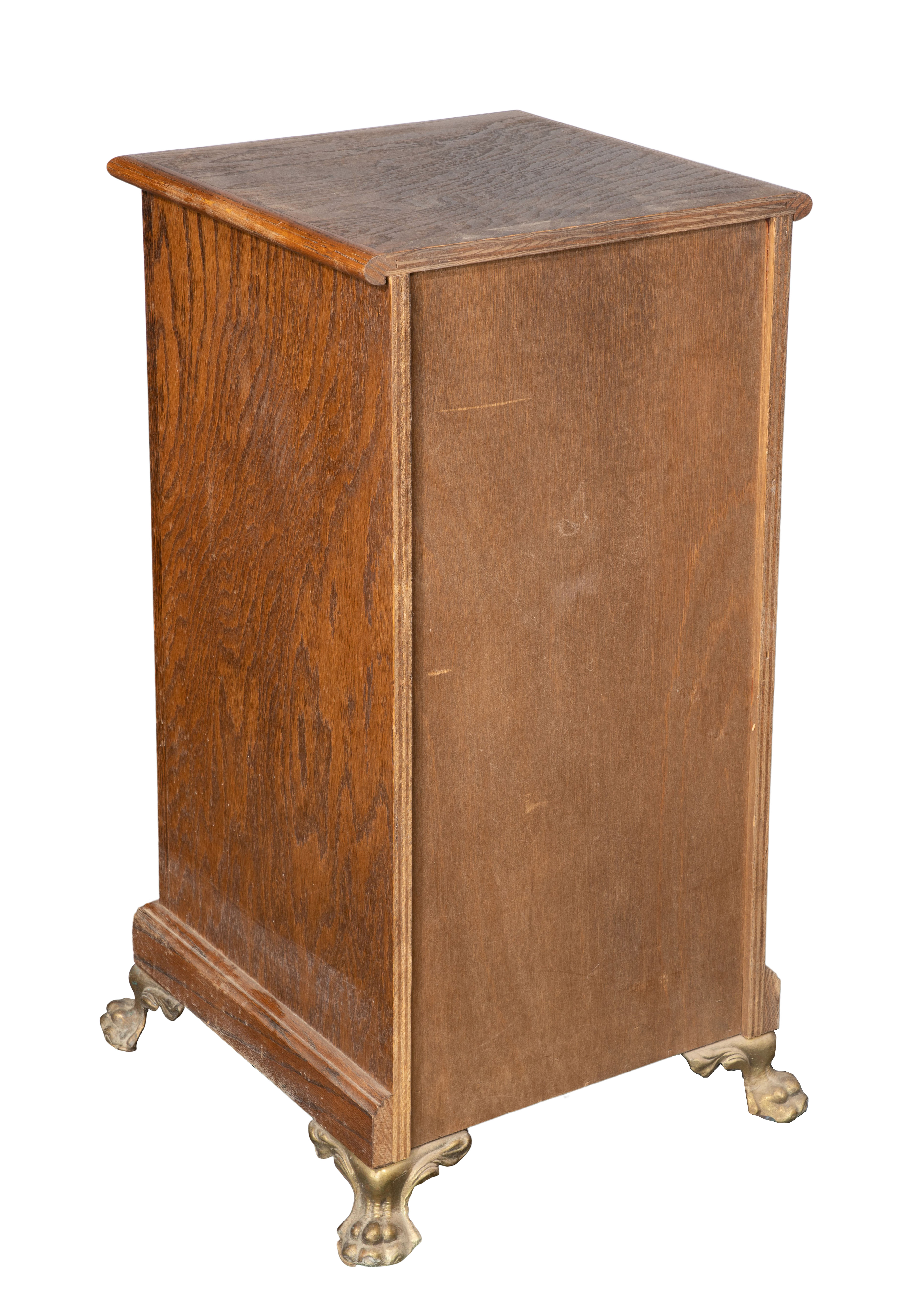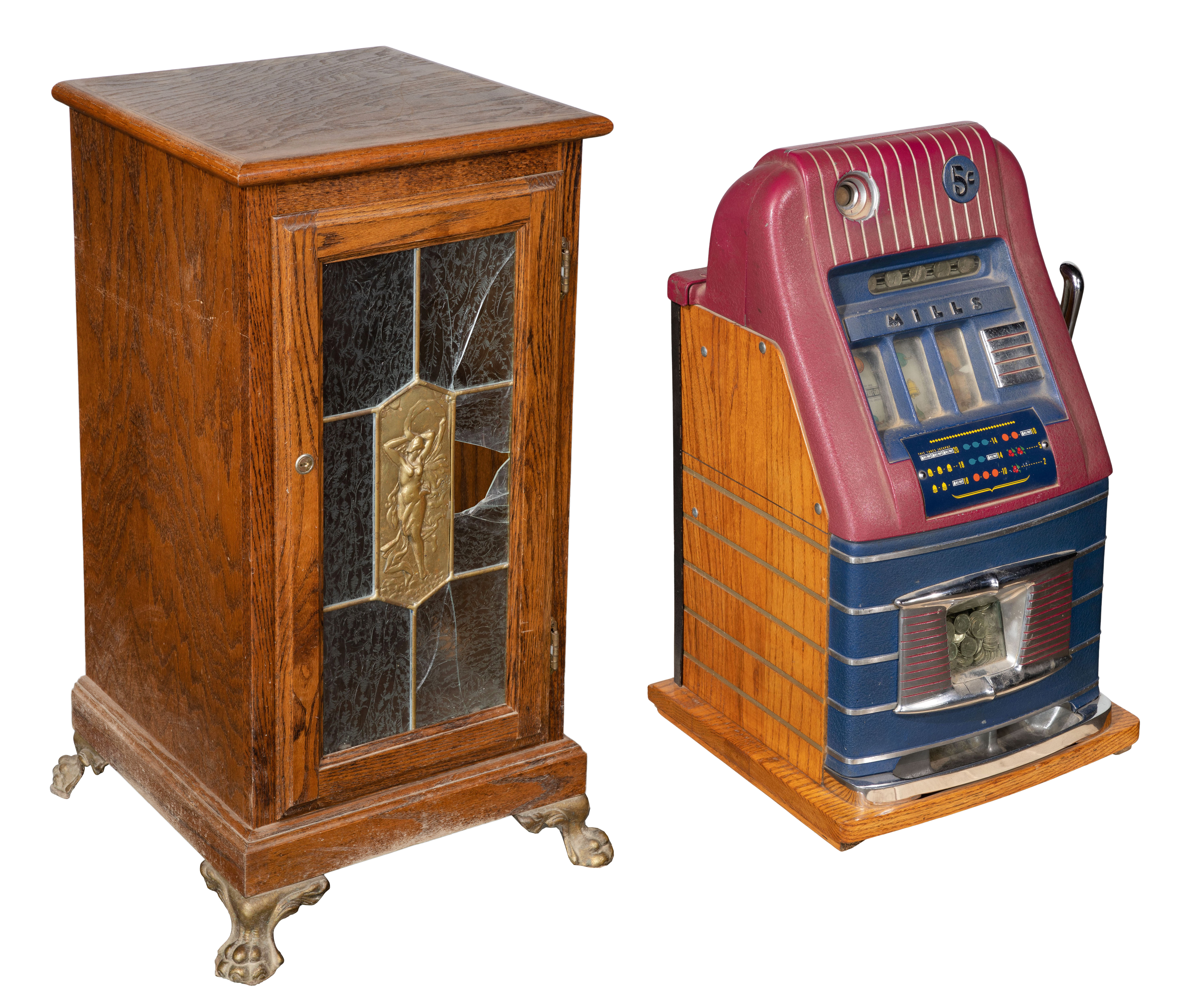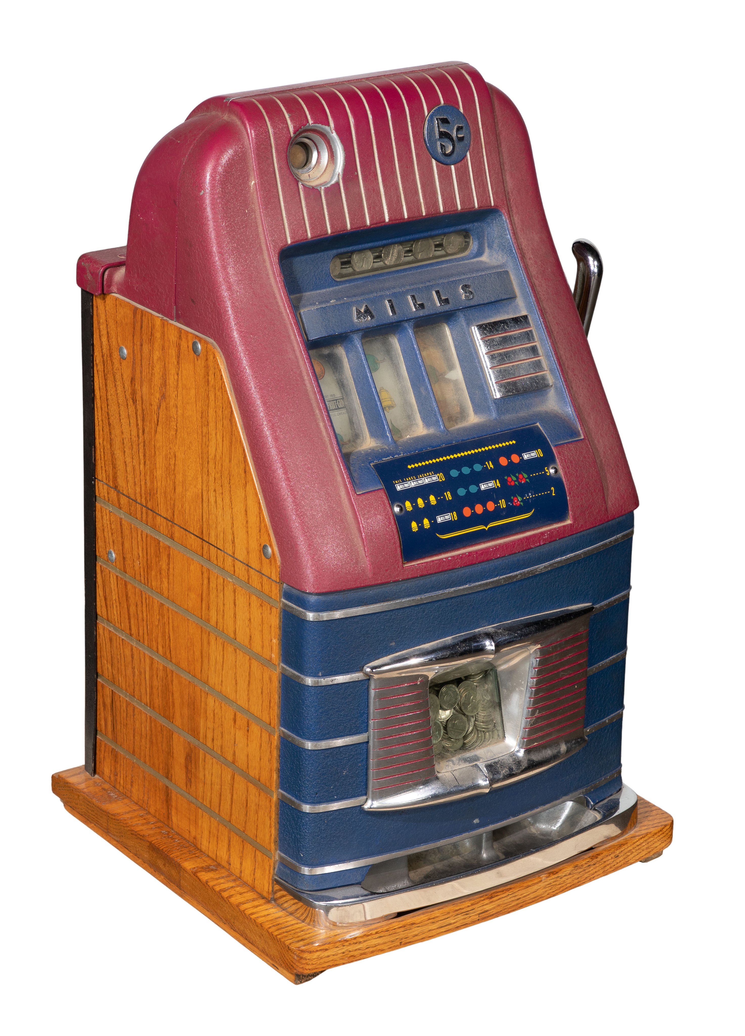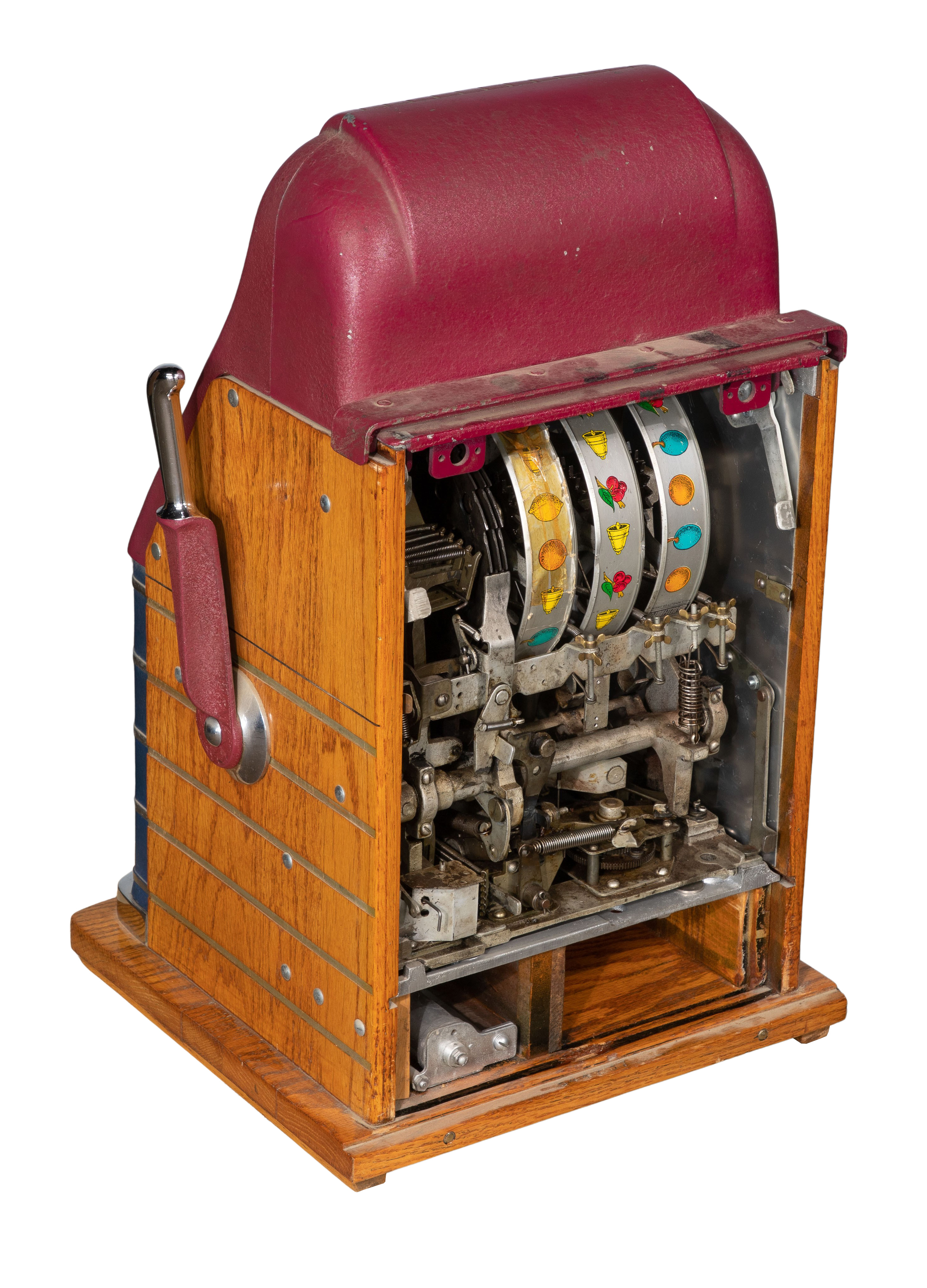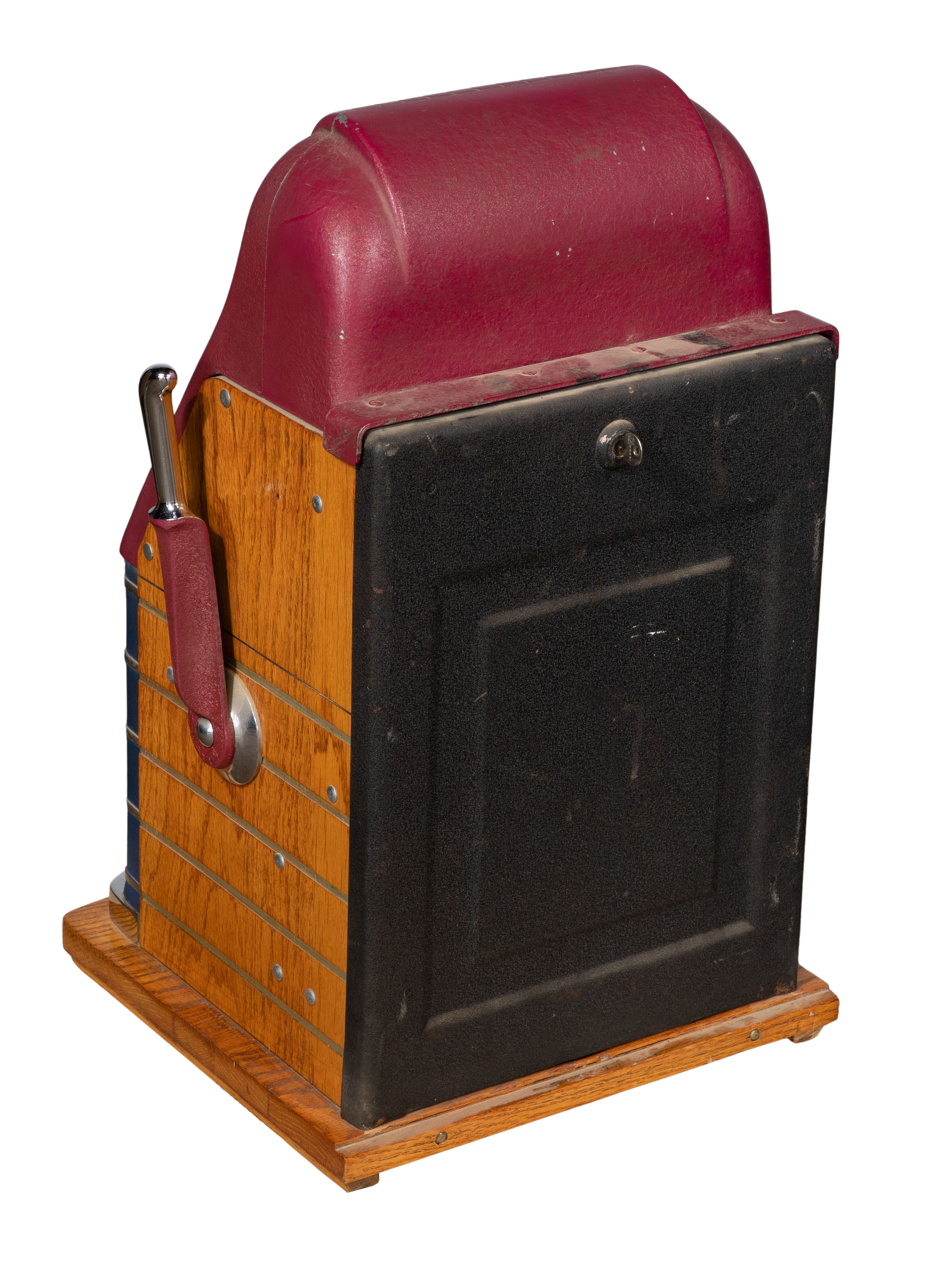 c.1940 5c mechanical Hi-Top, having 3-reels, a black diamond finish of a deep maroon top and deep blue body / front, wood sides, in an Art Deco design, a jackpot window on the front; together with a wood stand having a glass and brass door and brass claw feet (34 x 19 x 19-inches), key for base