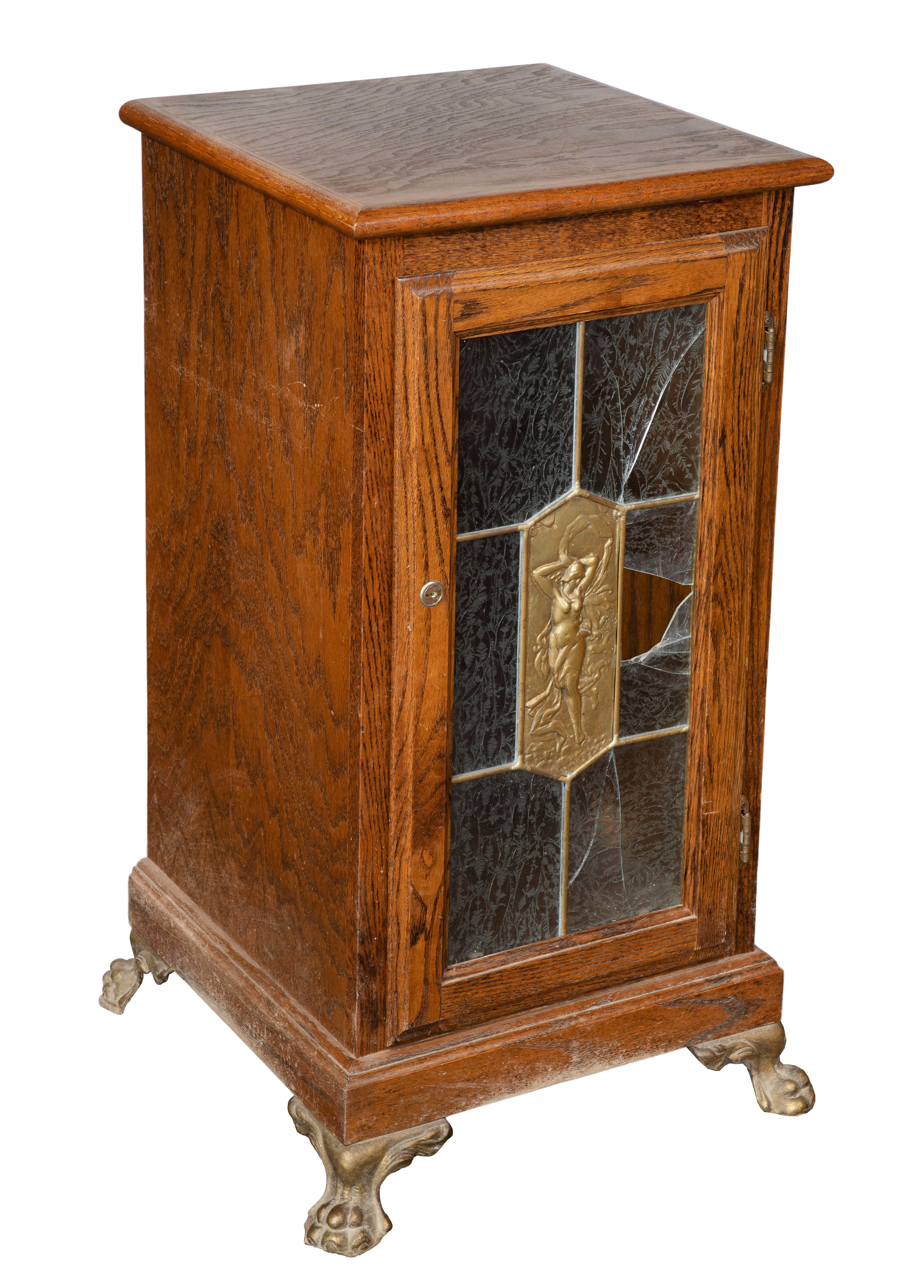 Condition: not working when tested, nick, chips, scratches, back open, no key, stand having nicks, chips, scratches, broken glass on door