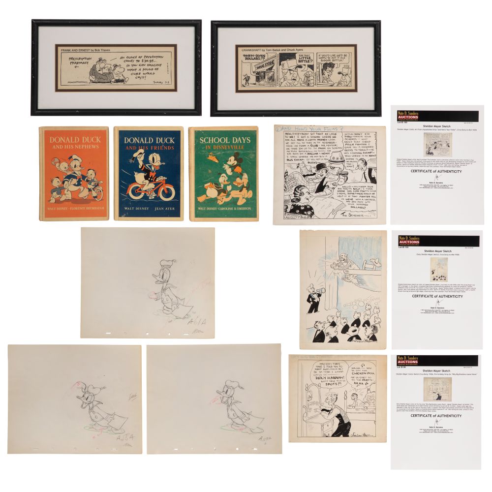 (12) total items including (3) animation drawings of Donald Duck having red and green highlights on 5-peg hole animation paper, numbered A58, 59 and 61, (3) hand drawn sketches by Sheldon Mayer, each having a COA from Nate D. Sanders, (2) framed drawings by Bob Thaves having original newspaper strip taped verso; together with (3) c.1930 Donald Duck books illustrated by the Walt Disney Co