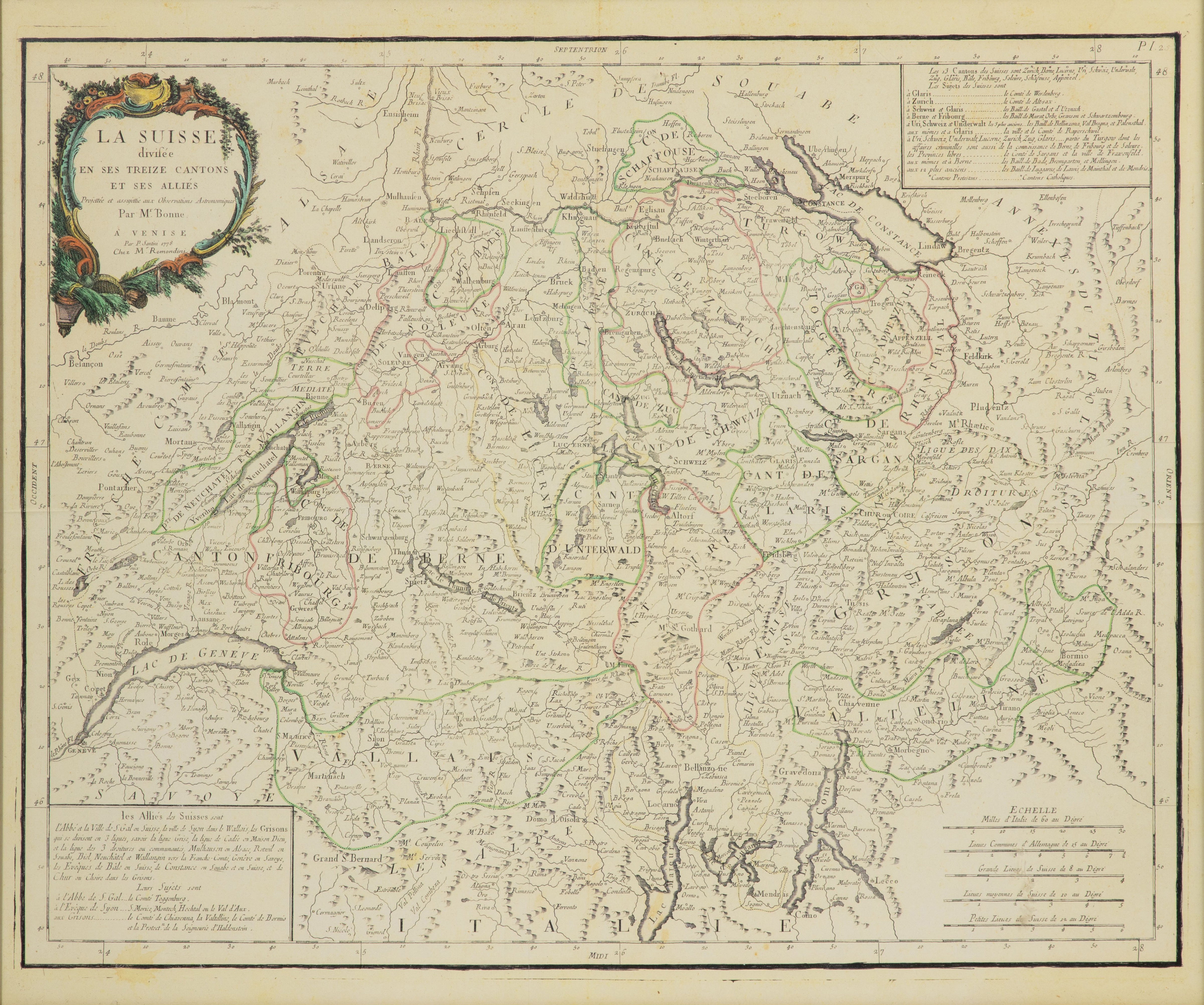 Condition: overall light wear consistent with normal use, Swiss map having center fold crease both horizontally and vertical, foxing, some areas of yellowing, frame having minor wear, Marseilles map appears to have been in a book having minor damage on left edge, discoloration, small tears, creases on left side and foxing