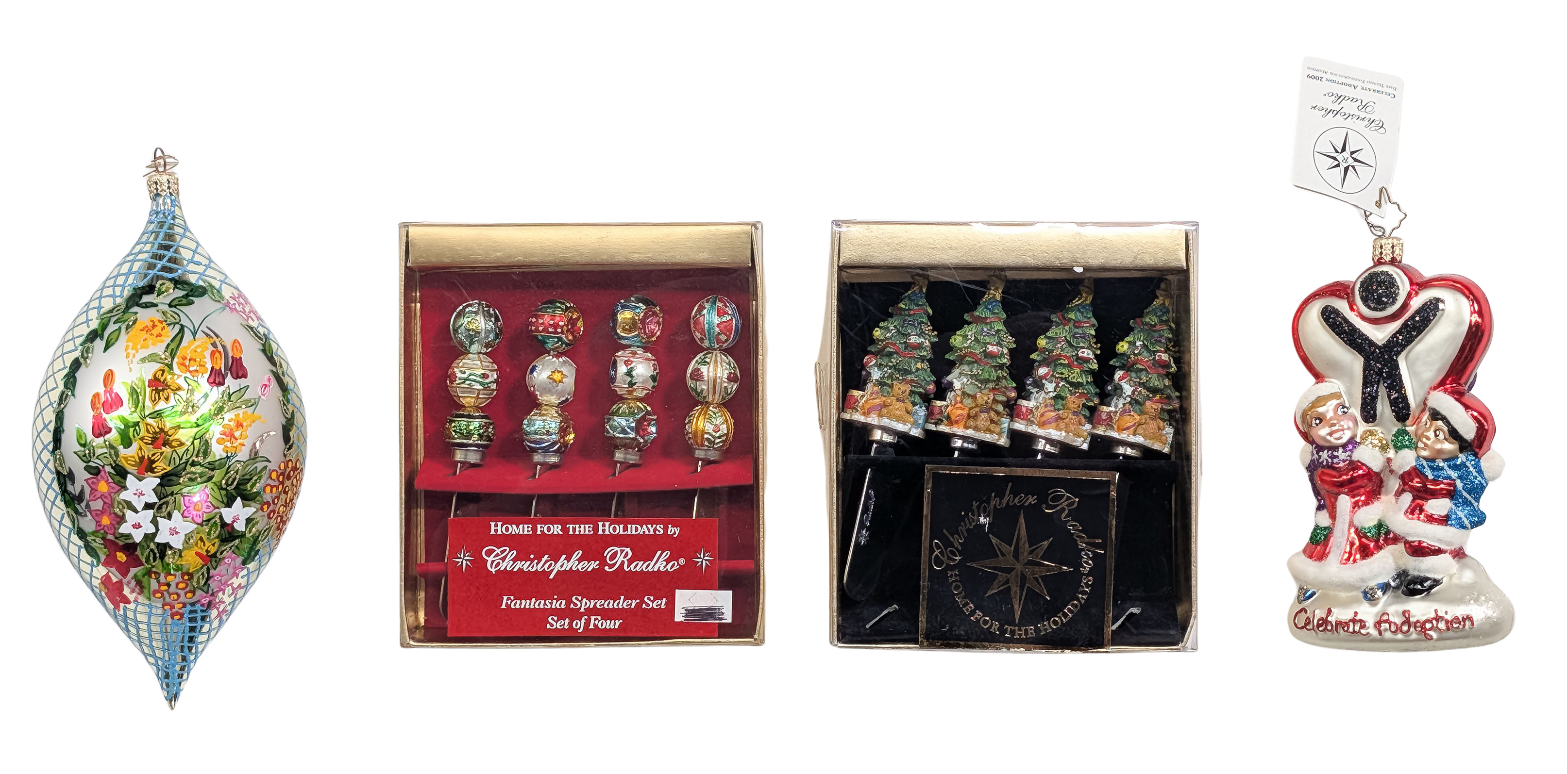 Approximately (30) items in various shapes, sizes, materials and themes, including serving knives, tree toppers, ornaments, most having boxes; together with an unmarked white and silver tree topper