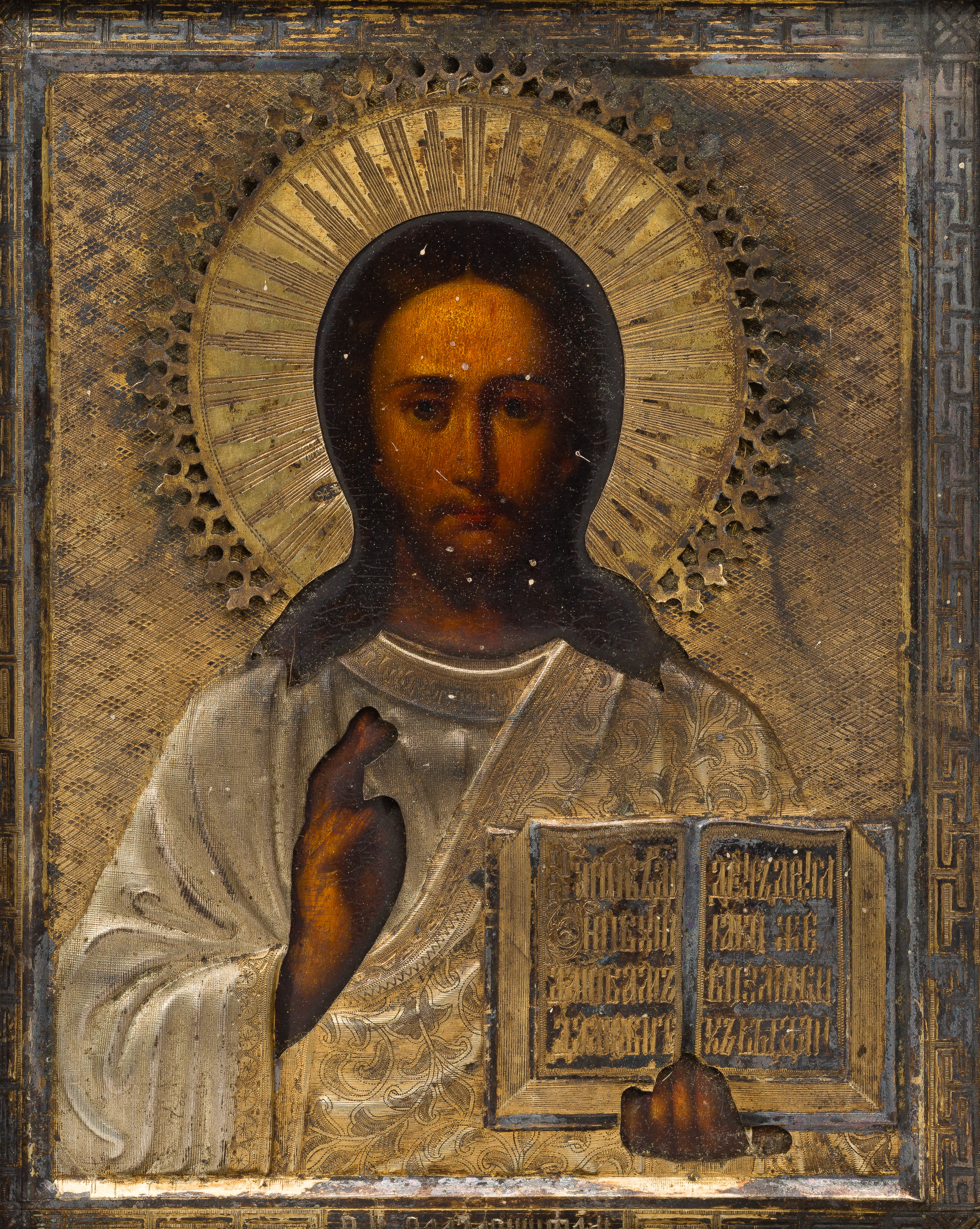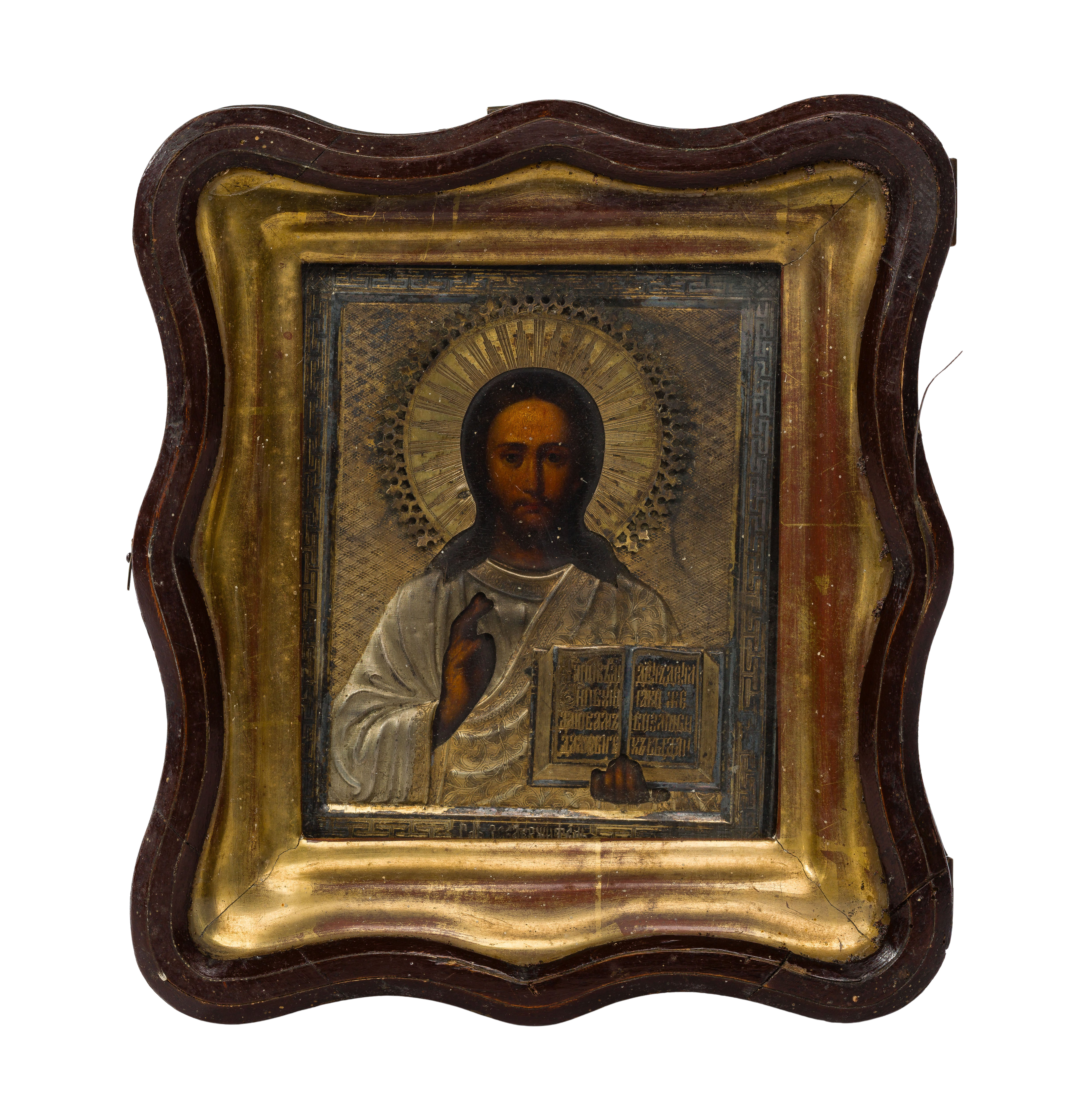 Having an oil on panel of Christ, ruler of all, in brass and silver oklad in a carved gilt wood frame set in a mahogany kiot