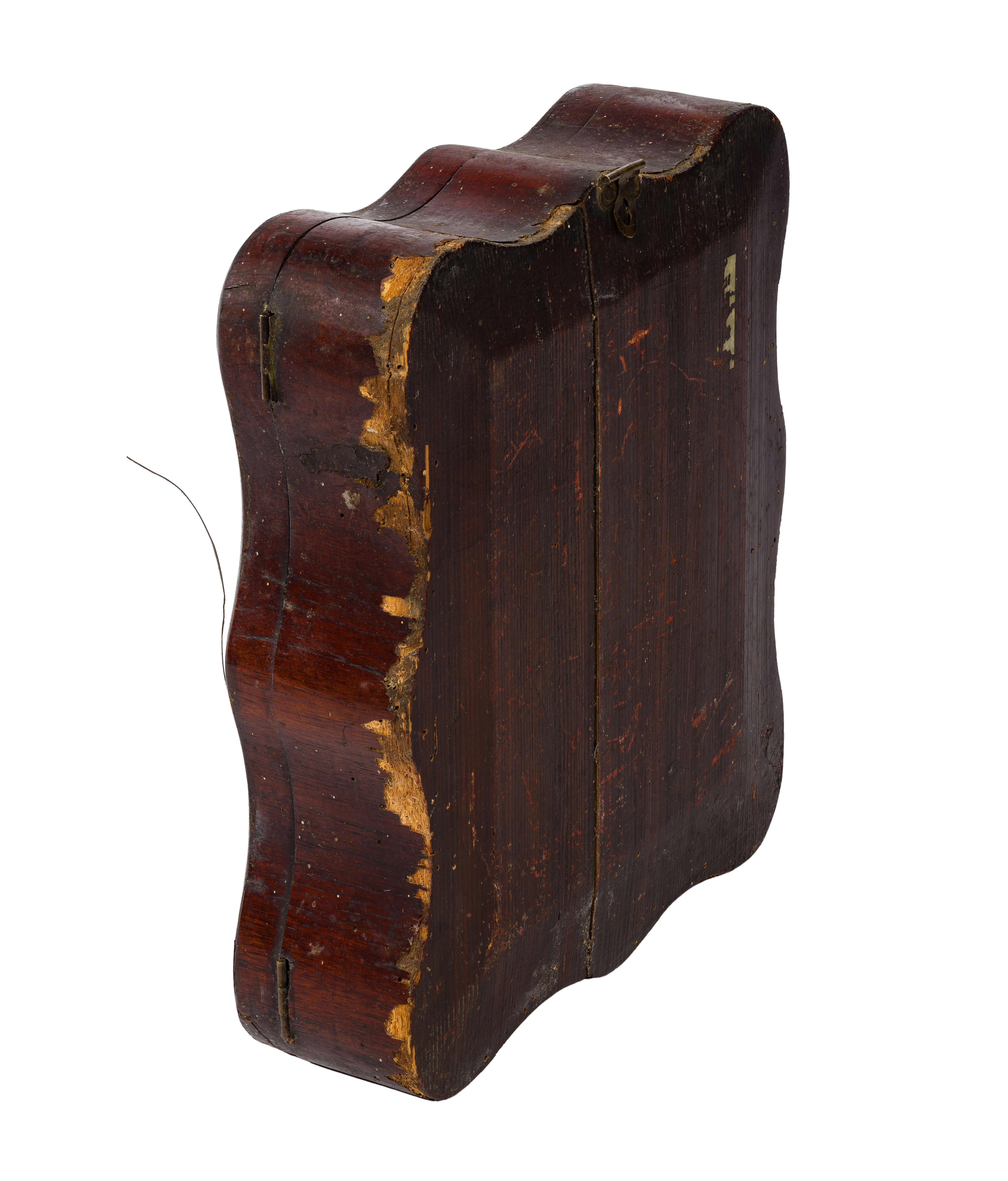overall moderate wear consistent with normal use, tarnish, missing minor areas of paint, dirt accumulation, frame having missing / worn gilt, scratches and nicks, kiot having chipped and missing veneer, wire coming off edge, finish wear, minor cracked glass in corner, cracks on back