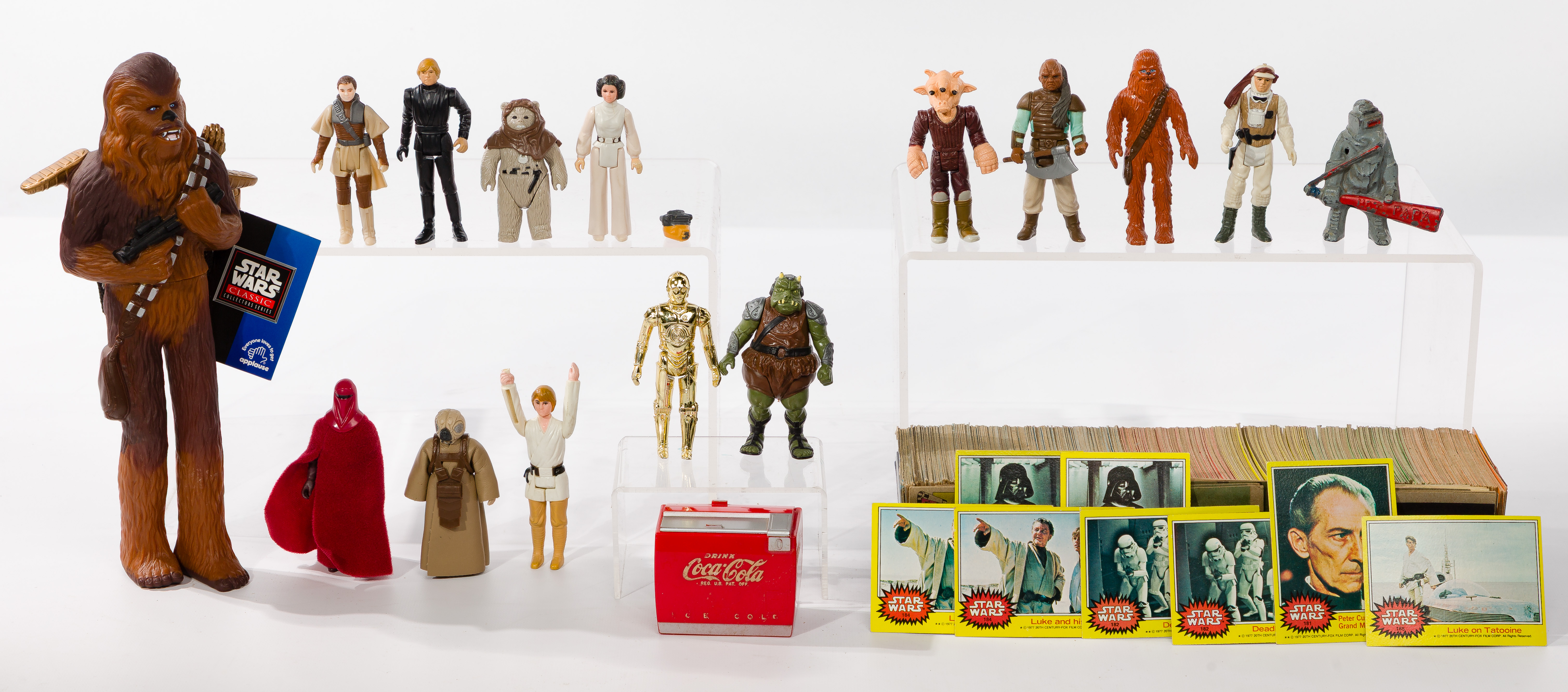 Approximately (30) items including a ‘Hopalong Cassidy’ game, a ‘Stargraph’, a ‘Rudolph the Red Nose Reindeer’ projector, a drinking ‘Picnic Bear’, a Christmas music box, all in original boxes as well as a plastic box of Star Wars Cards, (15) Star Wars figures, (3) metal lunch boxes including ‘Pac Man’, ‘Battlestar Galactica’ and ‘Dukes of Hazzard’, all having matching thermoses and various other items