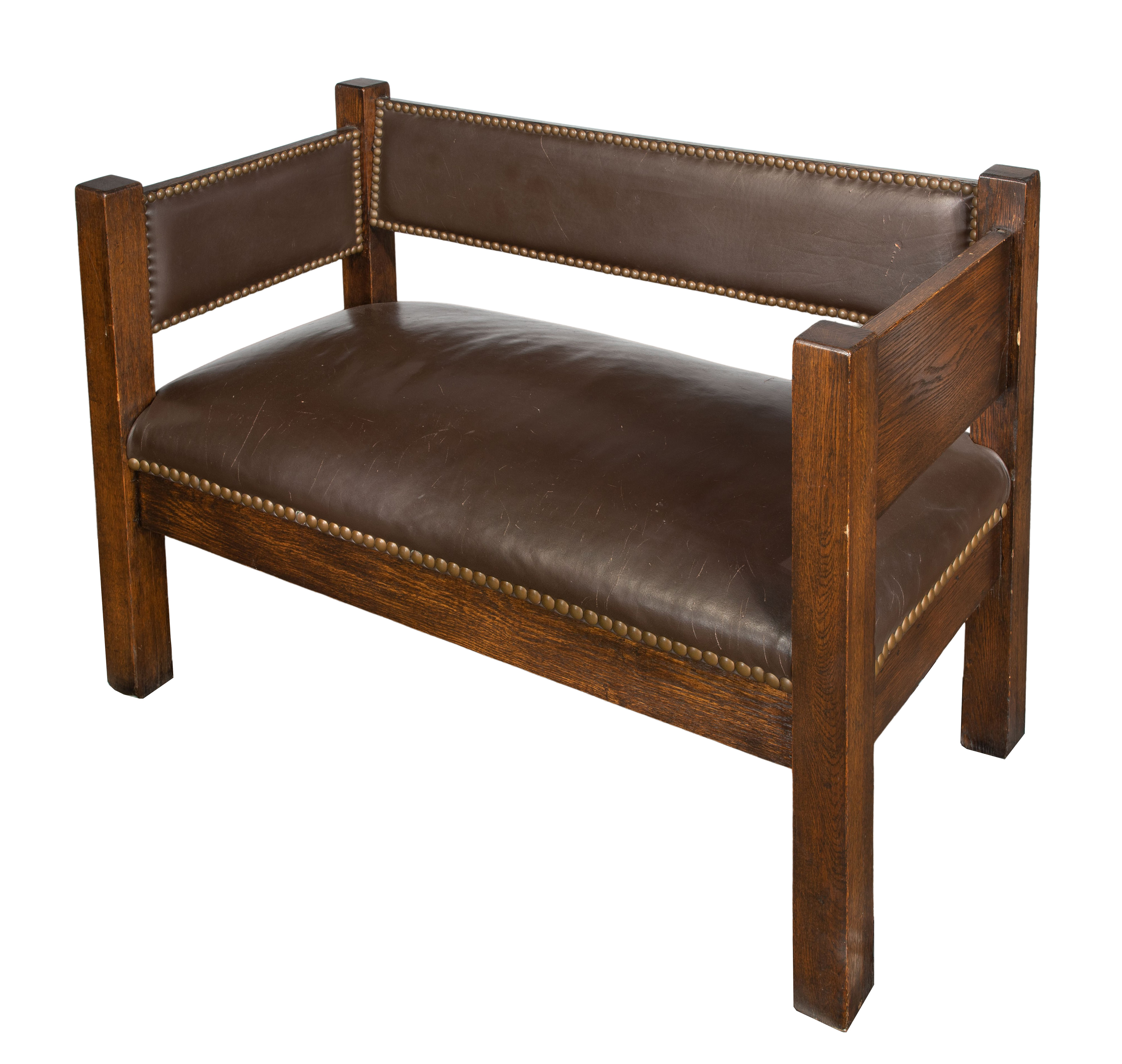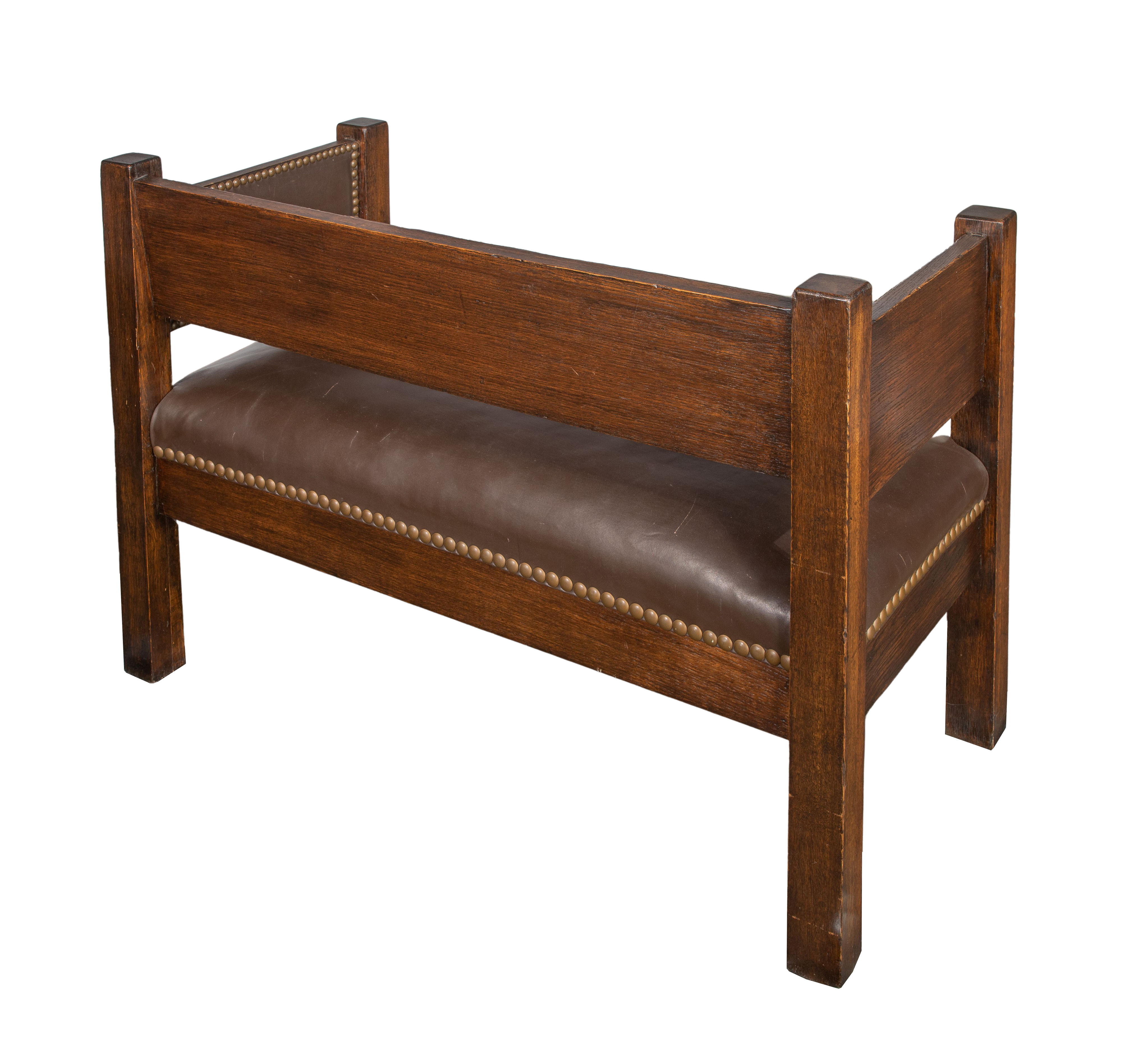 A quarter sawn oak hall bench having square upright legs, a leather upholstered seat and back and nail head trim