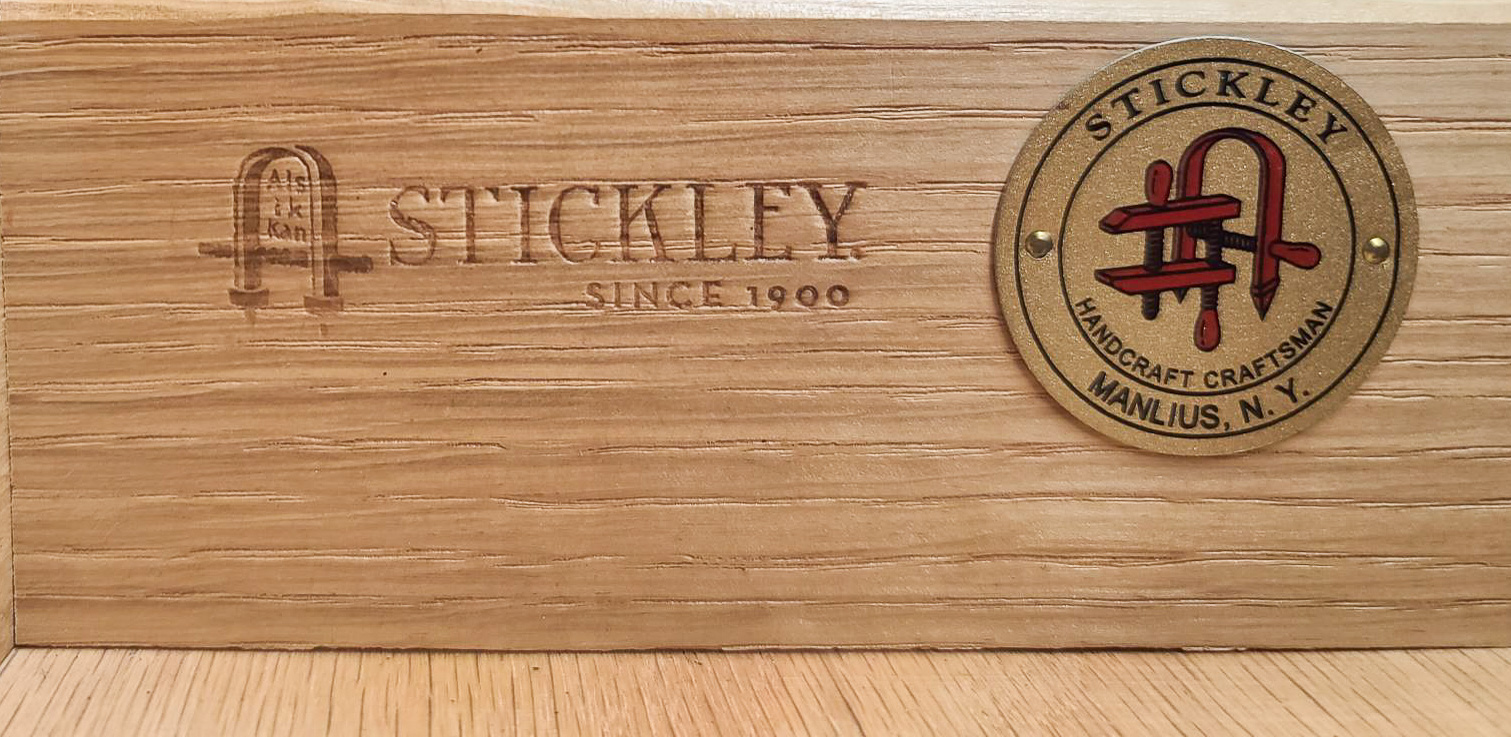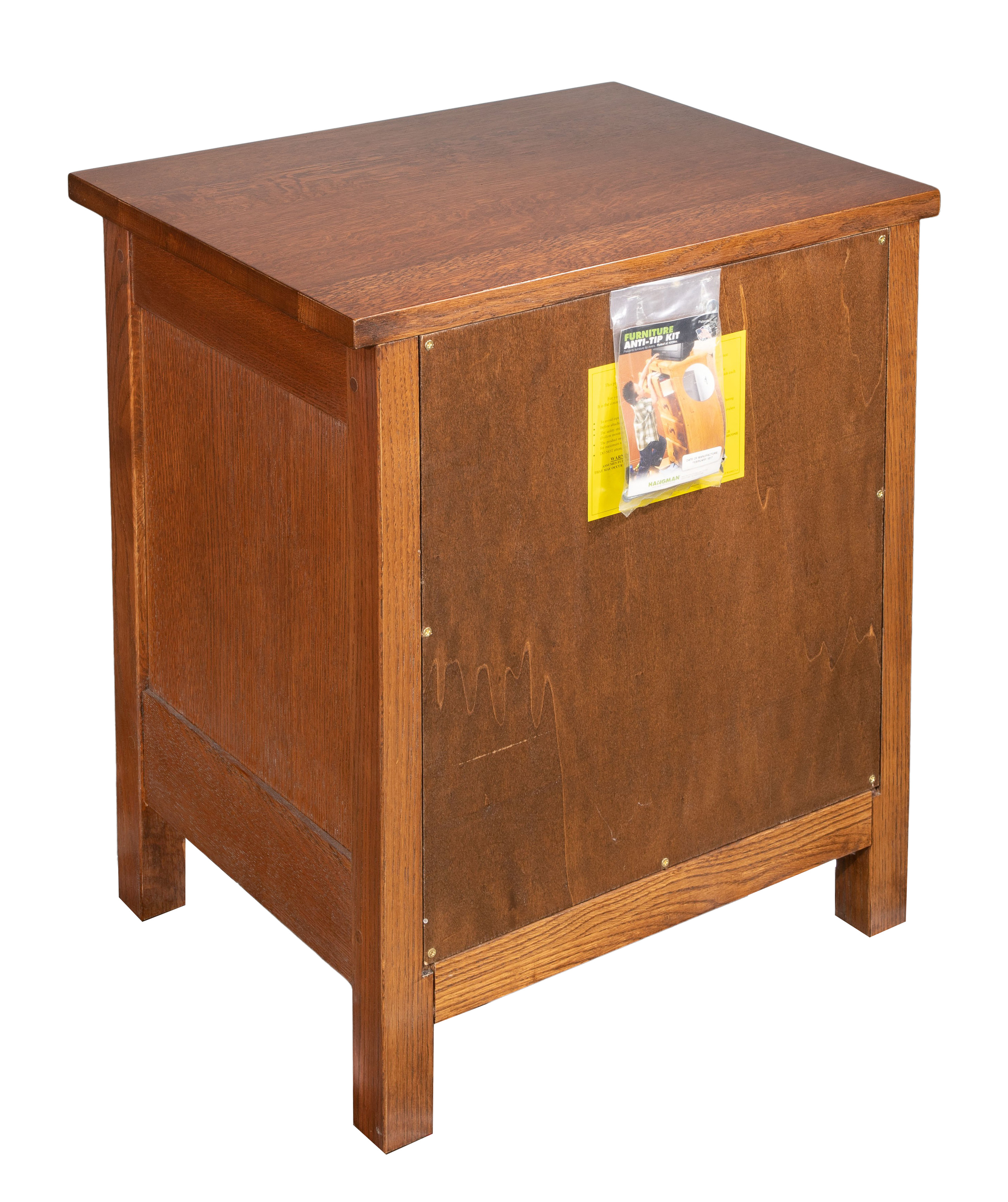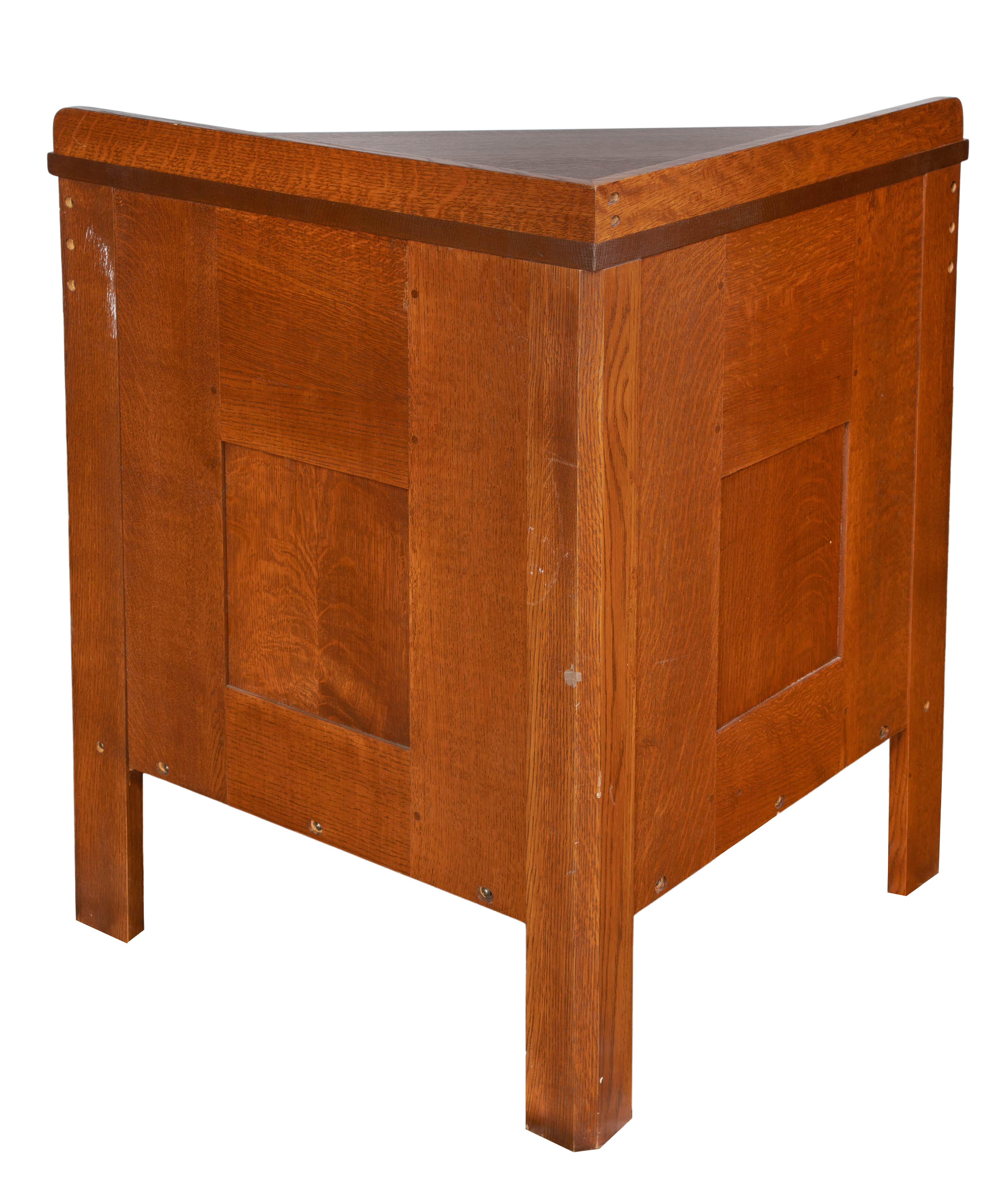 (2) items including a quarter sawn oak corner console and a nightstand having hammered copper hardware, both stamped and having tags