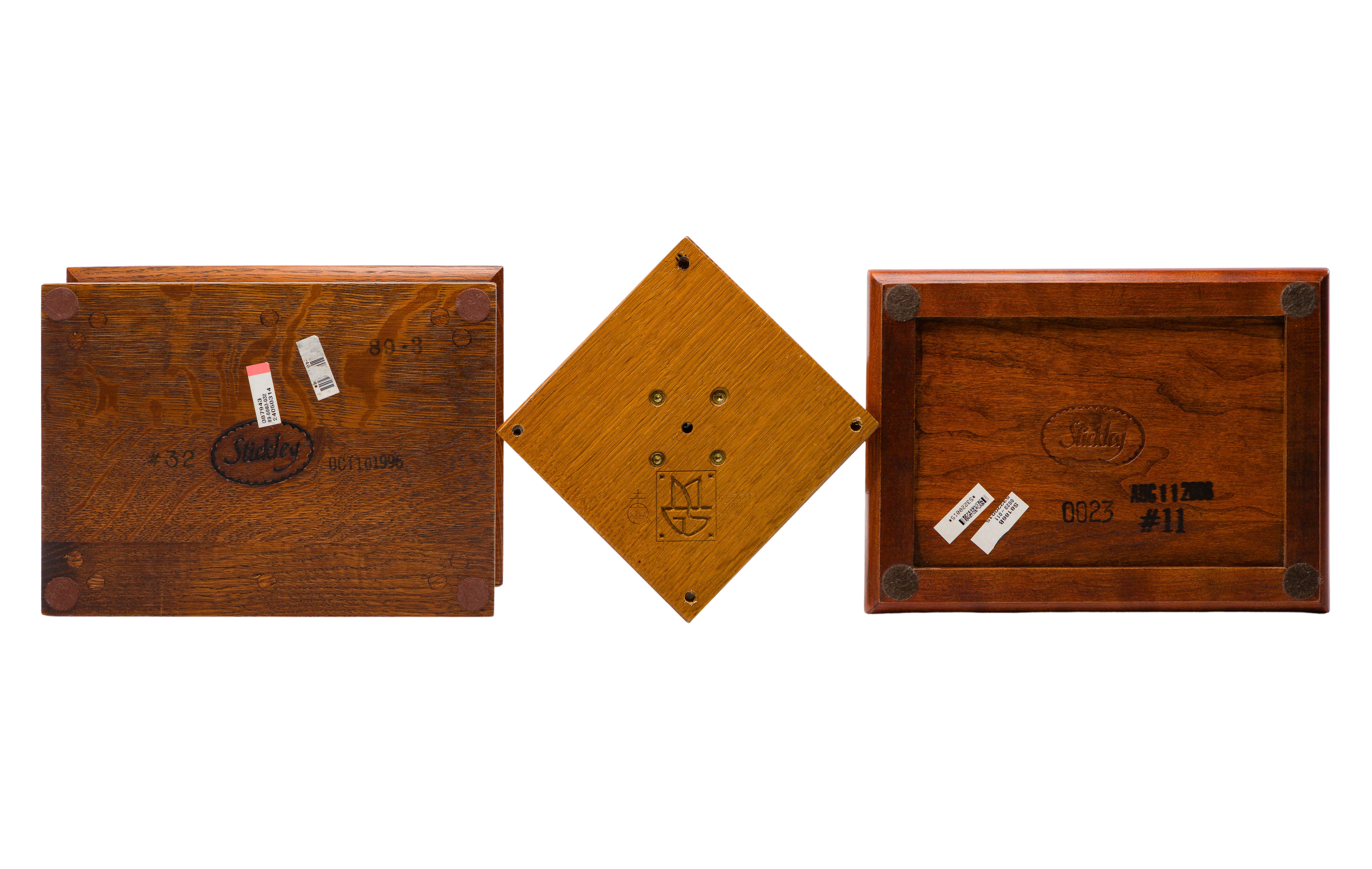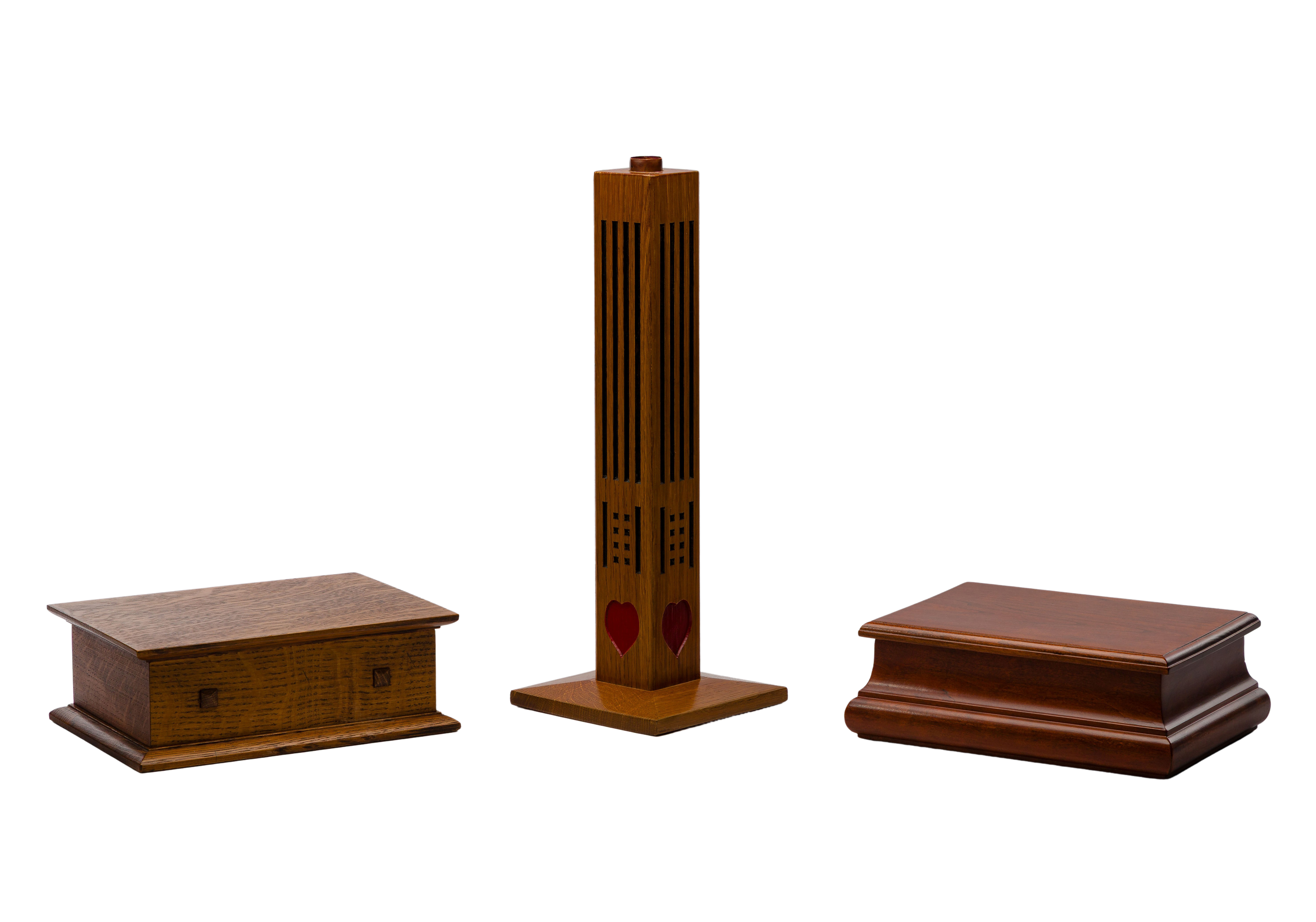 (3) items including (2) hinged lidded boxes, both having oval Stickley brand marks underside, the cherry-stained also having a rubber stamp ‘Aug. 11 2006 / #11’ underside as well as an oak candlestick having a copper insert and a mark underside having a pair of back-to-back Rs in a circle, representing Roycroft Renaissance and associated with Roycrofters-At-Large Association using licensed designs