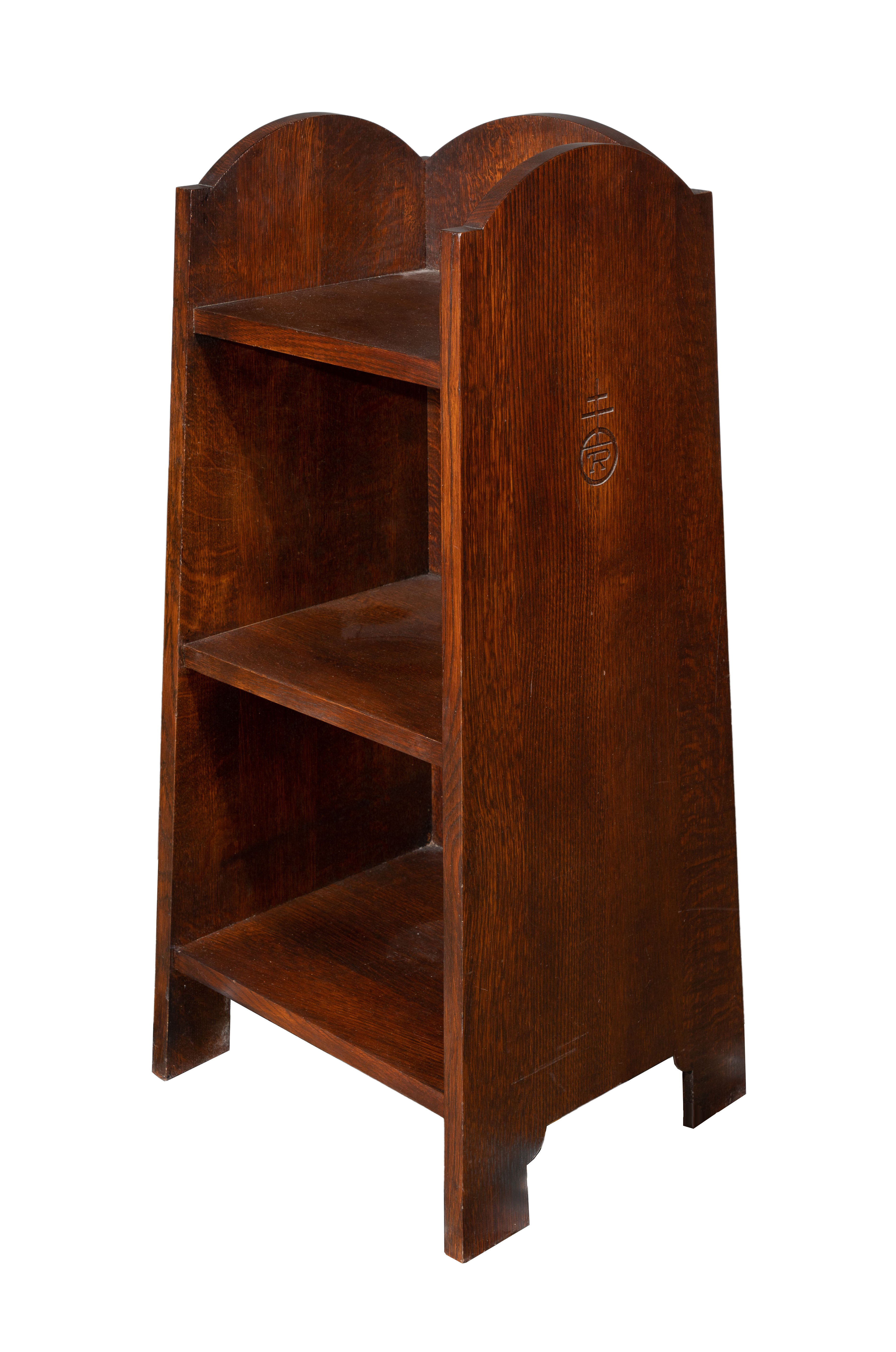 A mission style Roycroft stand by Stickley having oak construction in flared form, three shelves, cut-out feet, maker stamp on sides