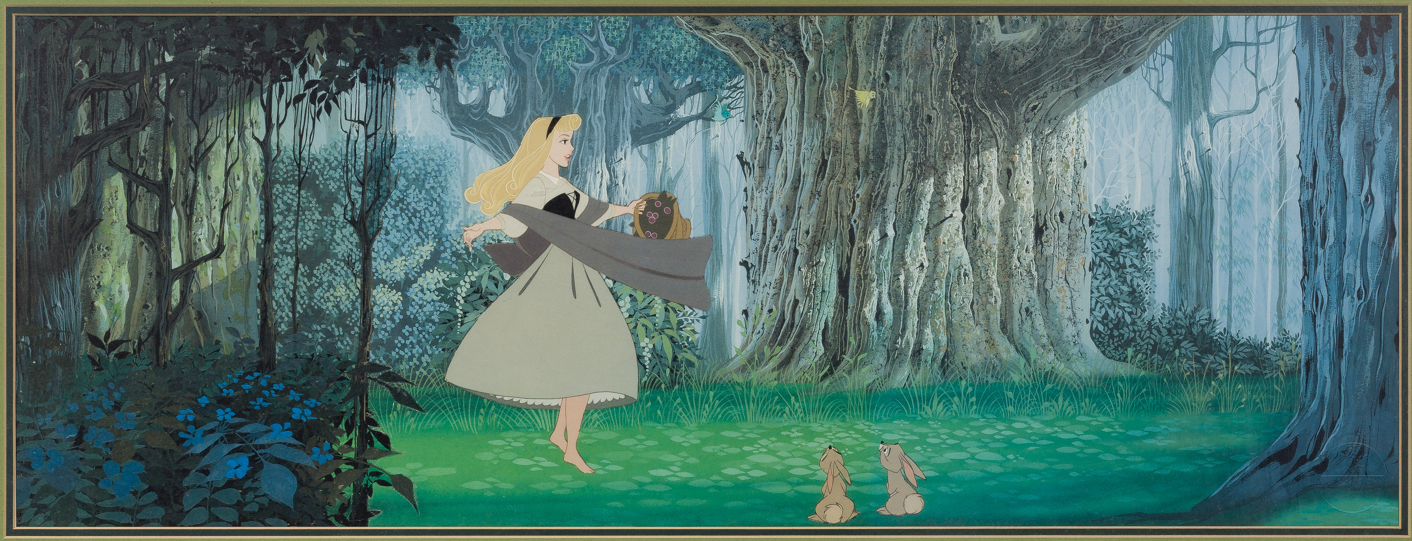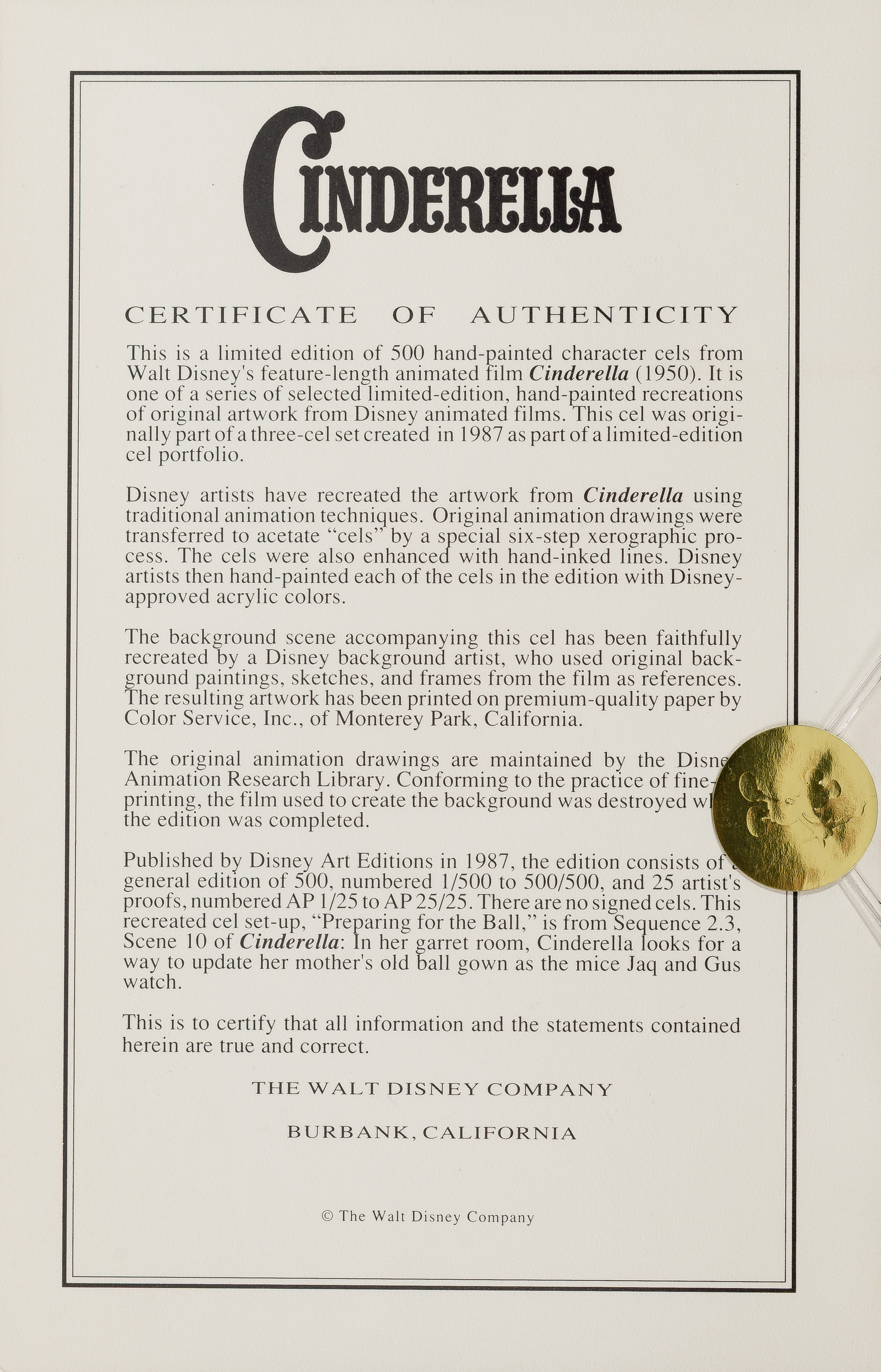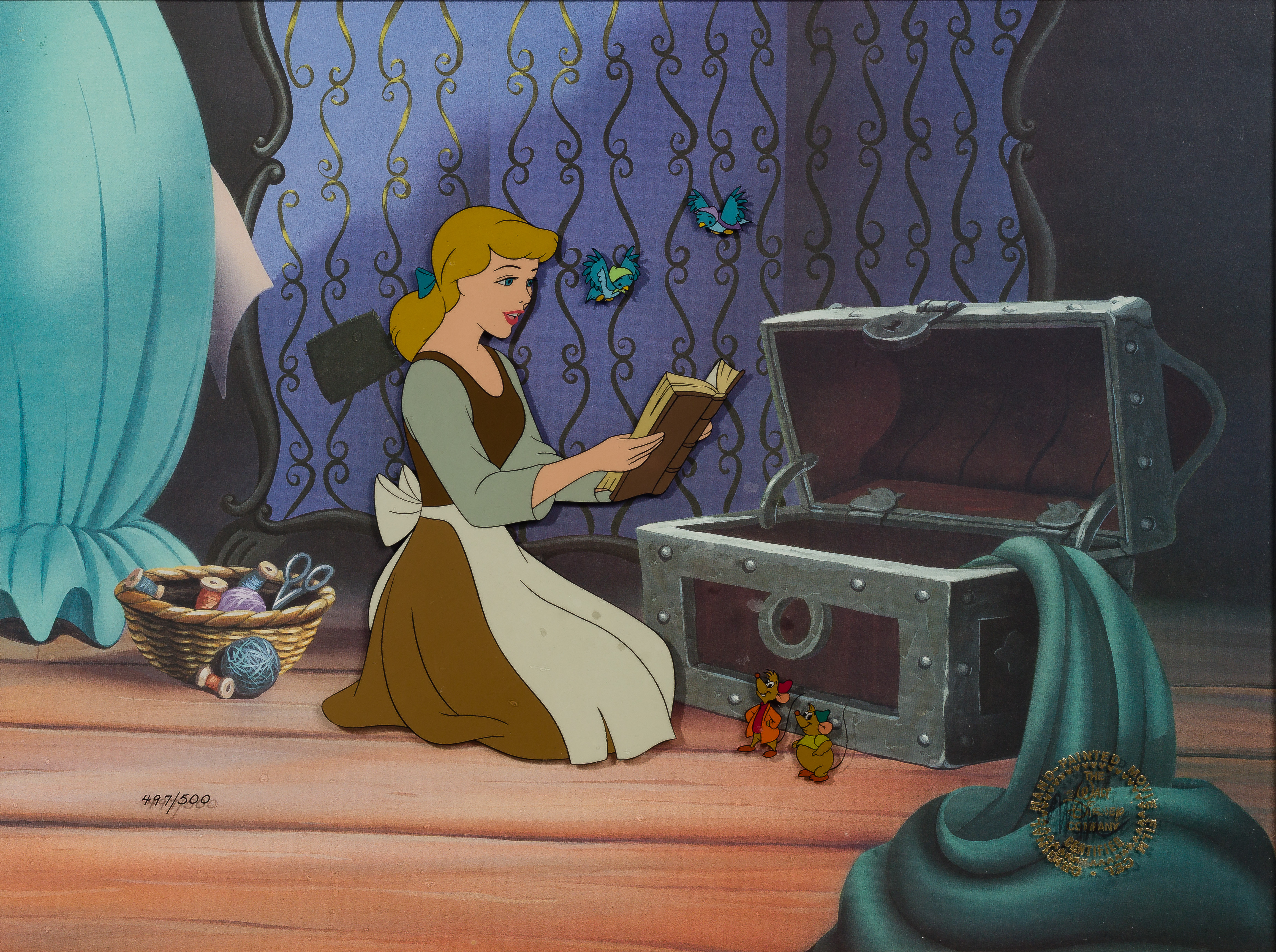 (2) items including a 1987 ‘Cinderella with Mice’ sericel having COA verso and a lithograph of Cinderella in the forest having a blind stamp lower right, both matted under acrylic in wood frames