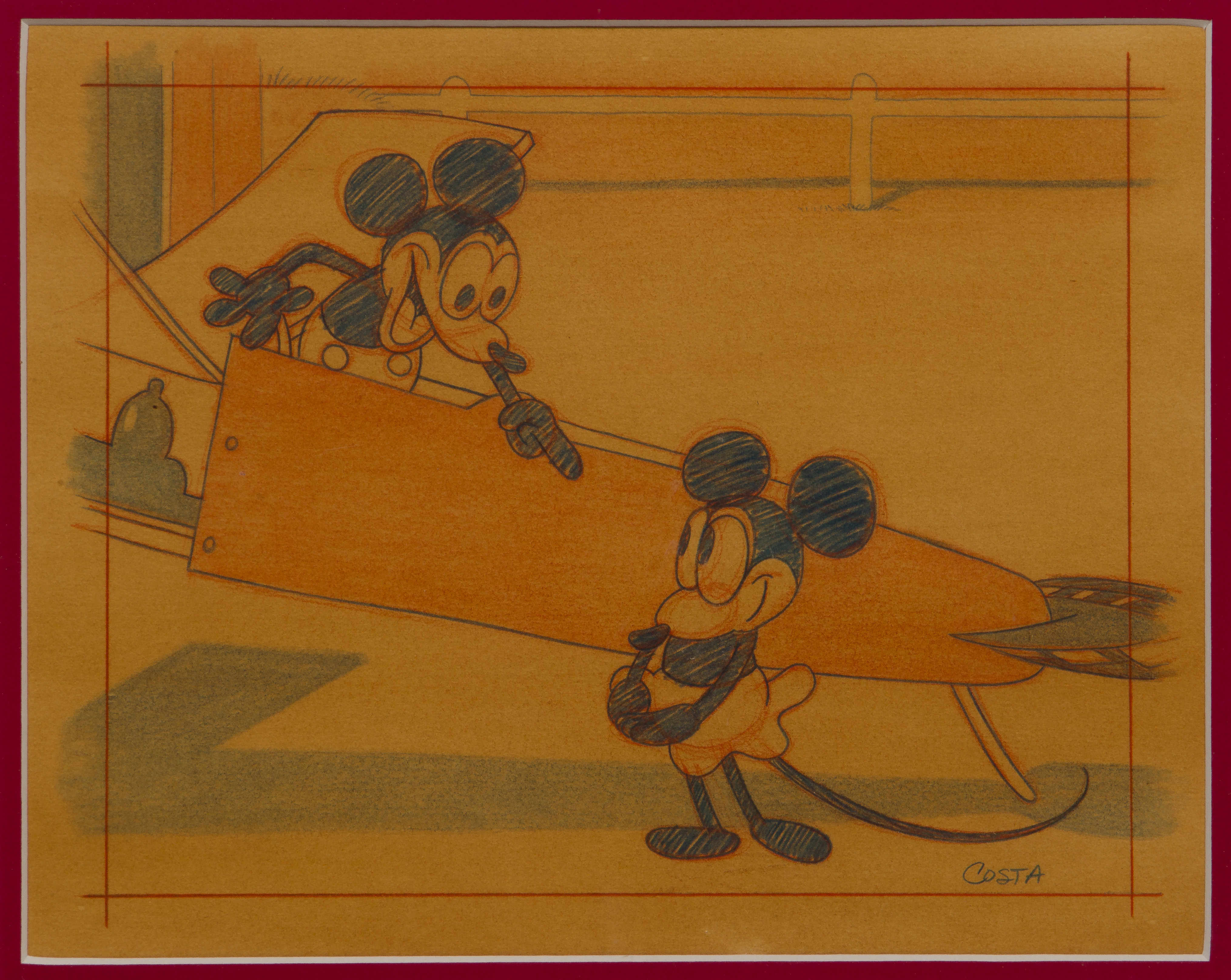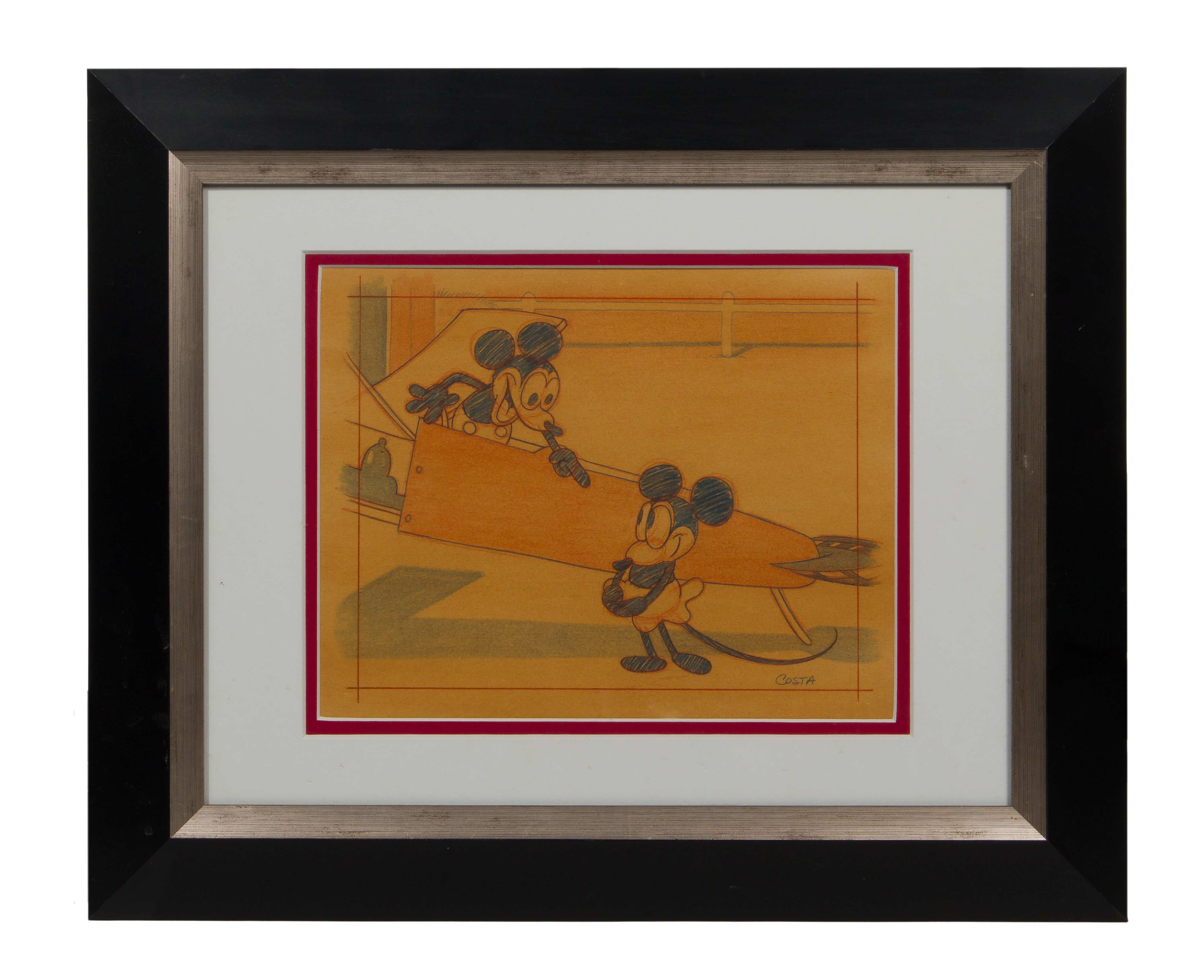 An undated original drawing of Mickey and Minnie Mouse in a plane, signed lower right, inscribed ‘Disney Dreams’ and signed verso, matted under acrylic in a wood frame