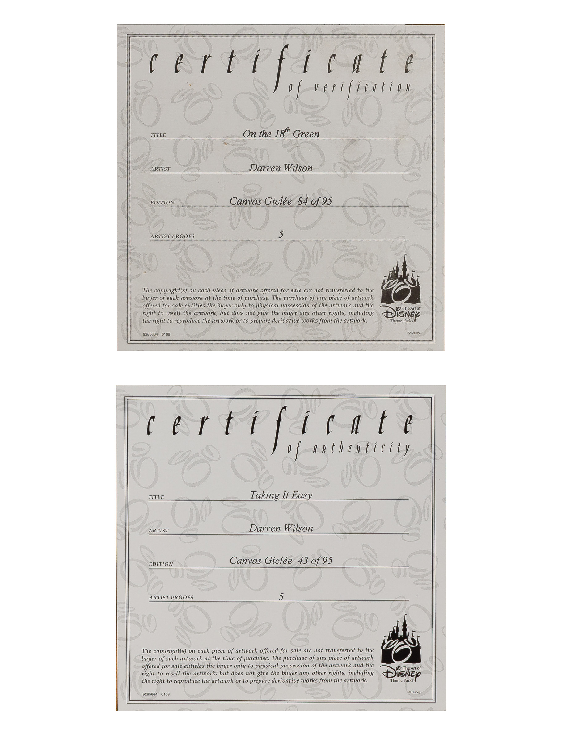 (2) items including ‘On the Green’ signed lower right, #84/95 and ‘Taking it Easy’ signed lower right, #43/95, both having COAs verso, in wood frames