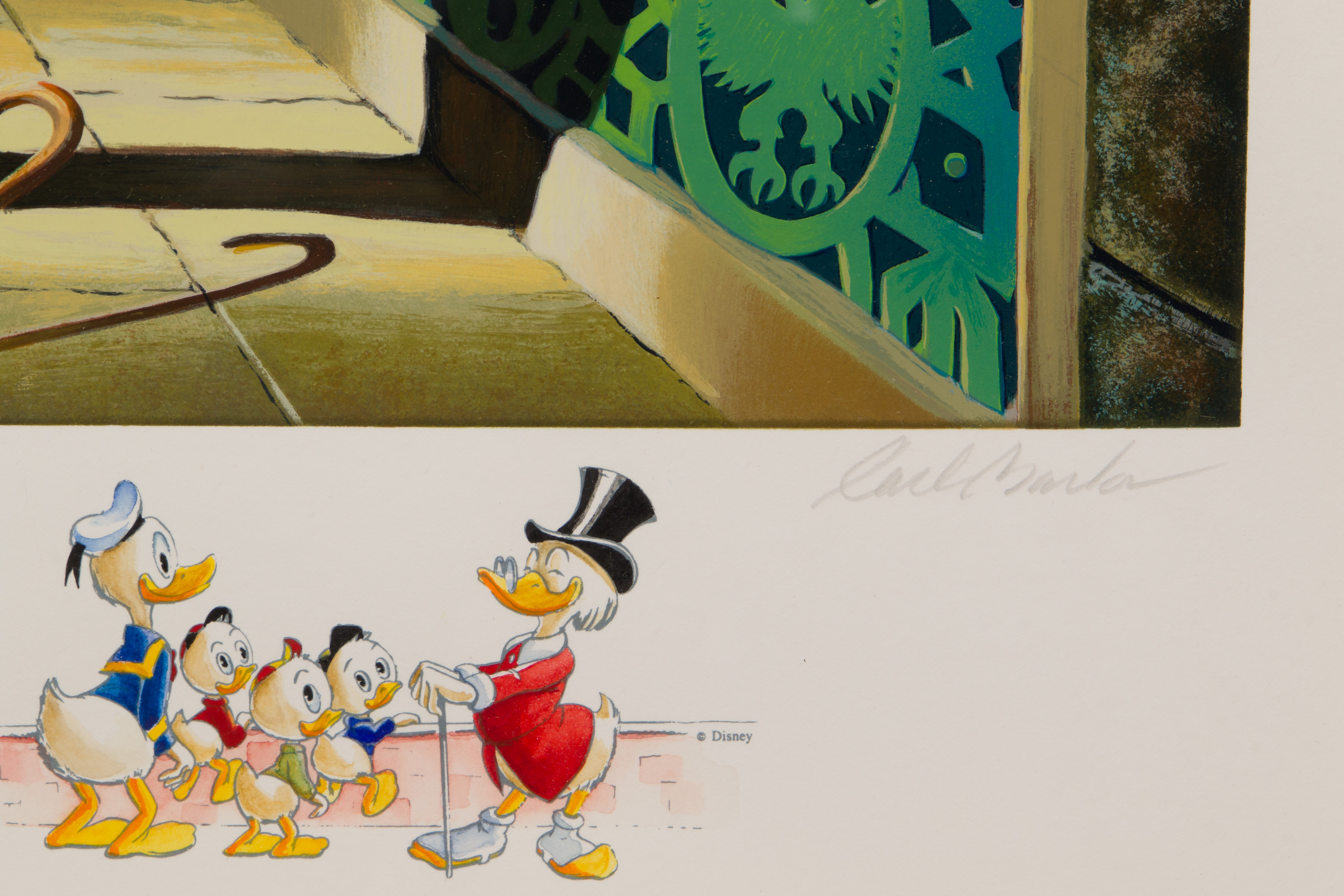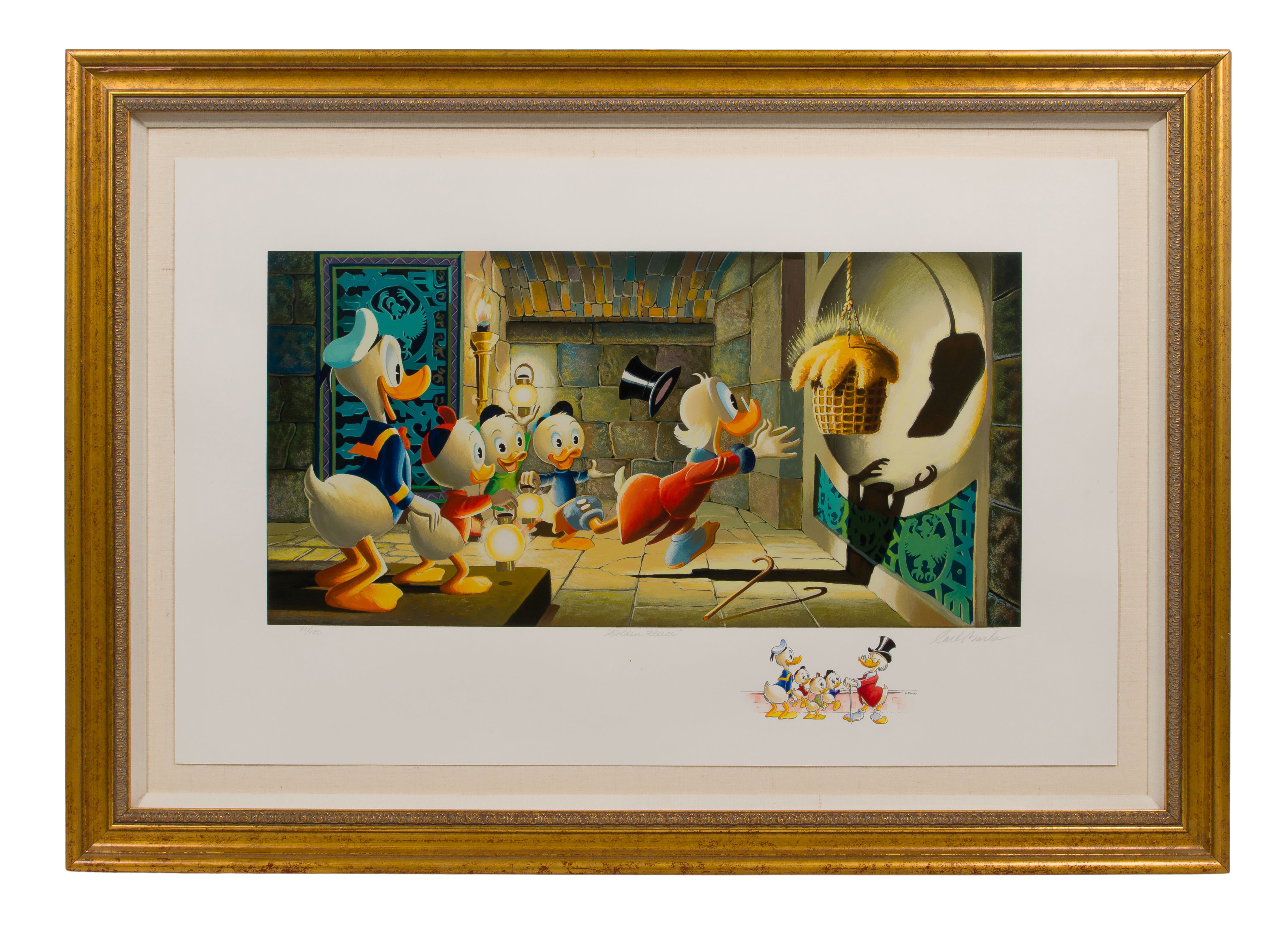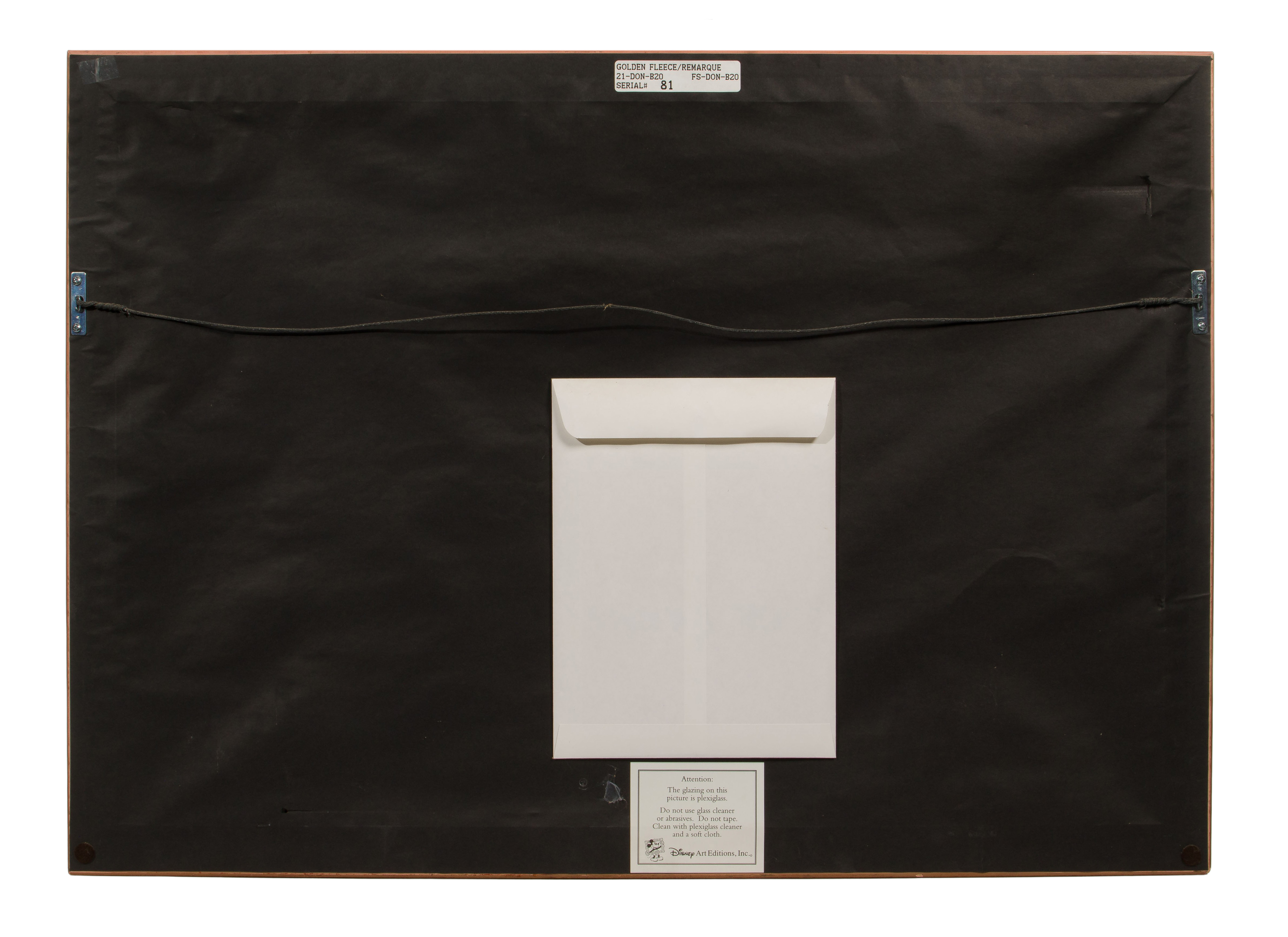 Undated, pencil signed, #81/100, depicting Uncle Scrooge and his nephews finding a golden fleece, COA verso, float matted under acrylic in a gilt gold wood frame