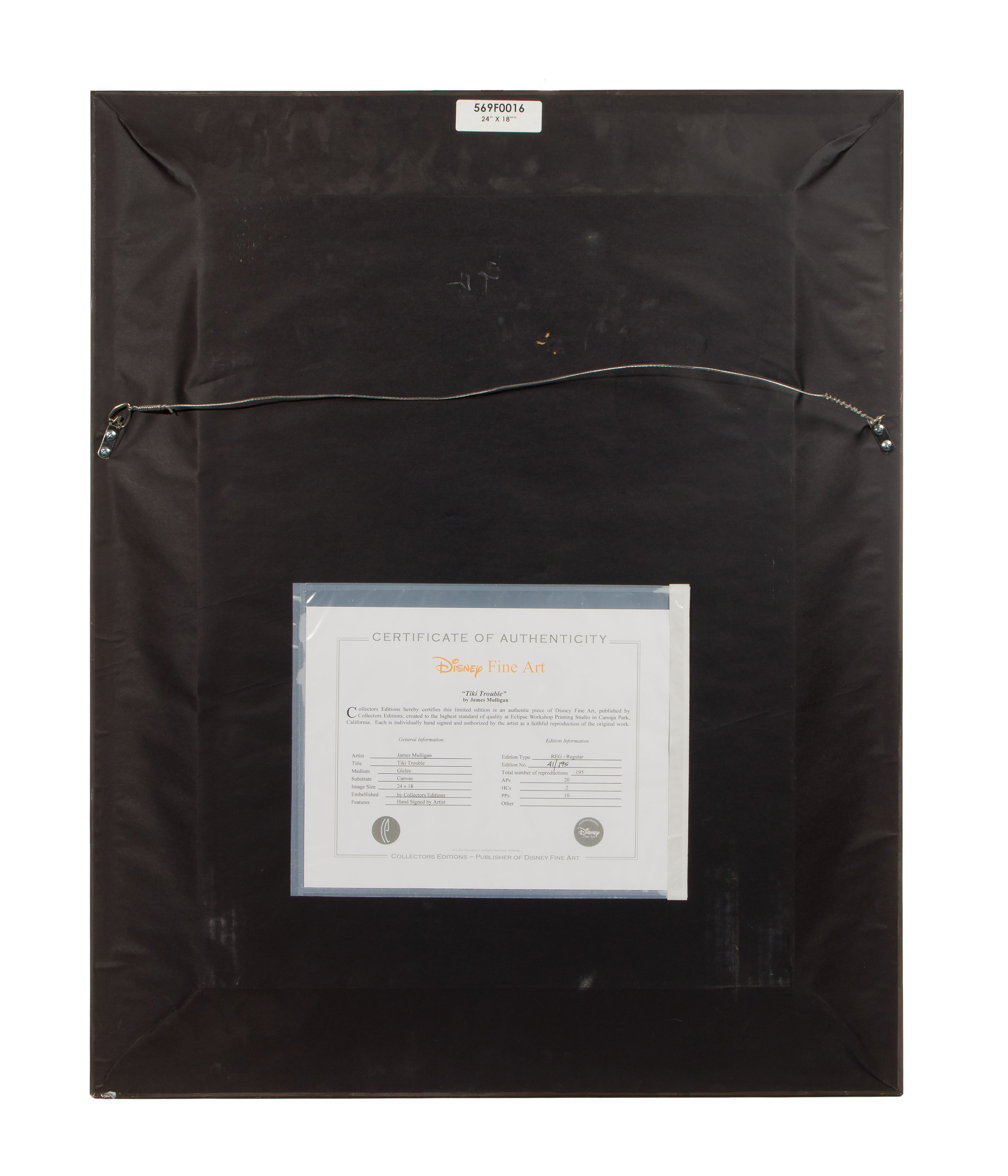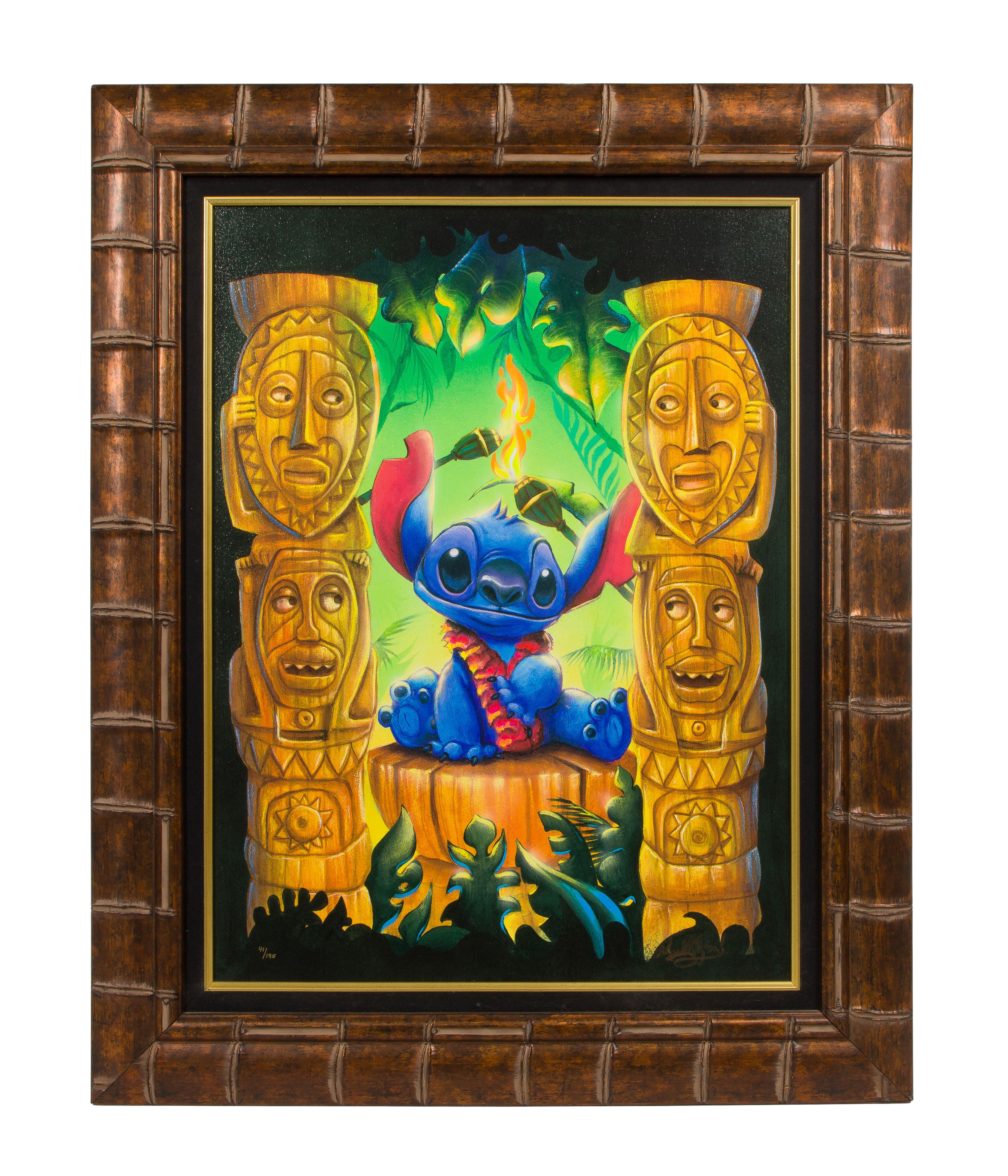 Undated, signed lower right, #41/195, depicting Stitch in the center of a tiki background, matted in a wood frame, COA verso