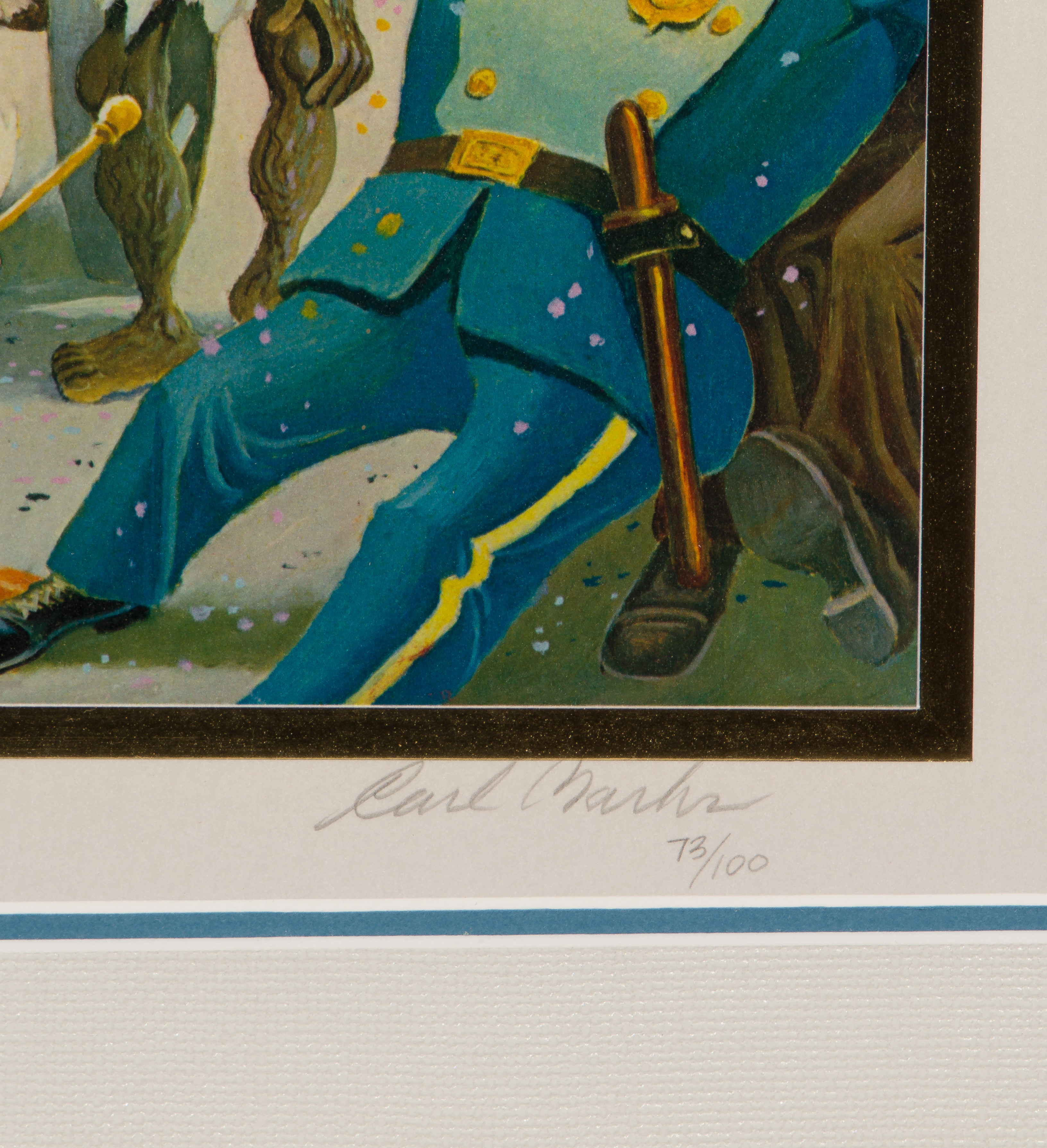 Undated, printed signature lower left in image, pencil signed, #73/100 lower right on printed mat, double matted behind acrylic in a black painted wood frame having COA attached verso