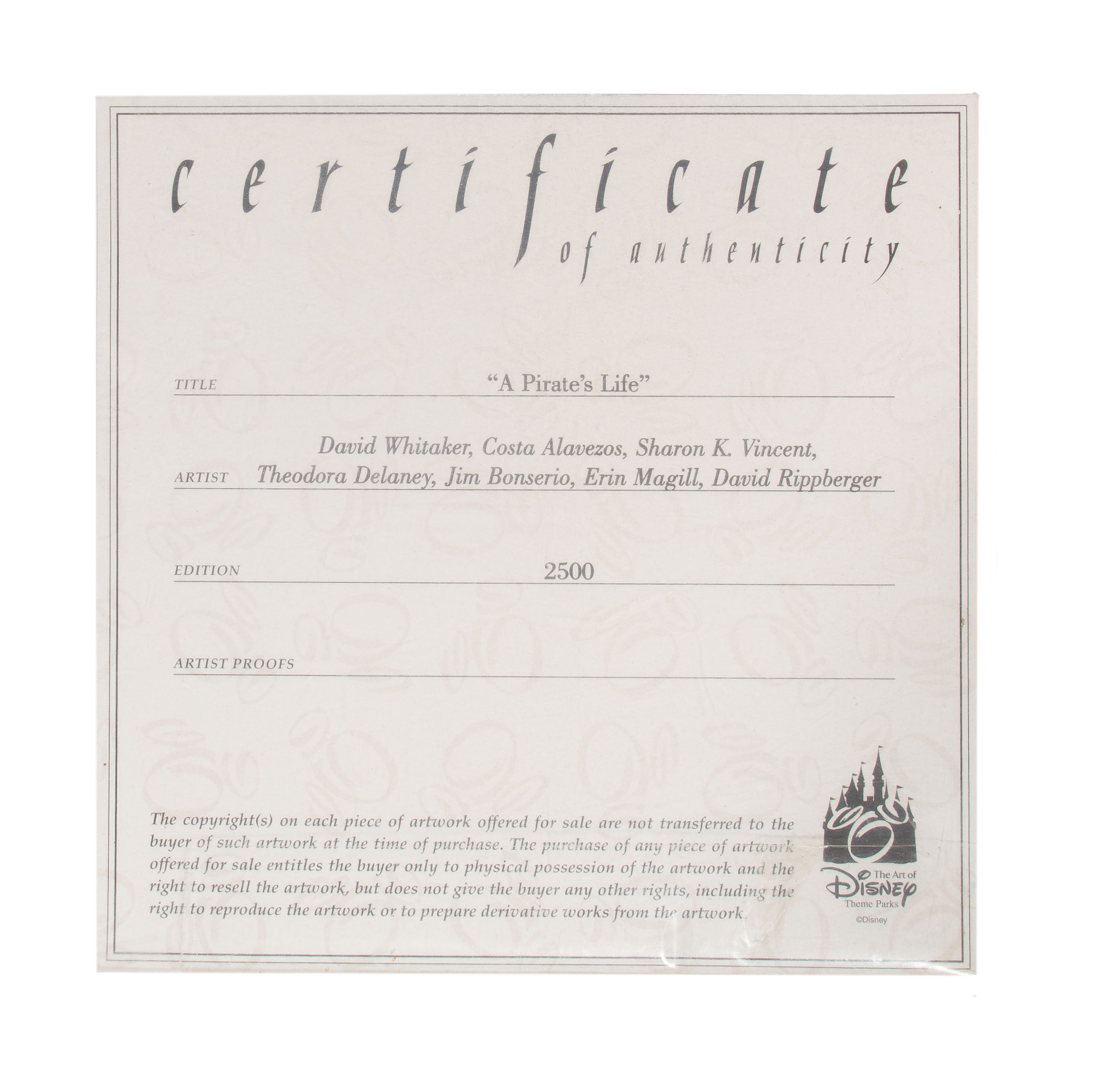 (2) items including a 2007 ‘A Pirate’s Life’ from an edition of 2500, having COA, and a 2006 ‘Defend-Ears of the Kingdom’, both matted behind acrylic in black wood frames