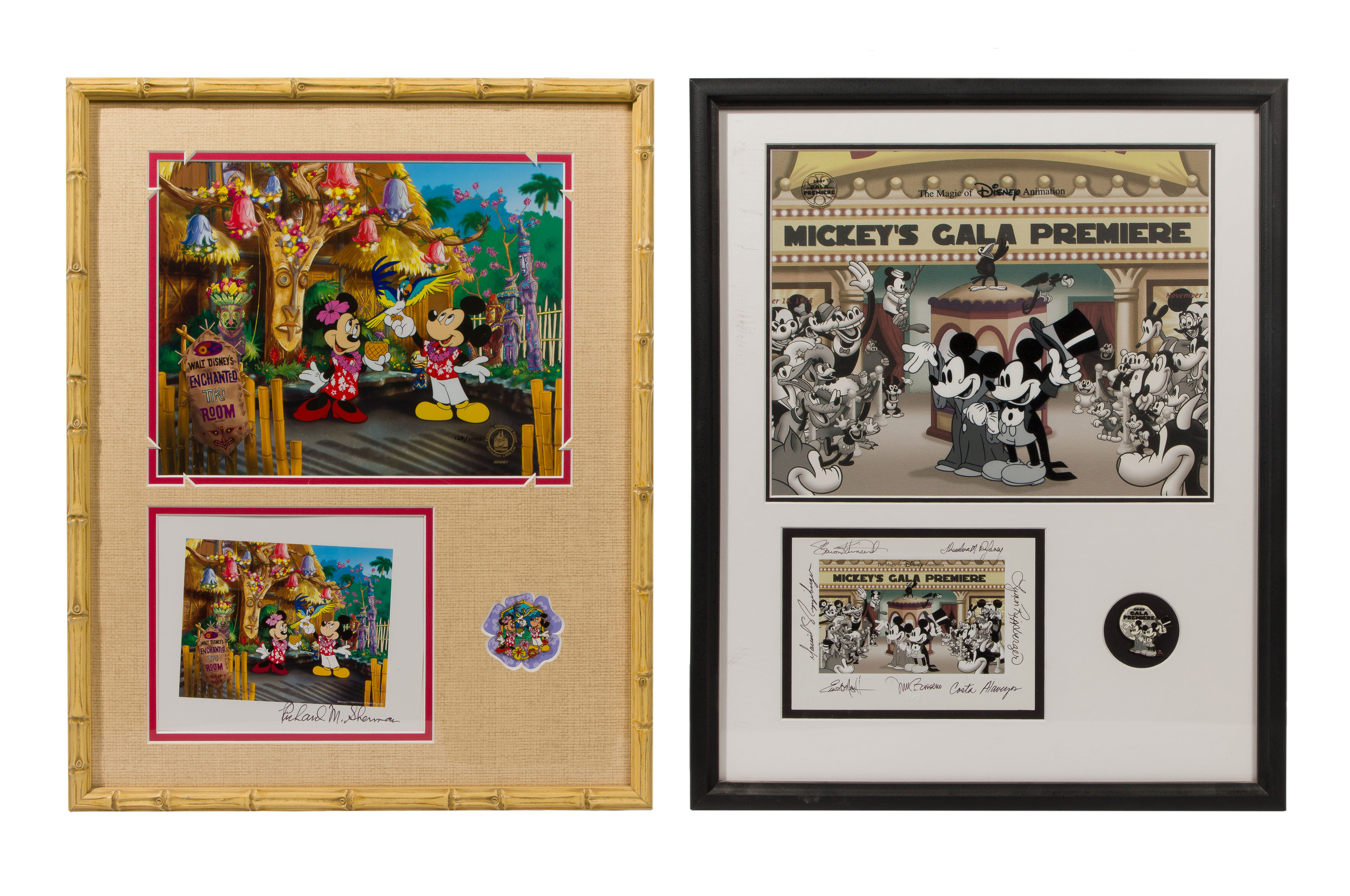 (2) items including a 2008 ‘Enchanted Tiki Room’, #128/1000, matted behind acrylic in a faux bamboo painted wood frame having an Acme Archives COA attached verso and ‘Mickey’s Gala Premier’, matted behind acrylic in a black wood frame