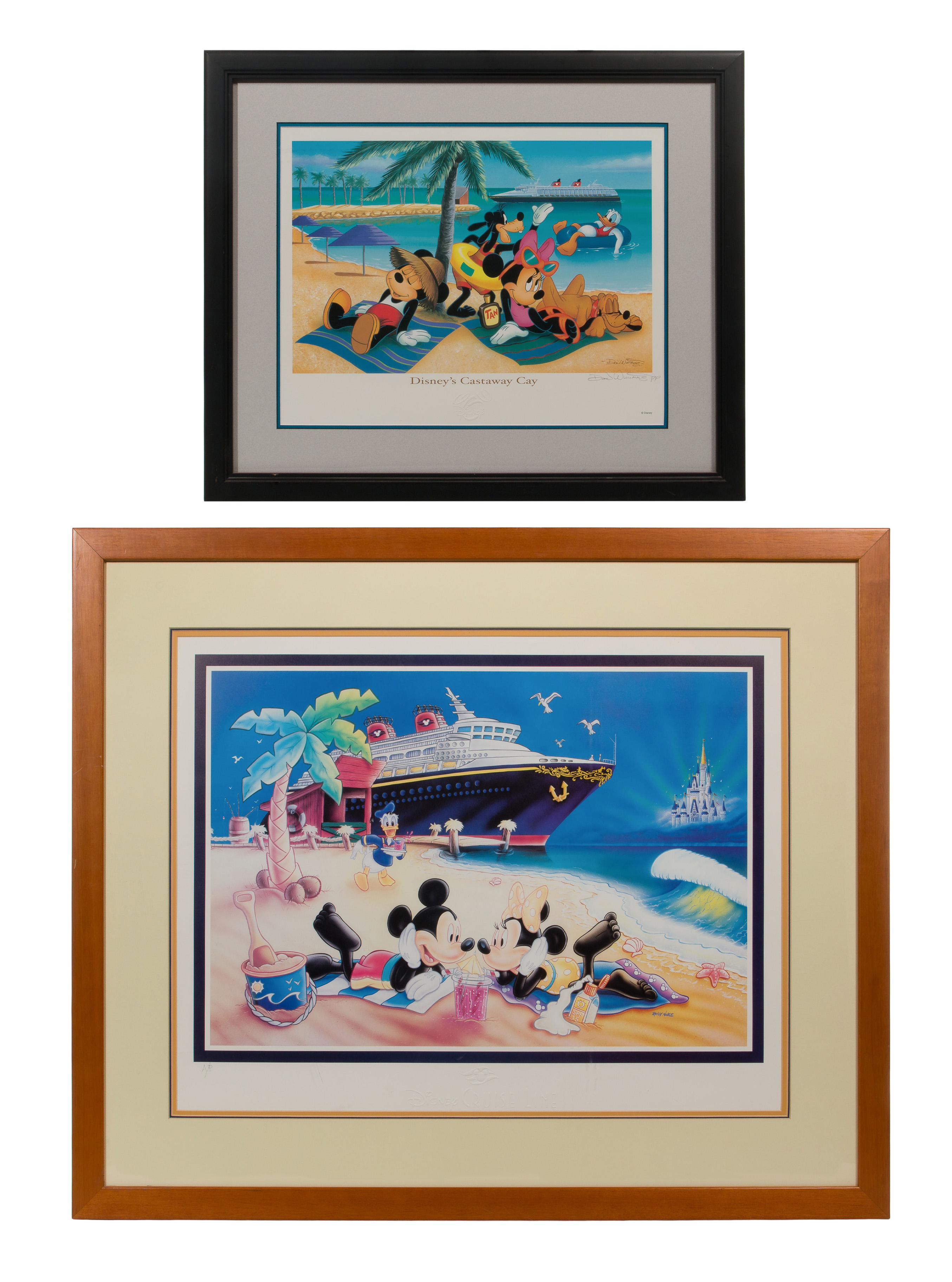 (2) lithographs including a larger by Randy Noble and a smaller by Don Williams, both signed, depicting the Disney characters enjoying the beach and a cruise ship in the background, Disney Cruise lines embossed in margins, matted under acrylic in wood frames