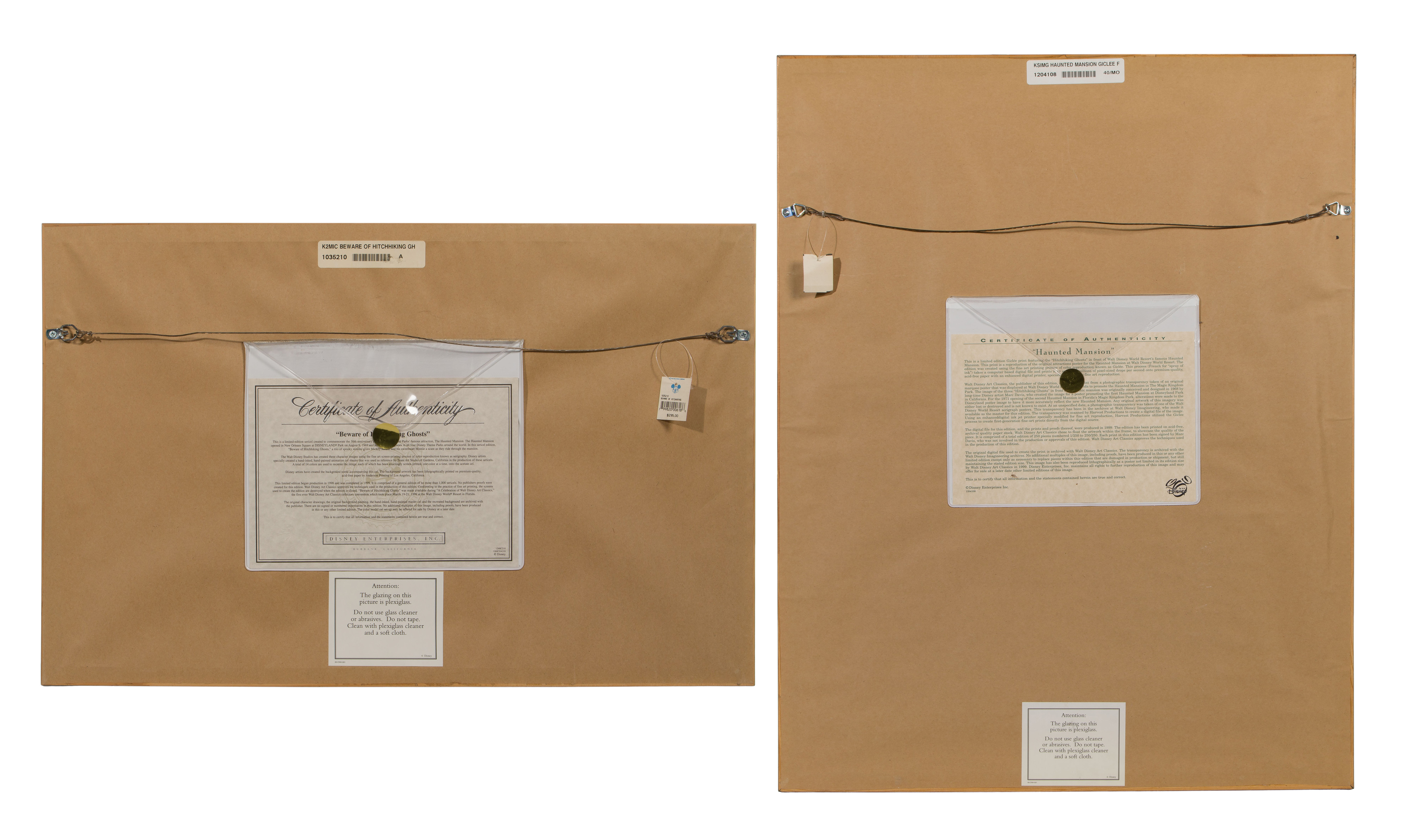 (2) items including an autographed sericel ‘Beware of the Hitchhiking Ghosts’ as well as a ‘Haunted Mansion’ giclee, signed ‘Marc Davis’, #40/250, having Disney Productions stamp, float matted under acrylic in wood frames, COAs verso