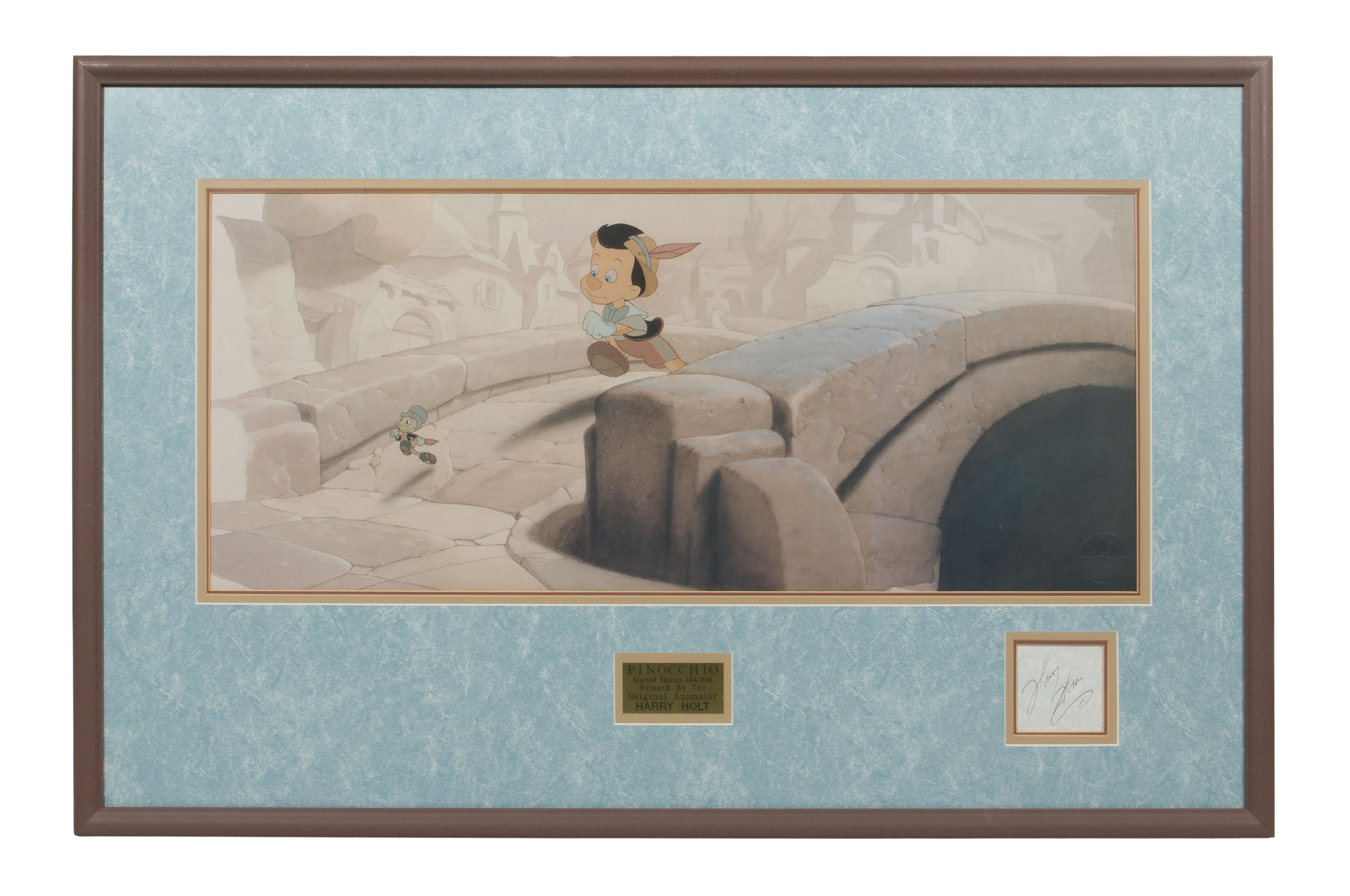 Having an artist plaque and signature in mat cut-out, #134/300, depicting Pinocchio and Jiminy Cricket running over a bridge, matted under acrylic in a wood frame