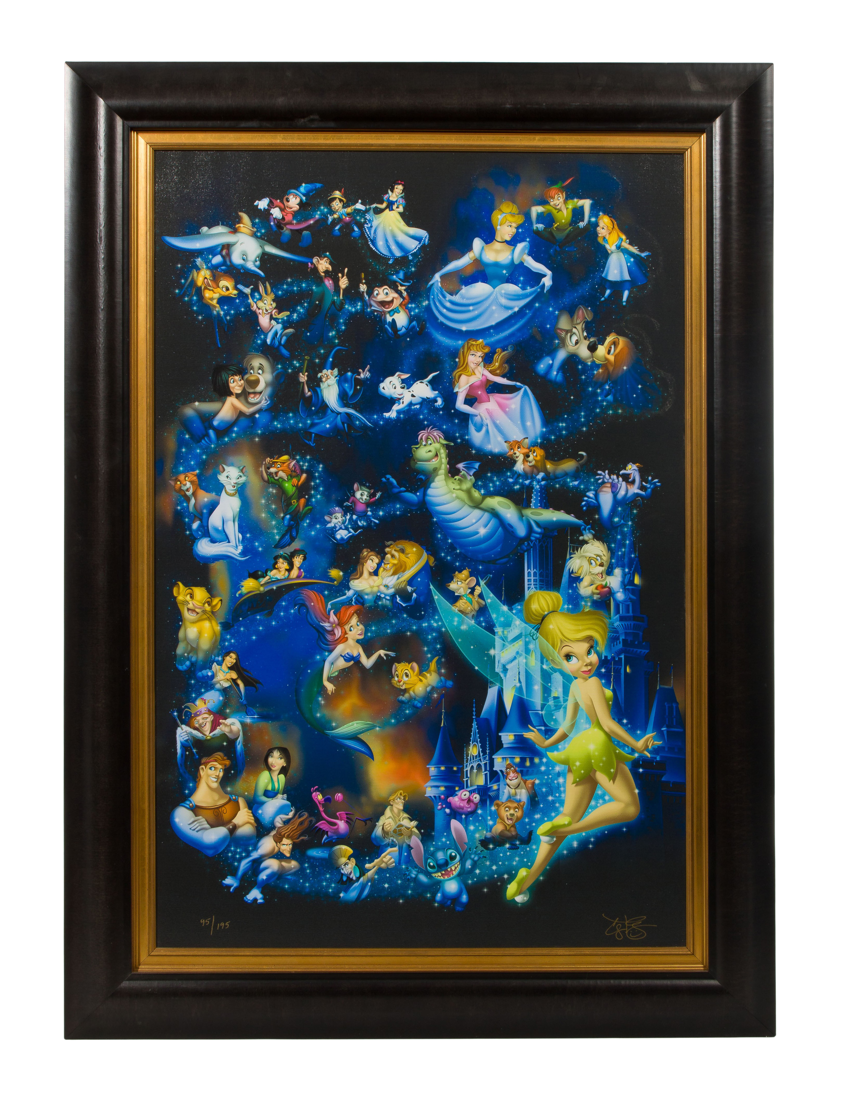 2007, signed lower right, #95/195, depicting the many Disney animated leading characters, in a wood frame