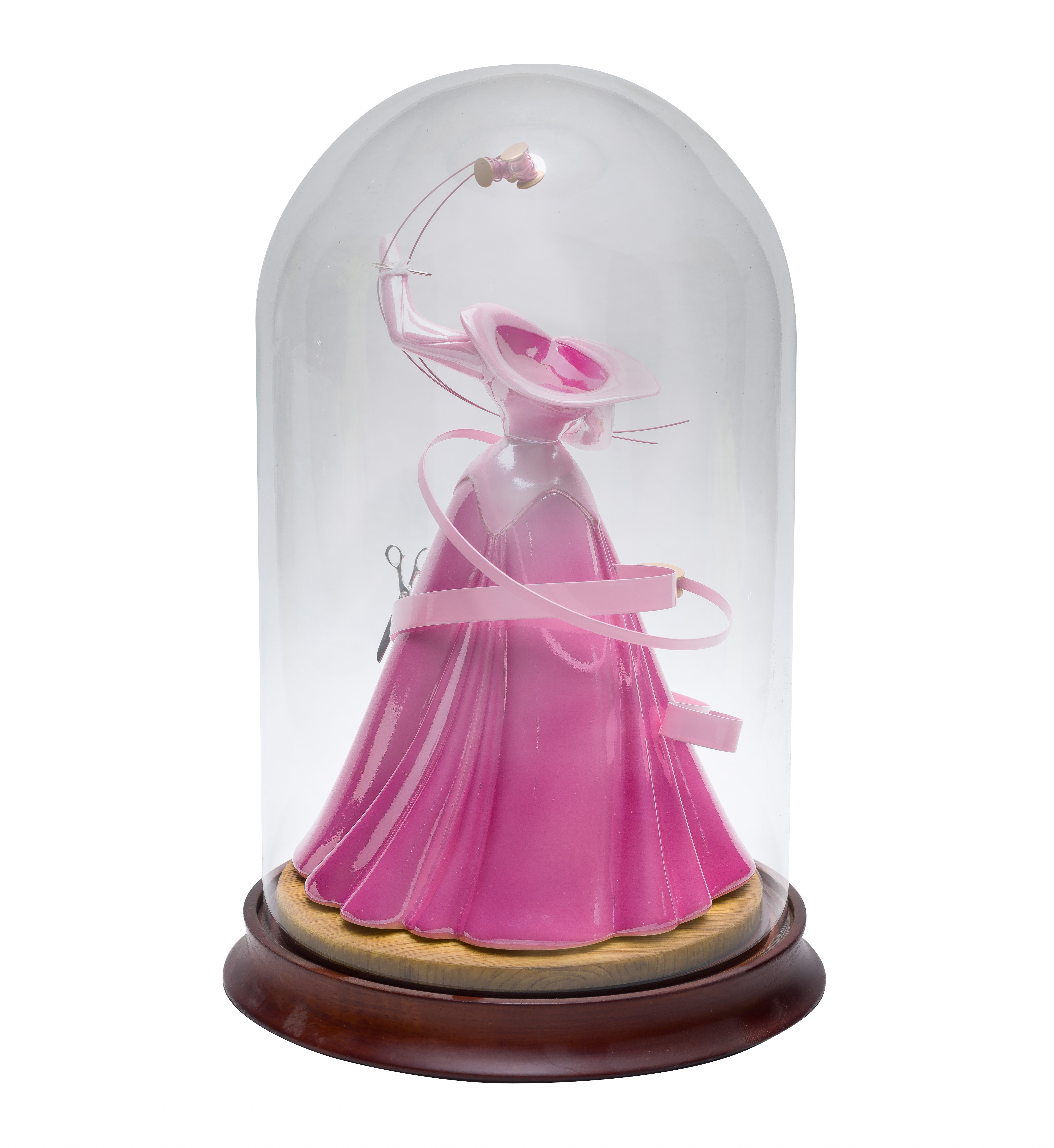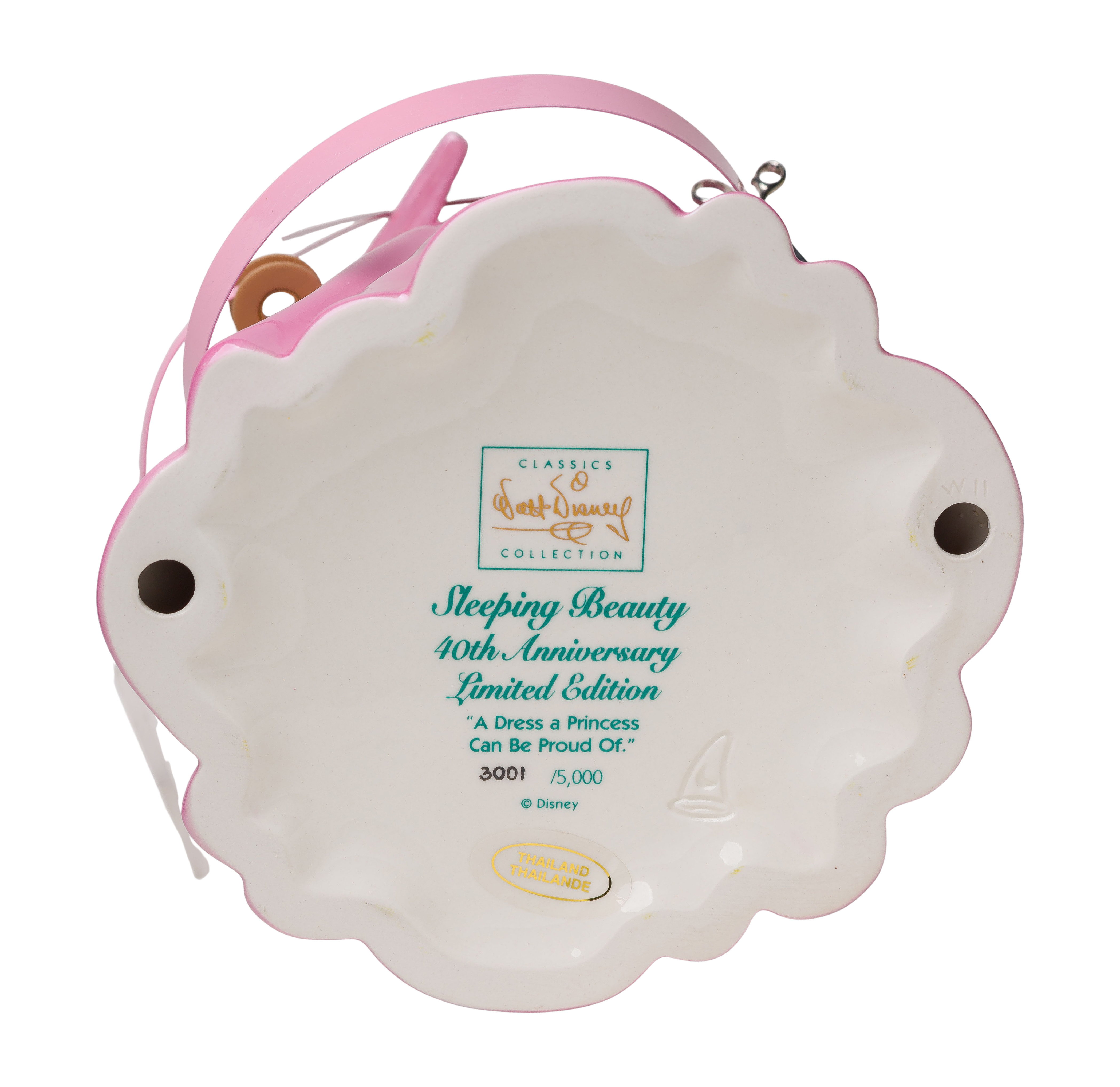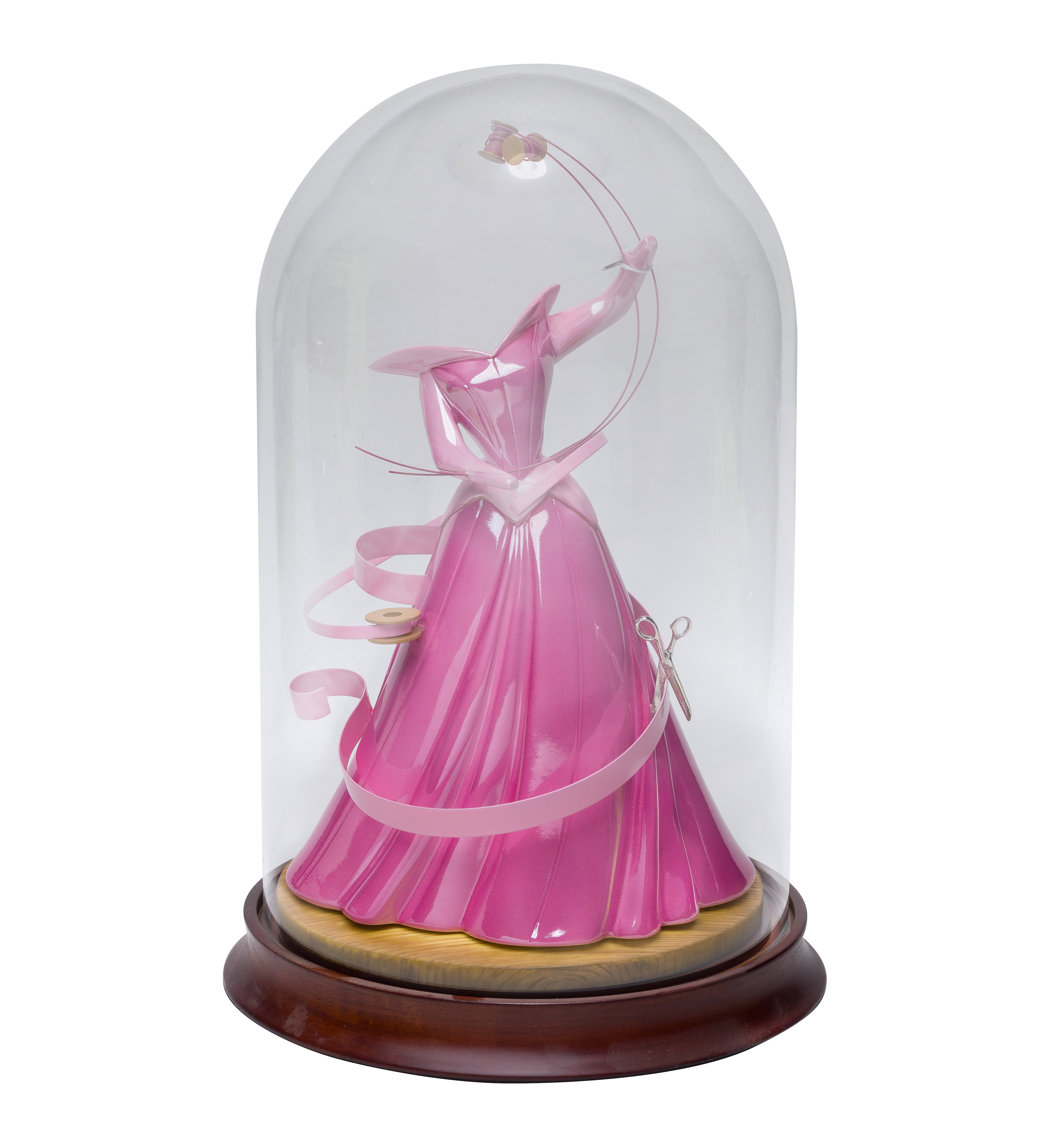 ‘Sleeping Beauty’ 40th Anniversary Limited Edition Princess Aurora’s opalescent porcelain pink dress having floating spools and scissors, #3001/5000, including glass dome display case, marked on the underside