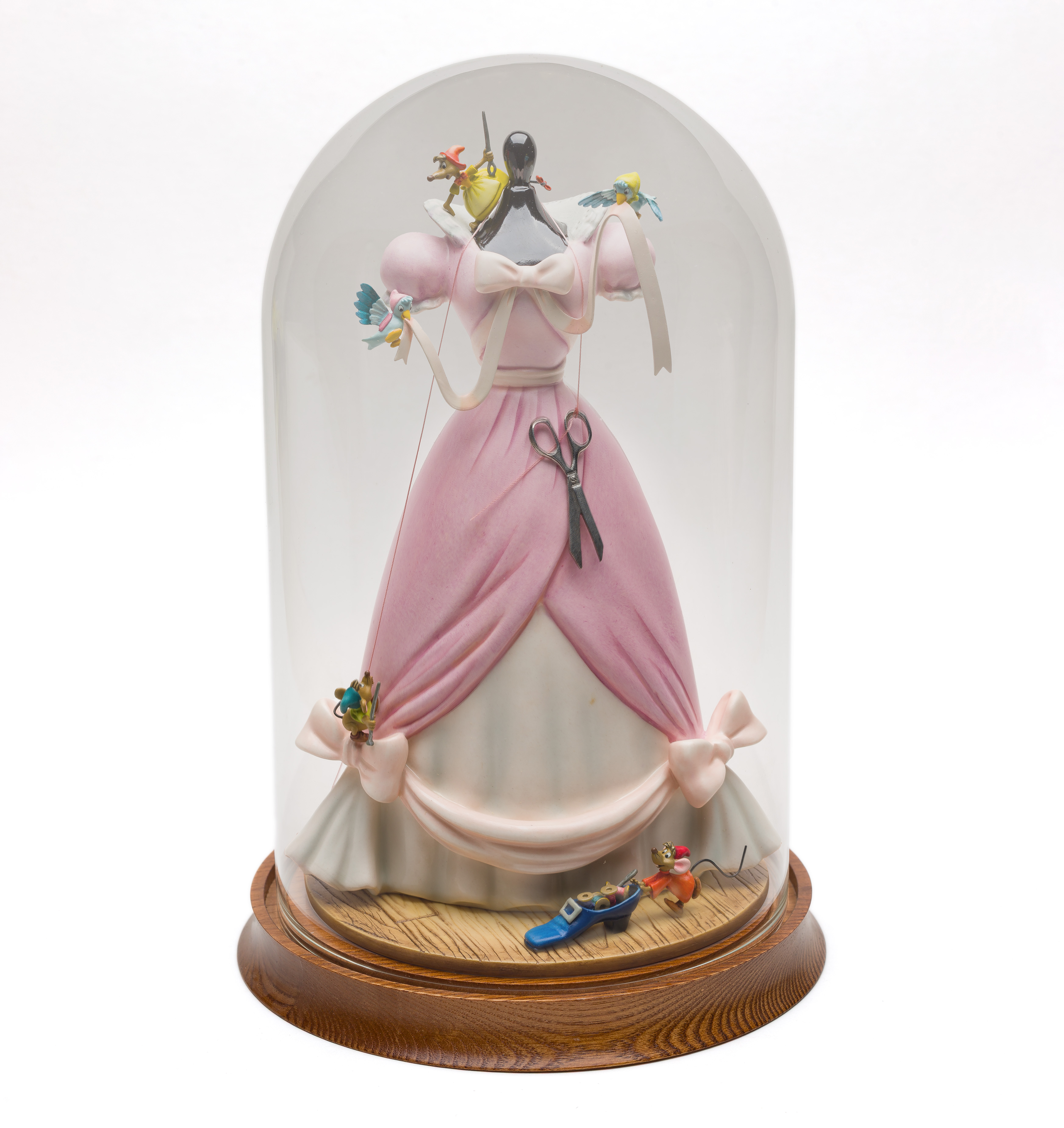 A limited edition porcelain Cinderella’s pink dress being tailored by birds and mice, #4229/5000, showcasing intricate detailing, including glass dome display case, marked on the underside