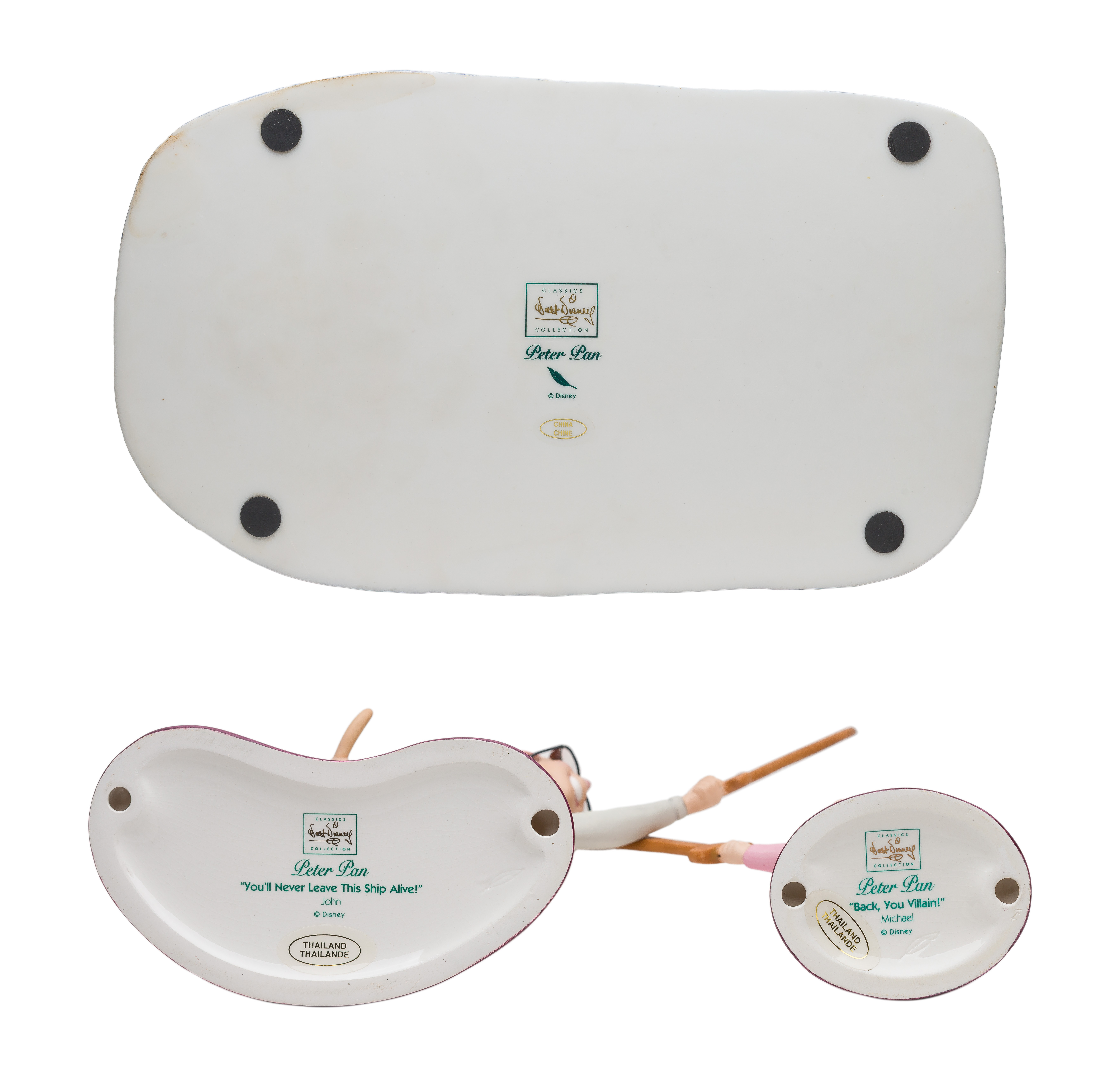 A 3-piece porcelain set including ‘Back, You Villain’ Michael and ‘You’ll Never Leave This Ship Alive’ John, depicting a sword fight on a bed base, marked on underside