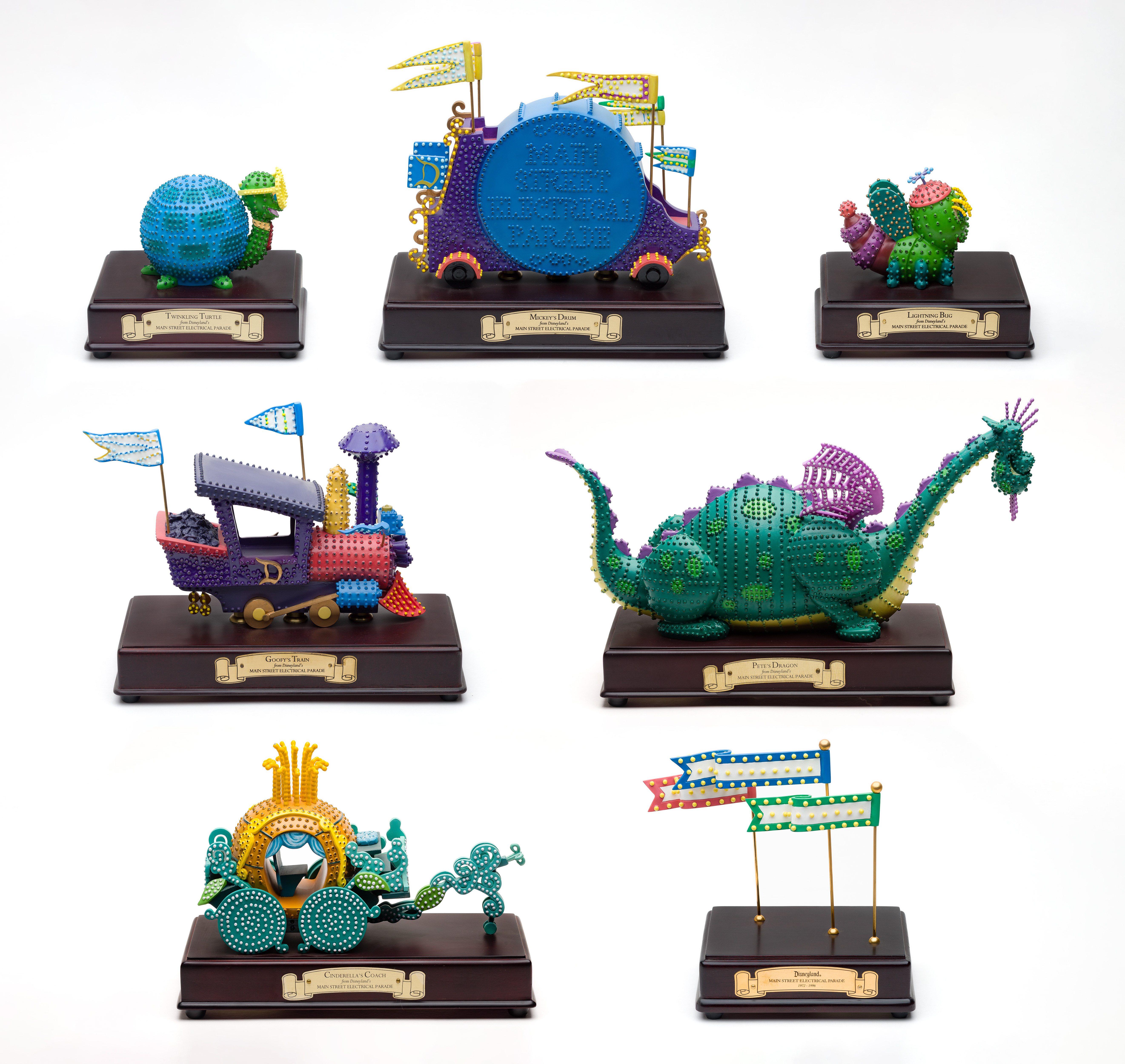 (7) porcelain items including Cinderella’s Carriage, Pete the Dragon, Goofy’s Train and other pieces, all on wood bases having title placard, all marked on underside, all battery operated light-up figures