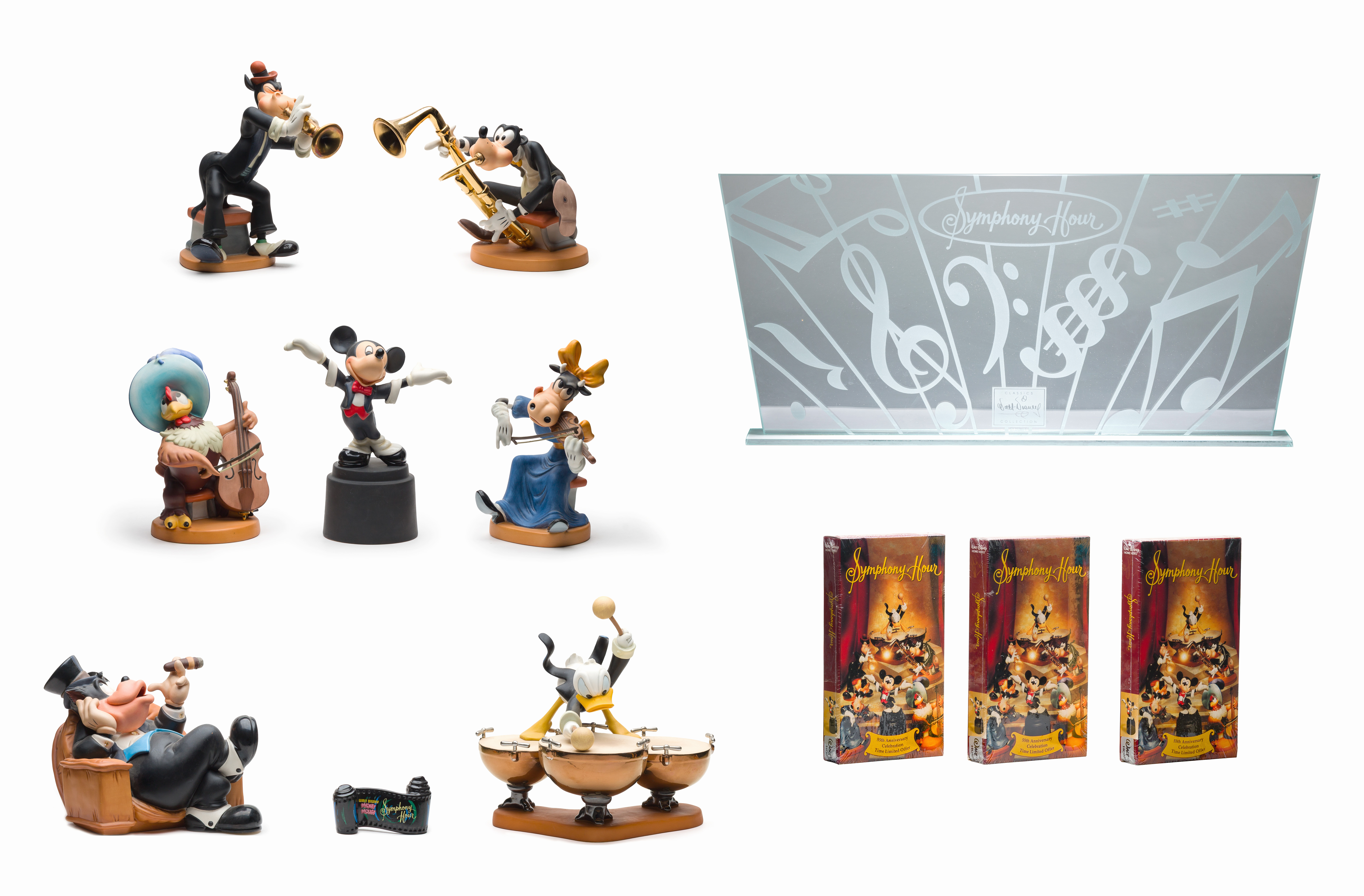 (12) porcelain items including Maestro Michael Mouse, Horace ‘Horace’s High Notes’, Goofy ‘Goofy’s Graces Notes’, Clara Cluck ‘Bravo Bravissimo’, Clarabelle ‘Clarabelle’s Crescendo’, Donald Duck ‘Donald’s Drum Beat’, Sylvester Macaroni sitting and listening, opening title plaque, an etched glass backdrop and (3) sealed VHS video tapes, all marked on underside