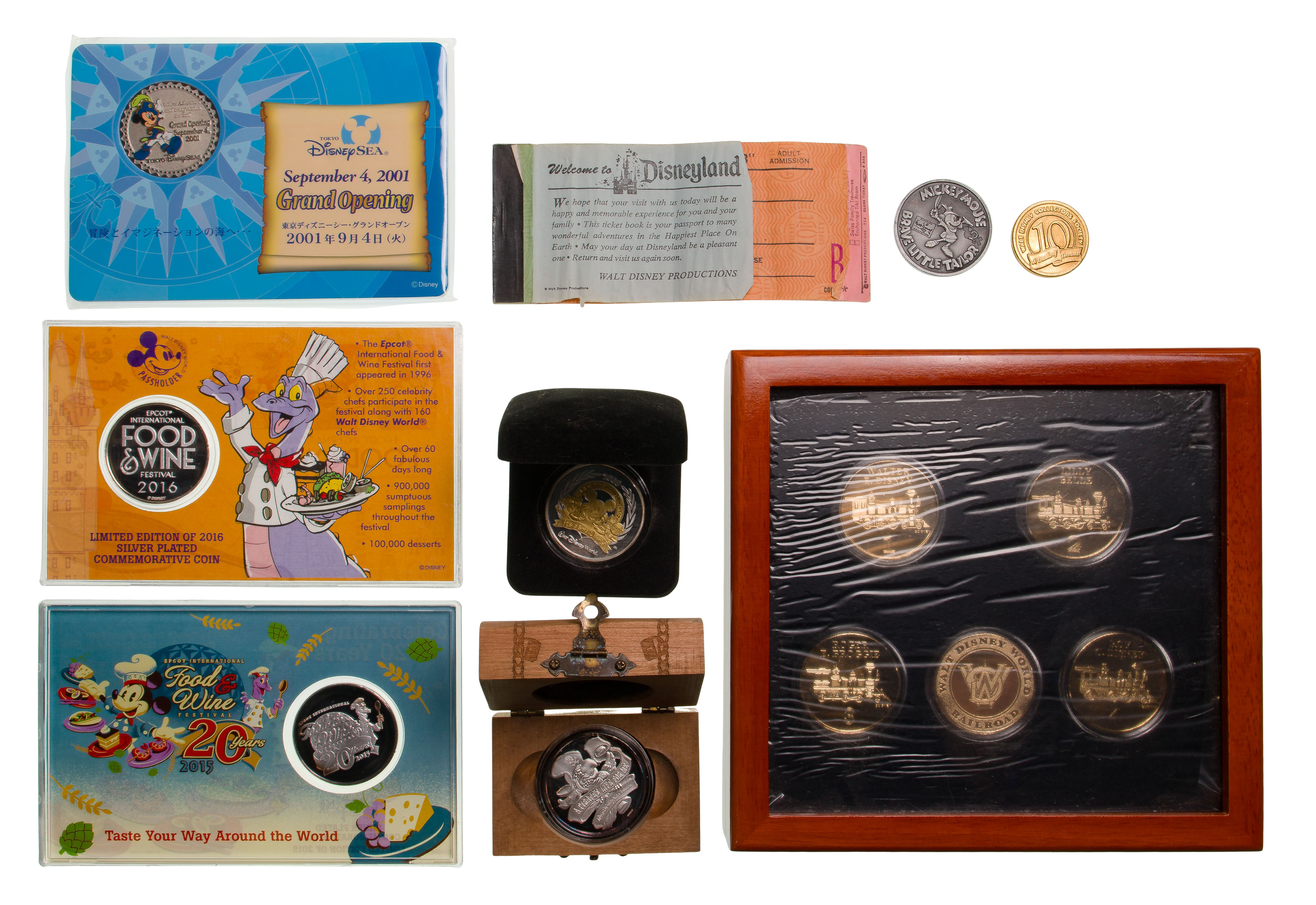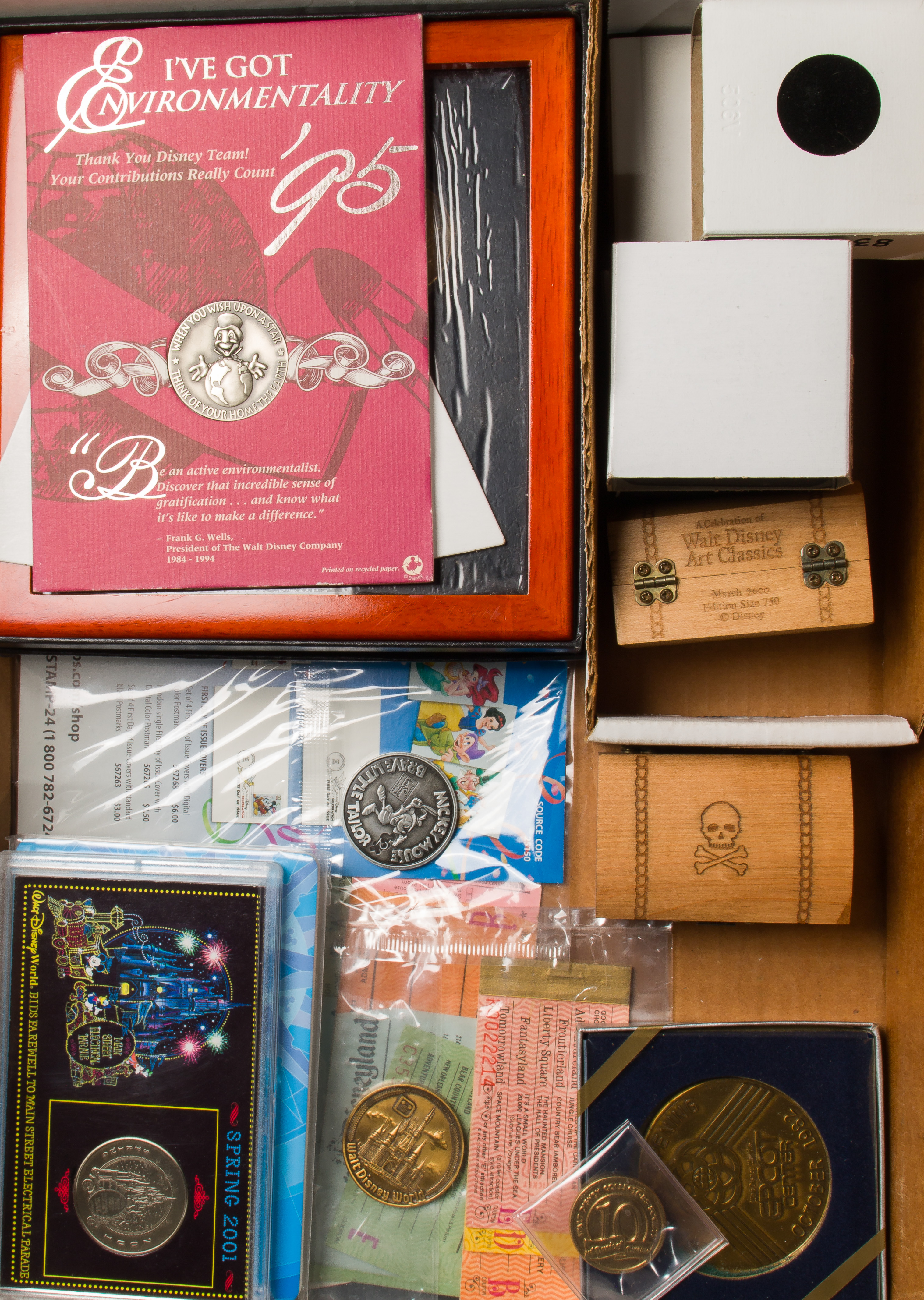 (19) total items including (7) fine silver medallions including four ‘Happiest Celebration on Earth’, two ‘A Pirates Life for Me’ and ‘Its a Small World’ (marked 0.999 fine silver) in original boxes, a boxed set of (4) Disney Railroads as well as other celebrations; together with postcards and ticket books