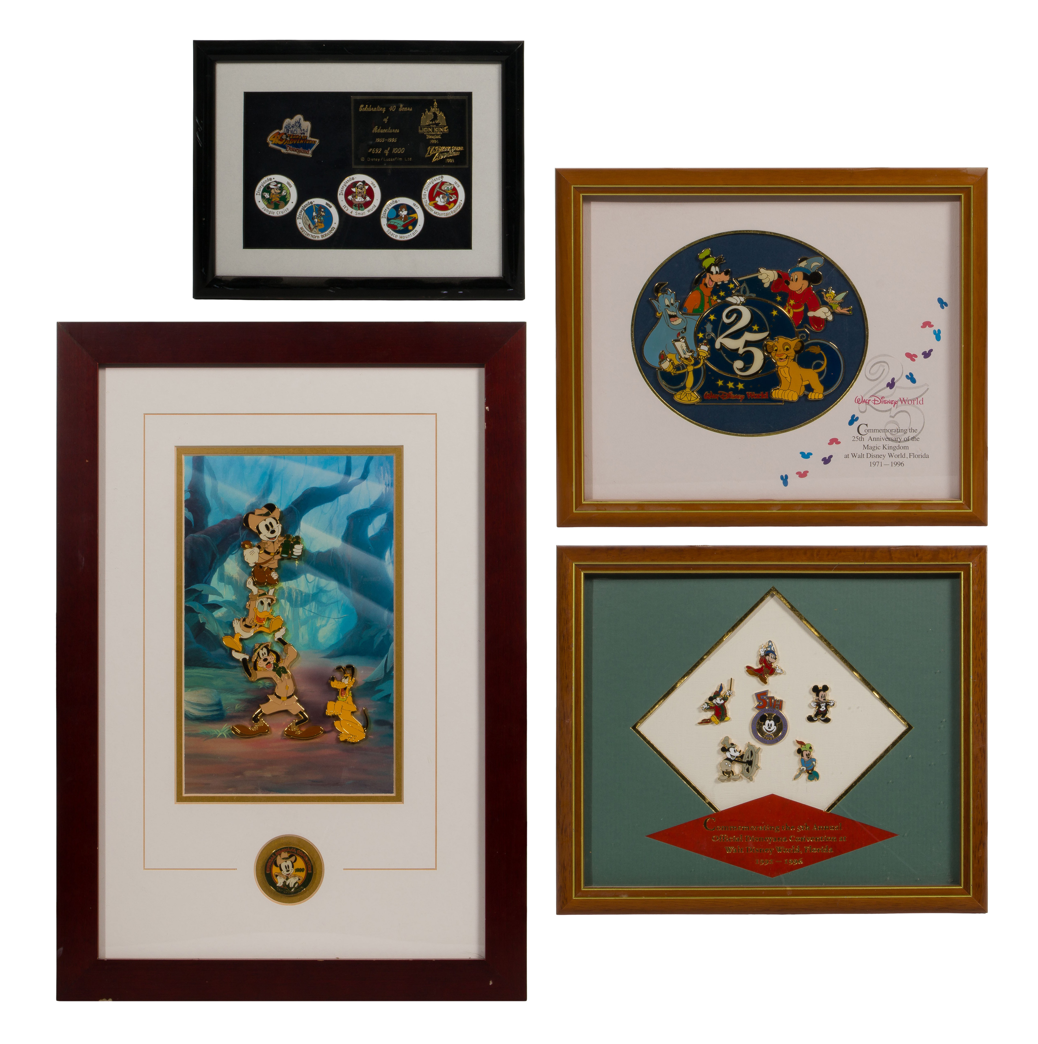 (4) items including ‘Magic Kingdom 25th Year’ having six puzzle pins, ’40 Years of Adventure’ having six pins, ‘5th Annual Disneyana’ having six pins and ‘1999 Disneyana’ having five pins, all matted under acrylic in wood frames